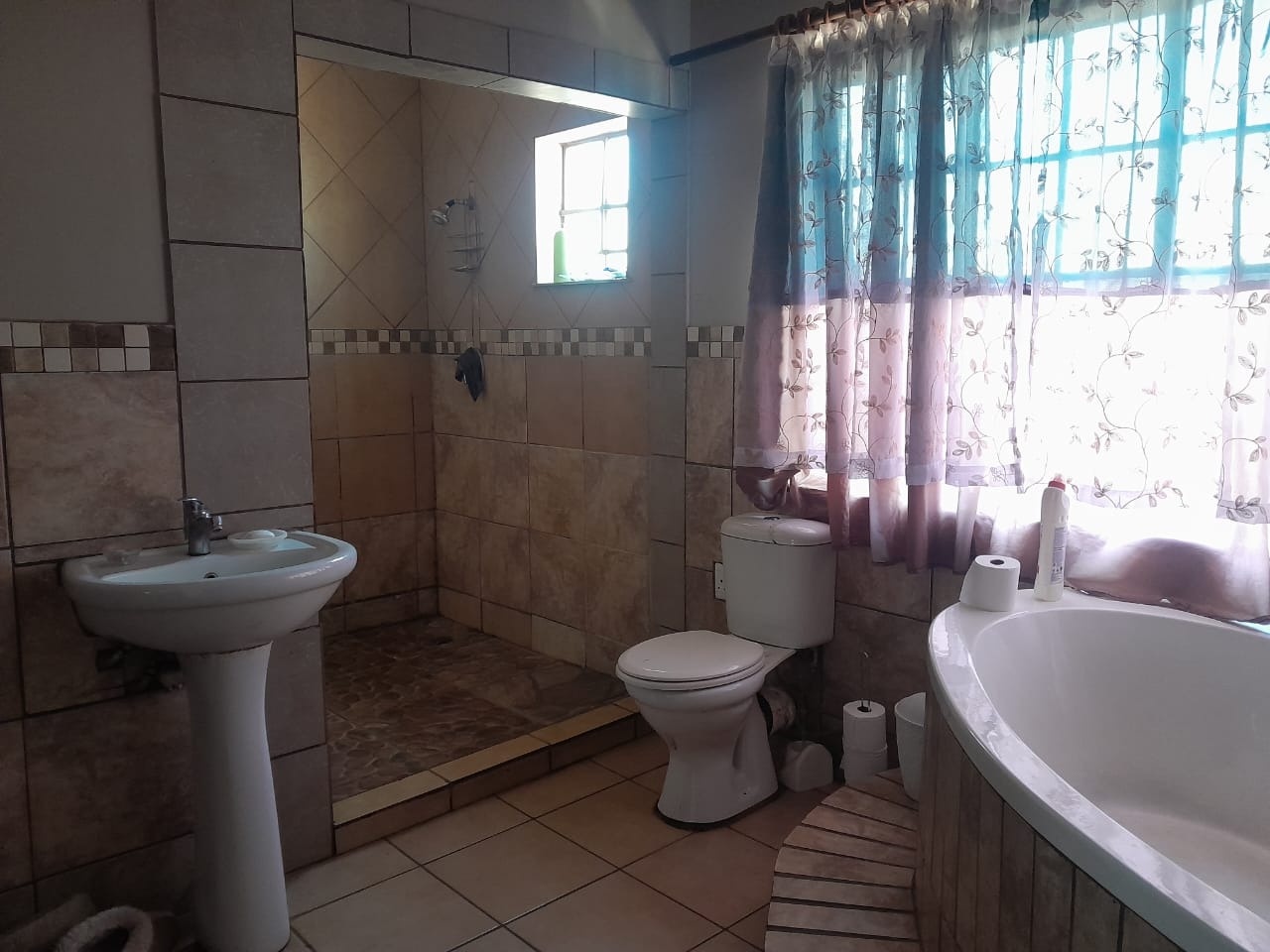 Main bedroom with ensuite bathroom - spacious, tiled, built in cupboards, view of the khoi pond