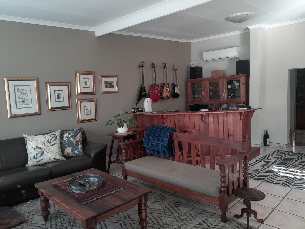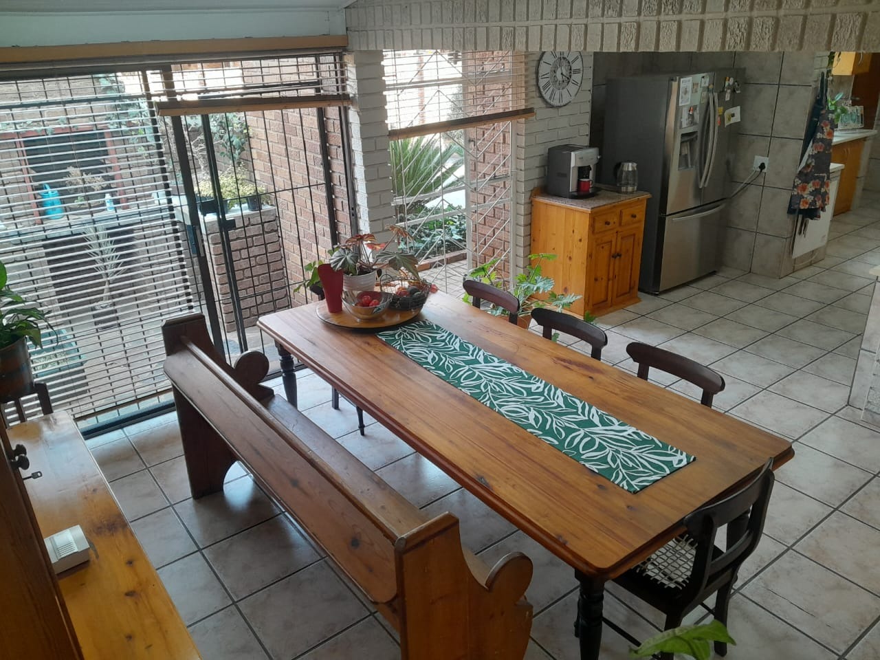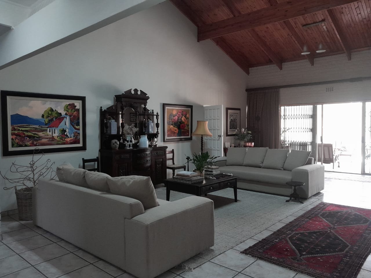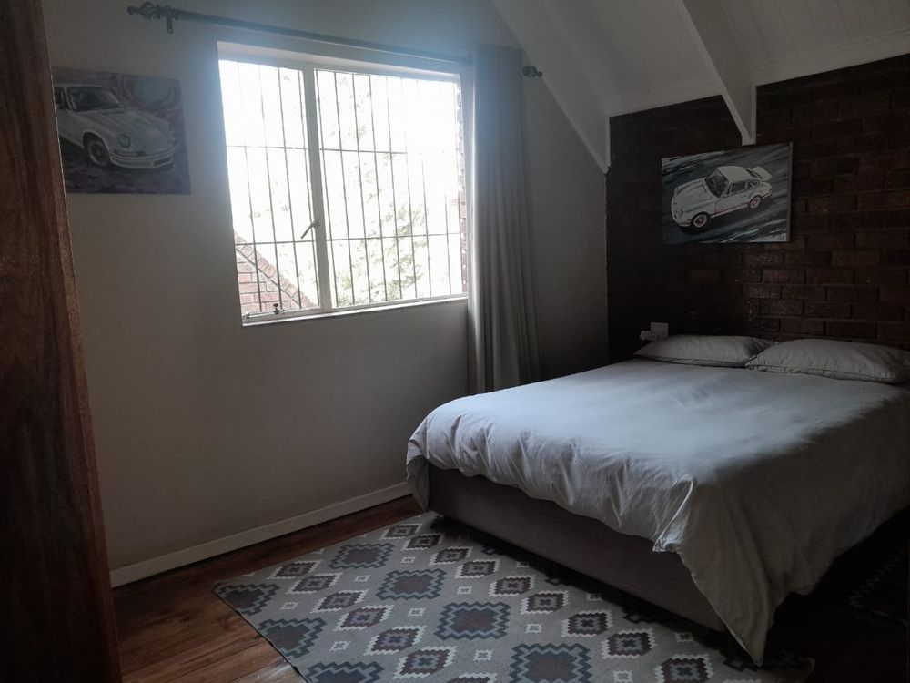 The lounge is truly wow — open, airy, and inviting, with high pine ceilings and a sliding door leading to a large patio with a built-in braai. Step outside to enjoy the sparkling swimming pool, ideal for relaxed family weekends or entertaining friends.