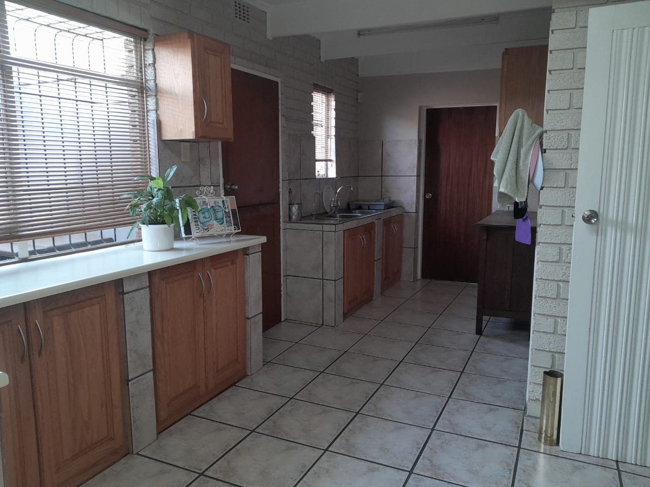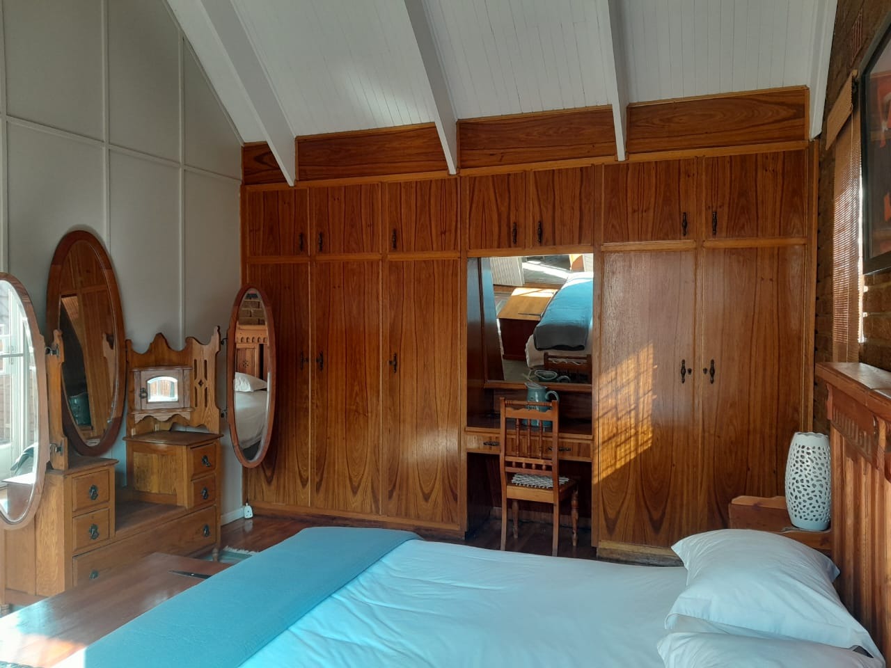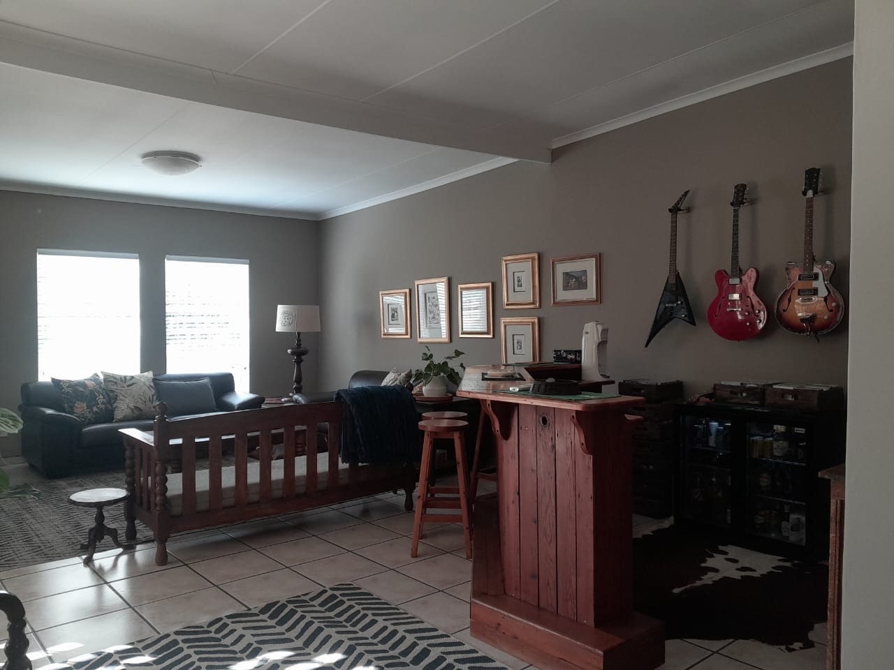 The lounge is truly wow — open, airy, and inviting, with high pine ceilings and a sliding door leading to a large patio with a built-in braai. Step outside to enjoy the sparkling swimming pool, ideal for relaxed family weekends or entertaining friends.