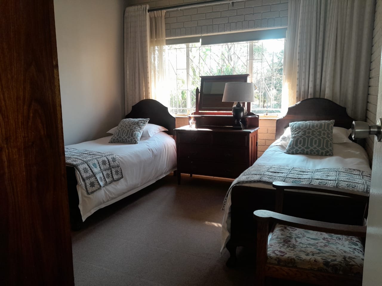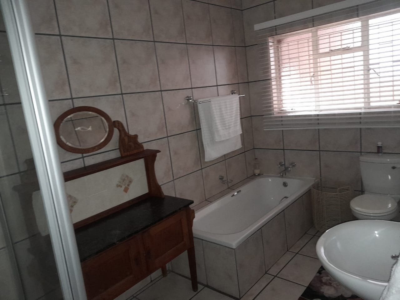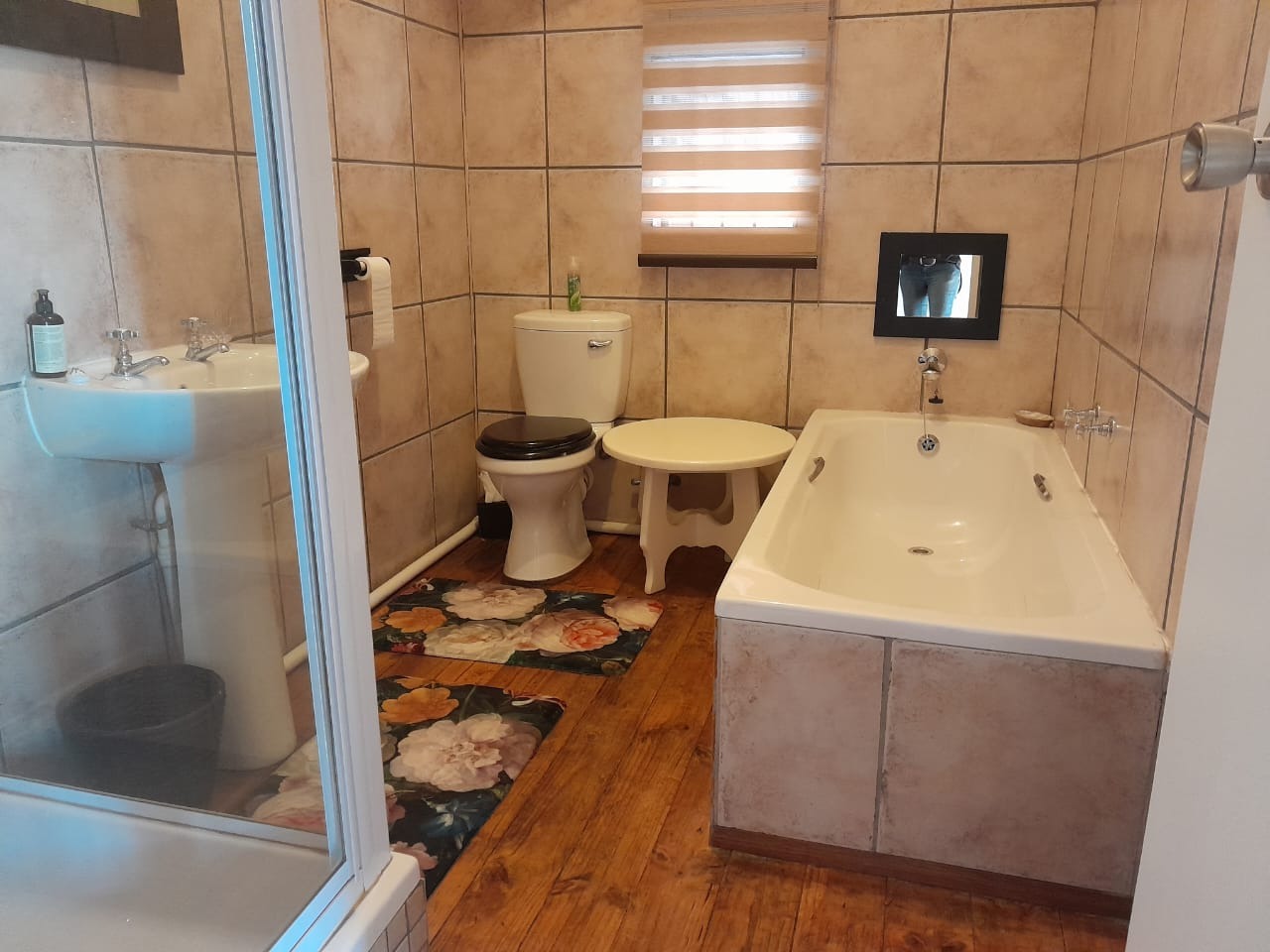 Downstairs features three bedrooms and three bathrooms, including one ensuite. Upstairs, you’ll find two more spacious, air-conditioned bedrooms with wooden floors and built-in cupboards, plus a full bathroom.