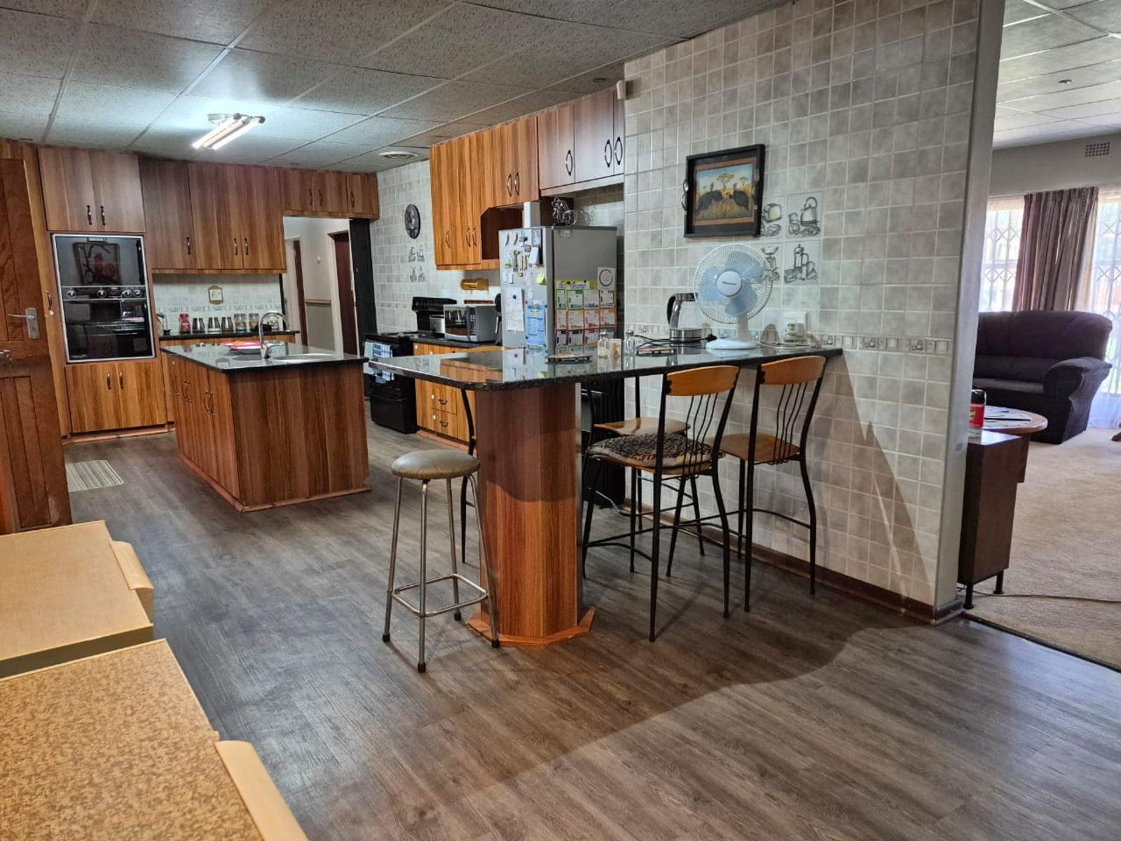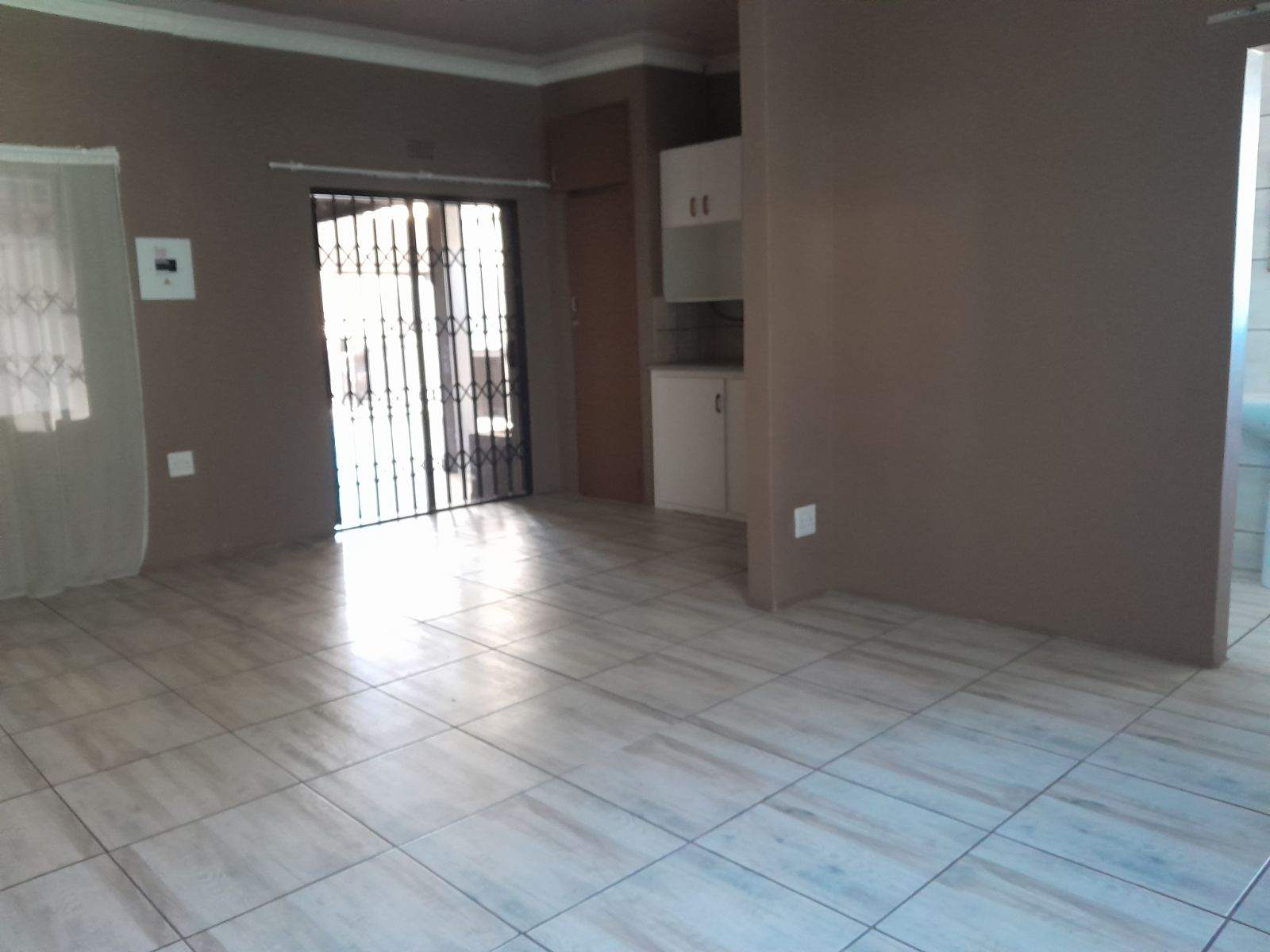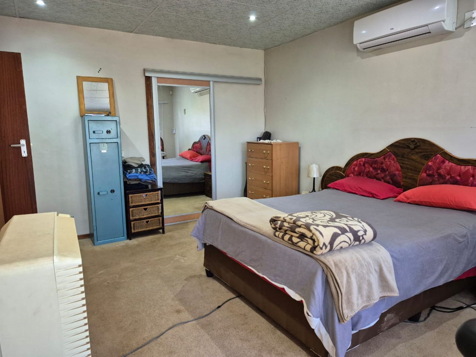 The spacious open-plan lounge is warm and inviting, featuring soft carpeting, an air-conditioning unit, and an abundance of natural light. Large windows fitted with burglar bars provide peace of mind without compromising on brightness or comfort.