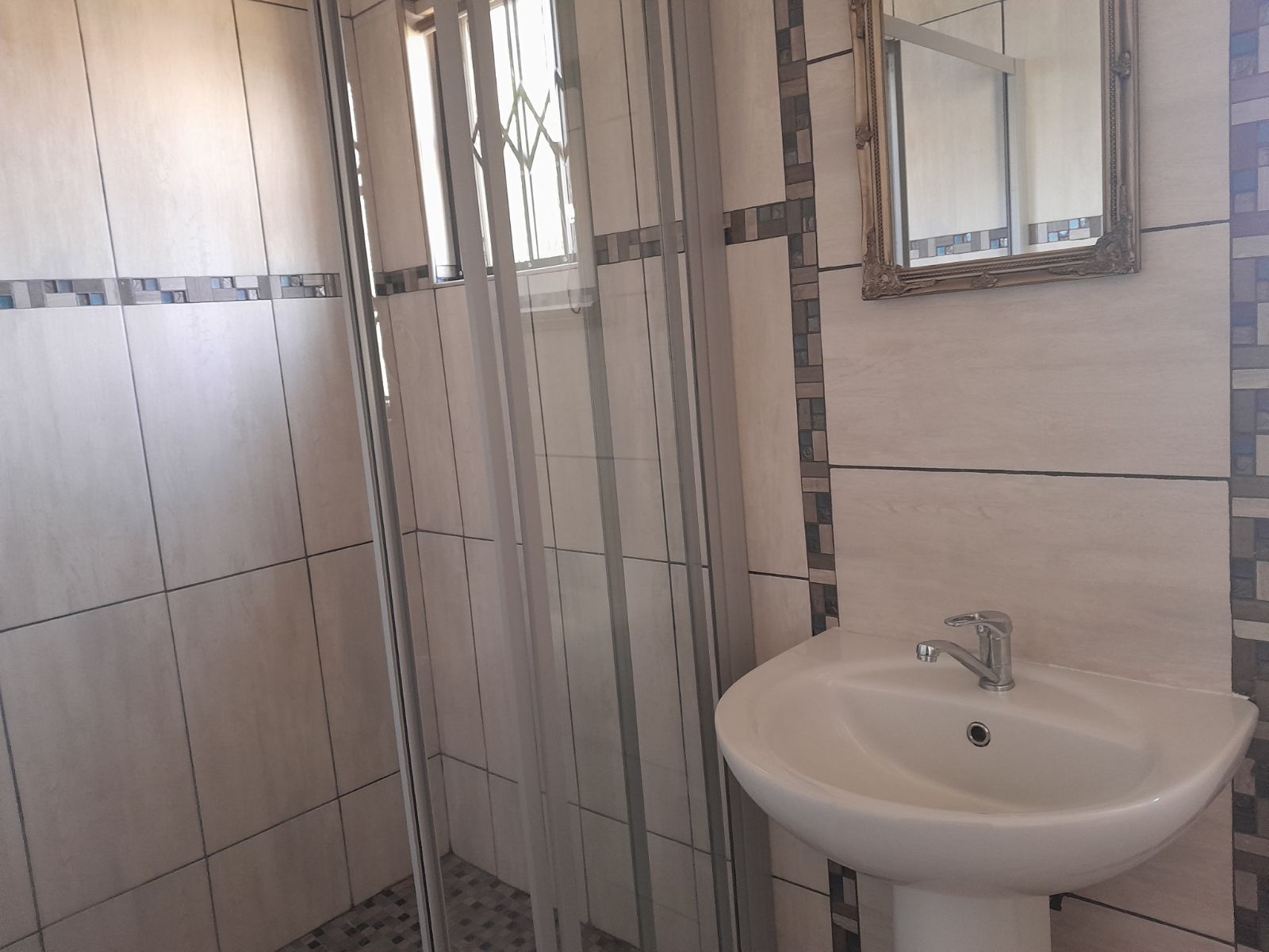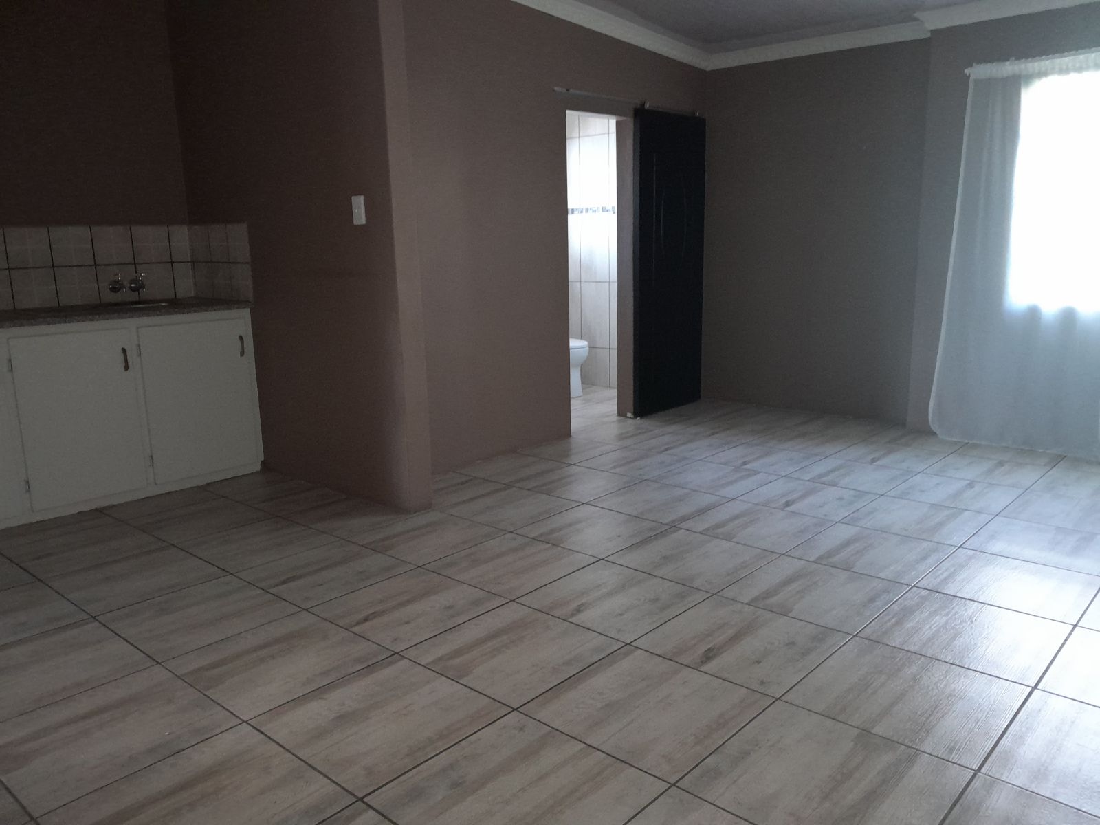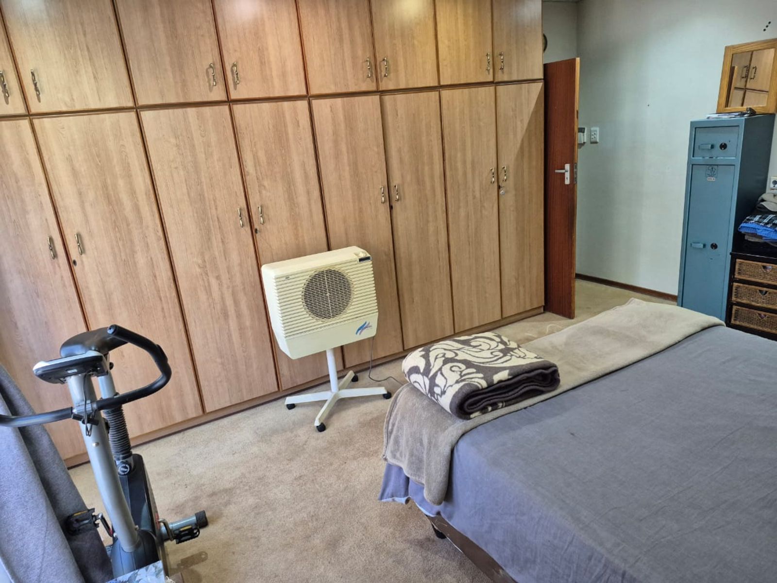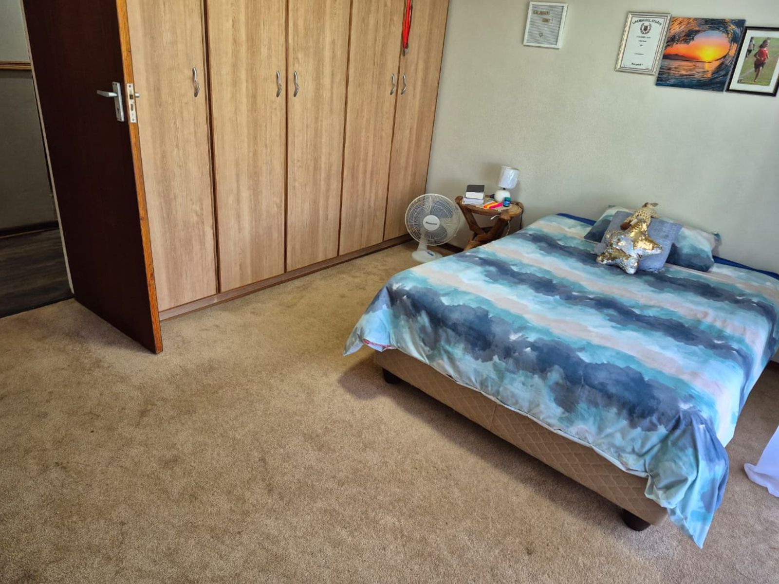 The spacious open-plan lounge is warm and inviting, featuring soft carpeting, an air-conditioning unit, and an abundance of natural light. Large windows fitted with burglar bars provide peace of mind without compromising on brightness or comfort.