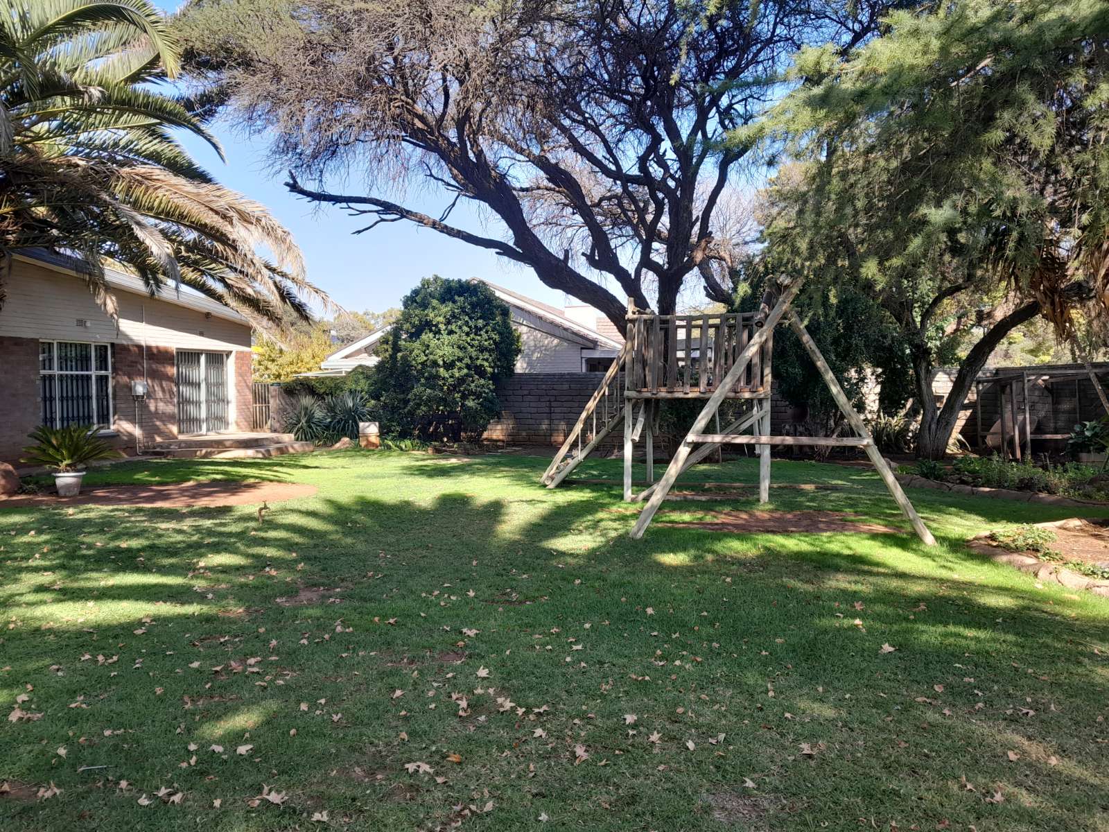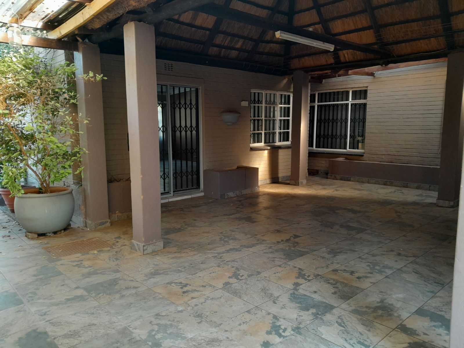 Outdoors, the fully enclosed corner stand provides a spacious, pet-friendly yard with palisade fencing, ideal for children to play safely. Additional features include a thatched lapa with built-in braai, a bachelor flat with kitchenette and bathroom for guests or extra income, a borehole, JoJo tank, and an irrigation system.