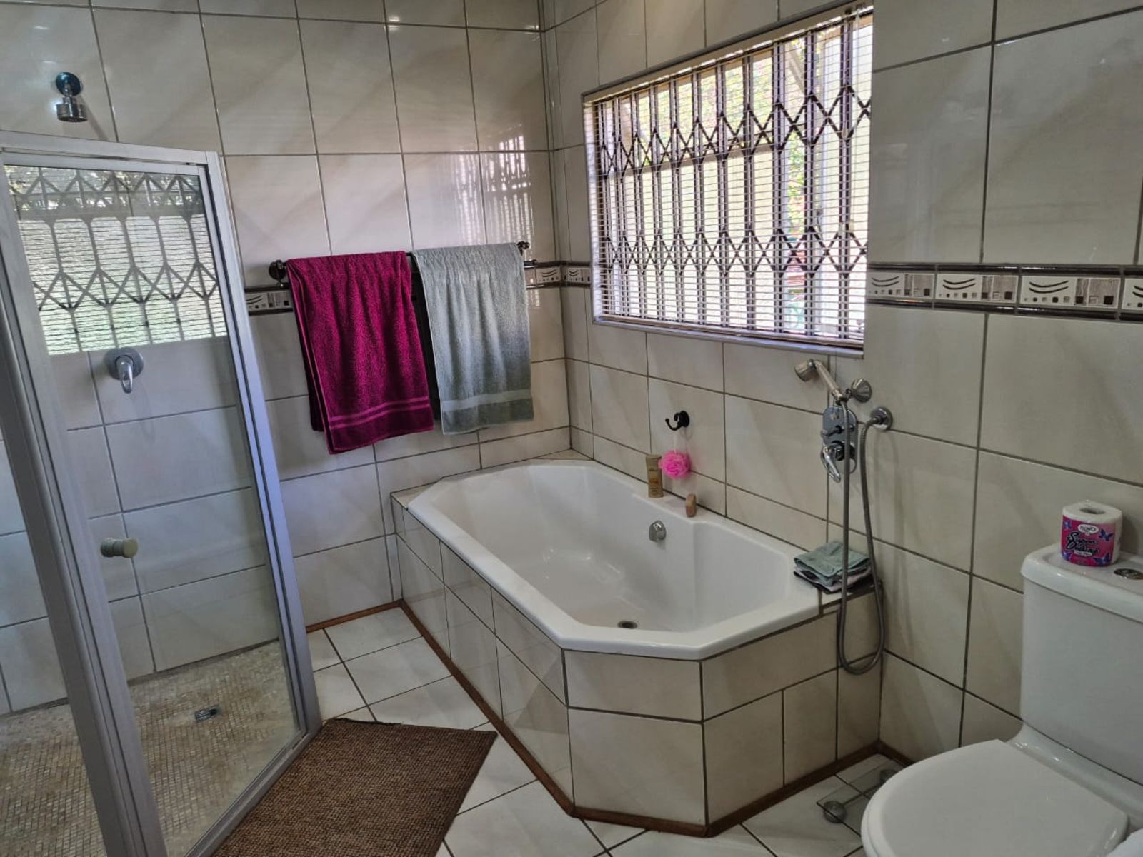 Accommodation consists of three carpeted bedrooms, all fitted with built-in cupboards. The family bathroom is full and well-appointed. The main bedroom is a private retreat with sliding doors secured by a safety gate and a full en-suite bathroom featuring a bath and double shower.