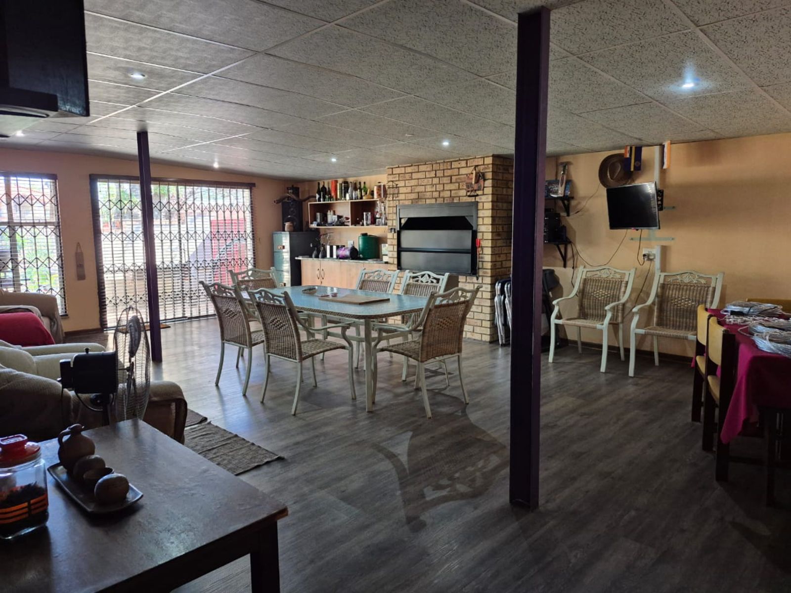 Flowing seamlessly from the living area is a versatile braai room that doubles as a dining space. Finished with laminated flooring and air-conditioning, it includes a built-in braai, basin with cupboards, and sliding doors fitted with a safety gate—perfect for relaxed family meals and entertaining year-round.