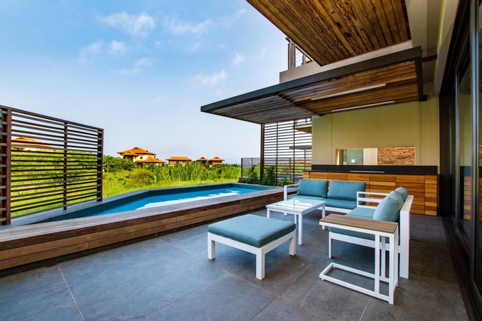 Resort-style coastal living in Oceans Edge, Zimbali Coastal Estate with private pool, built-in braai and ocean-view balconies. Fully furnished four-bedroom, three-bath home with two parking bays.