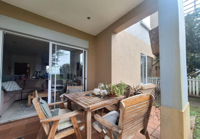 Relaxed estate living near beaches and King Shaka Airport in Sheffield Manor — open-plan living flows to a covered patio and private garden with dam views. 2 bed, 2 bath.