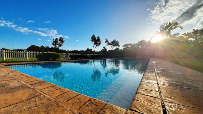 Year-round holiday living on Sheffield Beach, Dolphin Coast KZN, with a private patio and garden opening from spacious kitchen/living. One-bedroom en-suite; resort-style pool, clubhouse, catch-and-release dam.