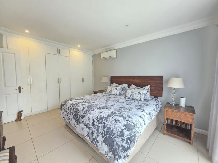 Tuscan fairway retreat in Umhlali Golf Estate, footsteps from the clubhouse — expansive landscaped garden with palm-ringed pool, balcony views, golf-cart parking, three pet-friendly bedrooms.