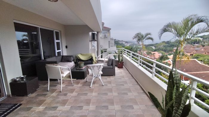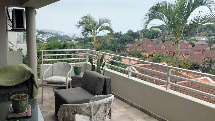 Relaxed coastal living in Ballito with leafy garden views from a spacious undercover balcony; open-plan living and granite kitchen, three bedrooms, two bathrooms and lock-up garage.