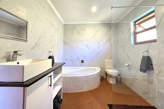 Embrace relaxed mountain living in Champagne Valley, Central Drakensberg — landscaped indigenous gardens, verandas and a flowing river into a rock pool; sleeps 18 in six bedrooms, five baths.