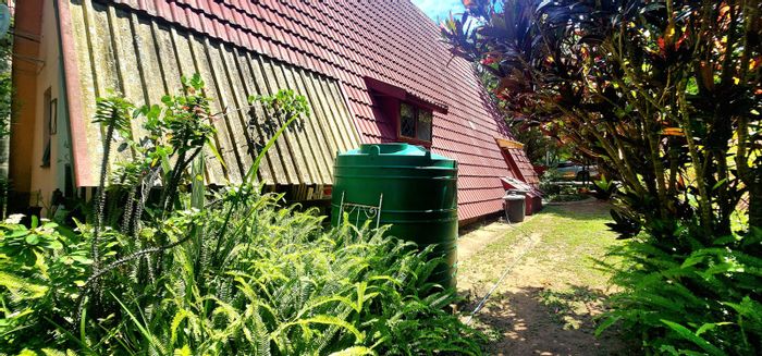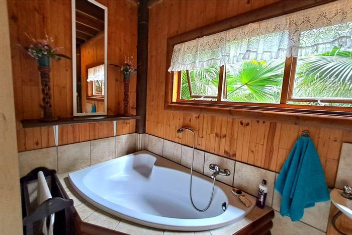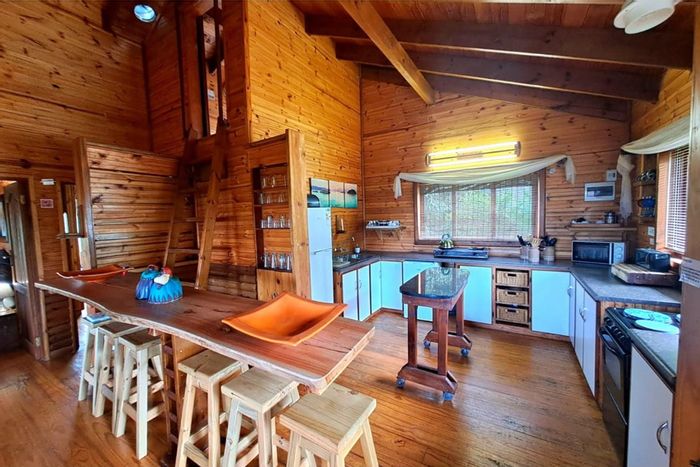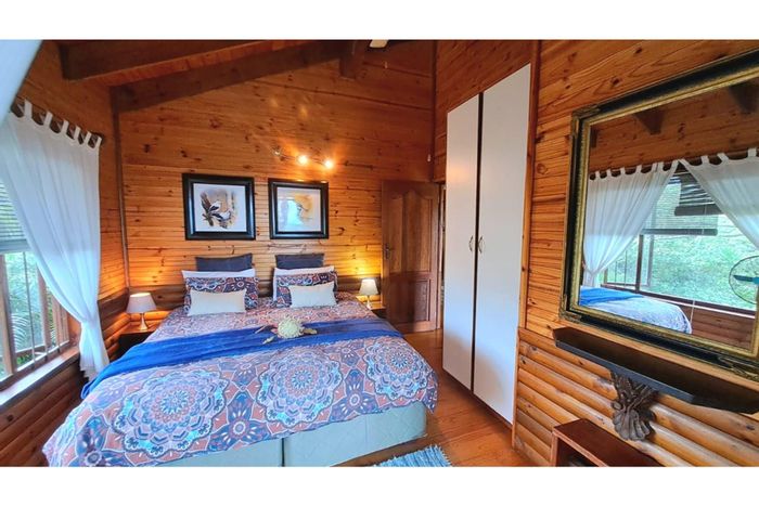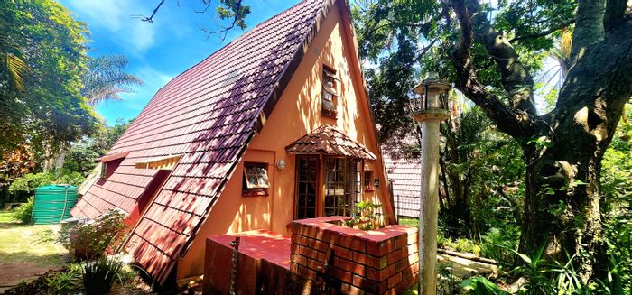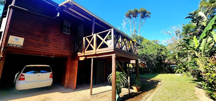 Relaxed coastal living minutes from Hibberdene village and blue-flag beach, in a secure estate; quaint log home with pool and lapa, sunny deck and three bedrooms, two bathrooms.