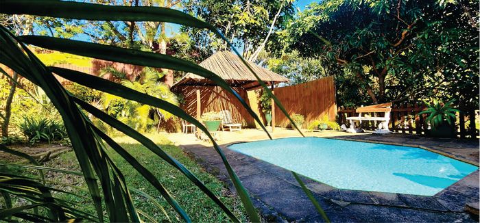 Relaxed coastal living in Hibberdene, 1km from the Blue Flag beach and village — entertainer's garden with pool, deck and secluded braai beneath mature trees; three beds, two baths, double garage.