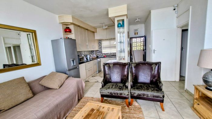 Seaside escape in Hibberdene offering sun-filled open-plan living and ocean views, fully furnished with modern kitchen, communal pool and beach access, two bedrooms, one bathroom, garage.
