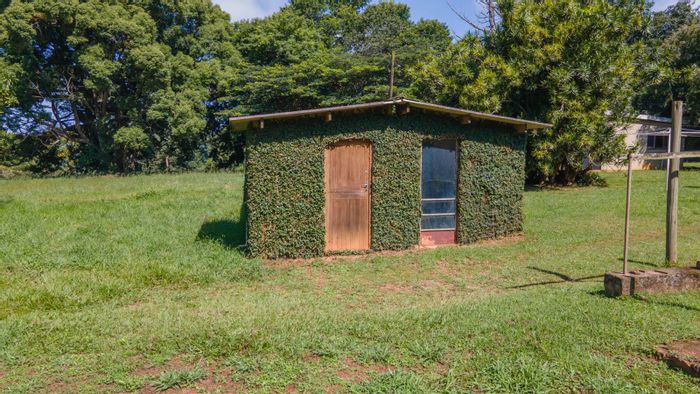 Private Kloof retreat on the Upper Highway — pancake-flat panhandle plot ready to build, no levies, with a bird aviary doubling as practical storage for materials.