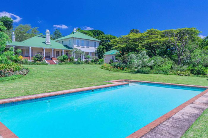 Lodge-style retreat in Maytime/Kloof Golf Course SRA, set among mist-belt gardens with a koi-pond entrance and timber interiors—three en-suite bedrooms, double garage, dual-living wing.