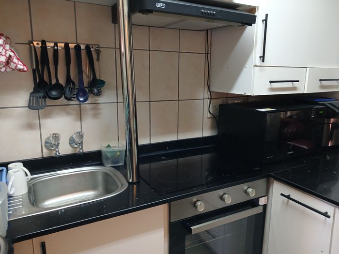 Resort-style ground-floor living with pool and tennis-court views, plus communal built-in braais. Fully furnished two-bedroom, one-bath unit with undercover and open parking, borehole water and 24hr security.