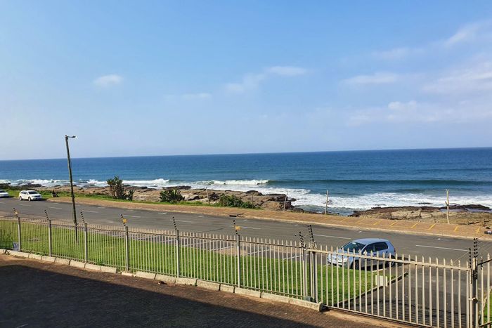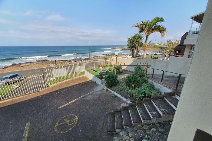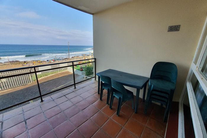 Beachside income opportunity with sweeping 180° sea views from a braai-equipped balcony, just 50m from Uvongo Beach. Fully furnished, wheelchair-friendly two-bedroom unit with covered carport.