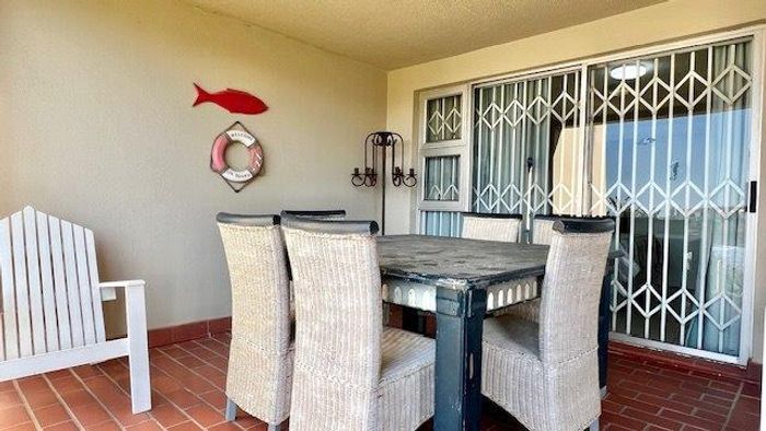 Seaside retreat in Ramsgate with direct beach access, communal pool, landscaped gardens and braai area. Open-plan living flows to enclosed patio and balcony overlooking pool—three bedrooms, two bathrooms.