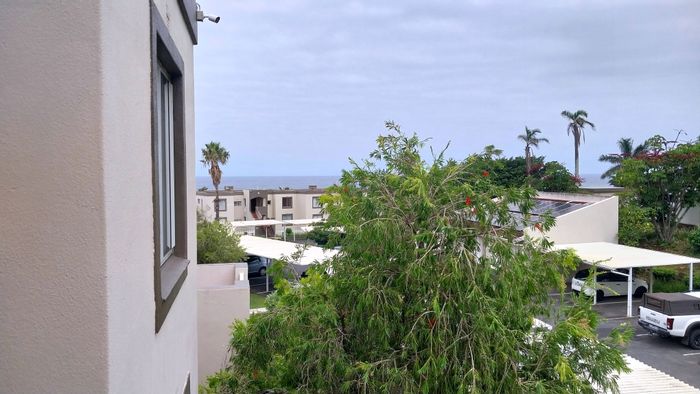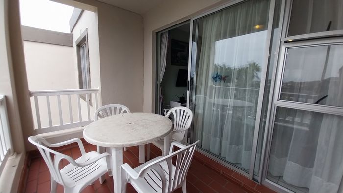 Coastal retreat in Uvongo with relaxed beachside living and partial sea views, balcony, direct beach access and communal pools; furnished two-bedroom, one-bath unit with carport.