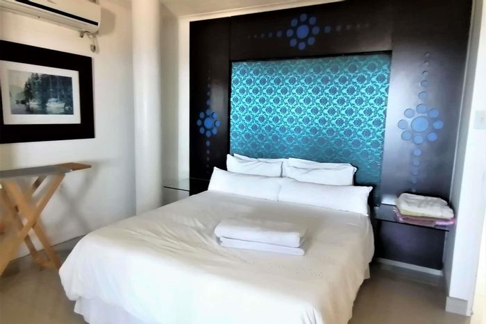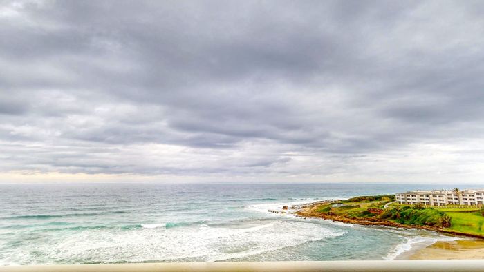 Top-floor beachfront apartment in Uvongo, three bedrooms, stunning sea views, communal pool, private rooftop terrace, sold furnished, great investment.