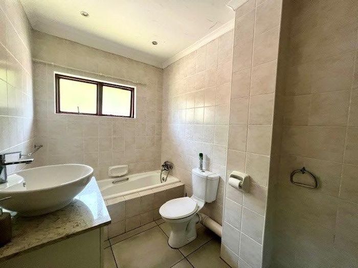 Live relaxed in a secure, sought-after complex with walking paths and dams; ground-floor unit features a large enclosed patio overlooking indigenous gardens and wildlife, four beds, two baths, double garage.