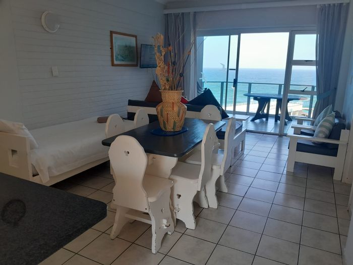Beachside living steps from Lucien Blue flag beach, with ocean and pool views, modern open-plan kitchen, communal garden and braai; two bedrooms, two bathrooms, covered parking.