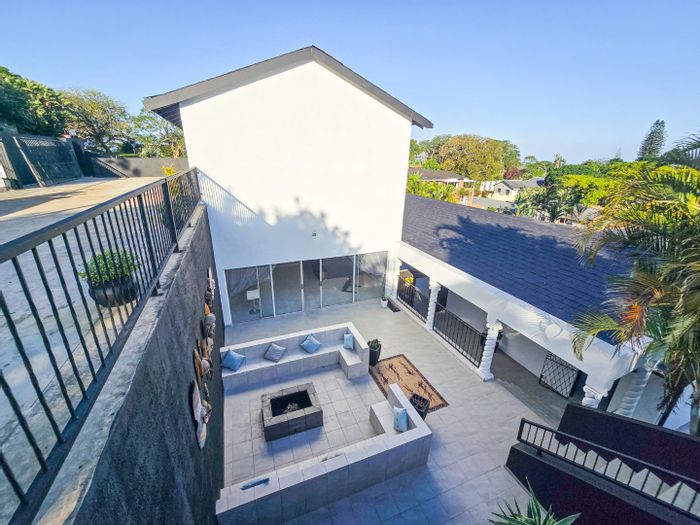 Coastal entertaining lifestyle on the South Coast — panoramic ocean views and a pool overlooking the sea, indoor braai and knotty-pine ceilings; five bedrooms and generous parking.