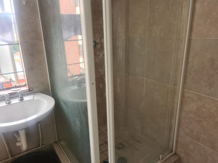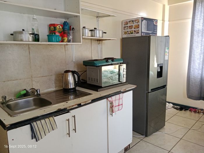 City-centre convenience for students or professionals in Pietermaritzburg Central — fifth-floor flat with open-plan kitchenette, built-in cupboards, easy-care tiling, 1 bed, 1 bath and covered parking.