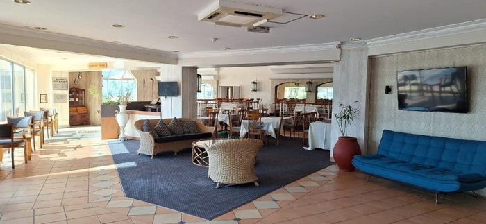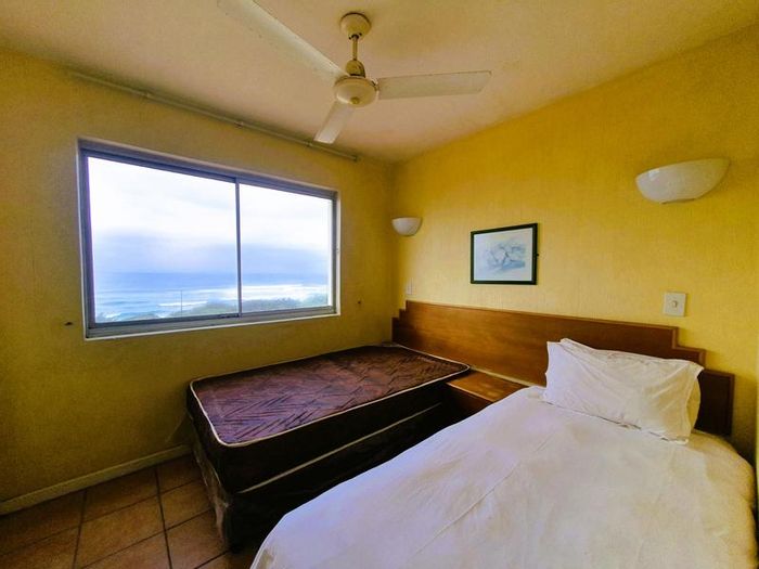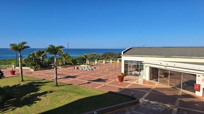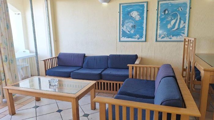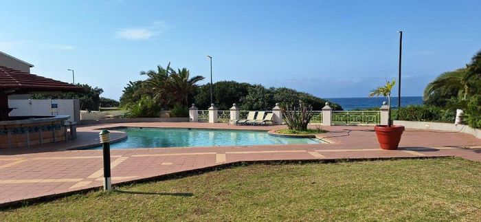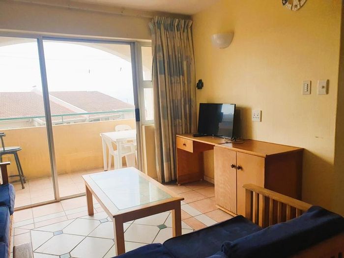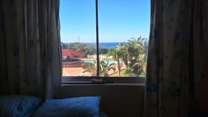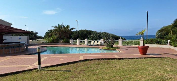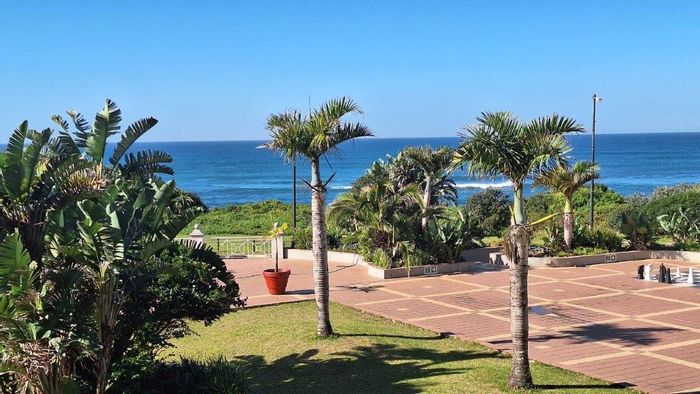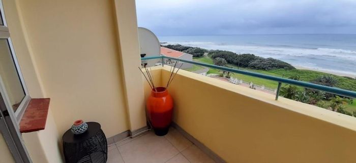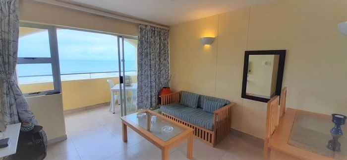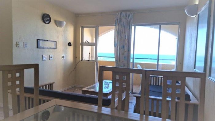 Beachfront living on Port Shepstone Beach with ocean and pool views; fully furnished corner unit opens to balcony. Communal pool, restaurant, backup generator — 3 beds, 2 baths, 2 parking.