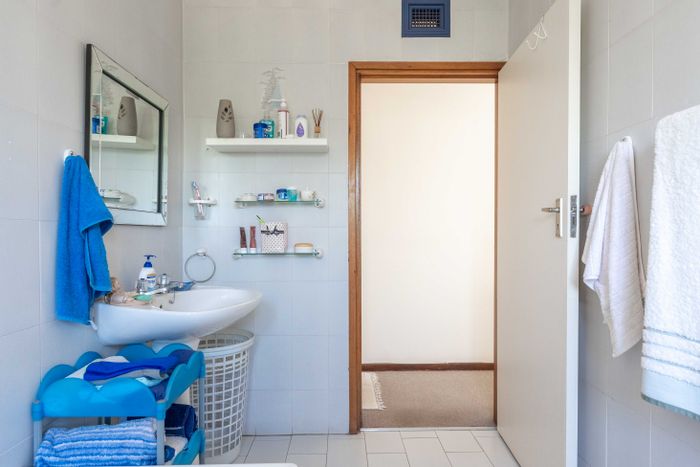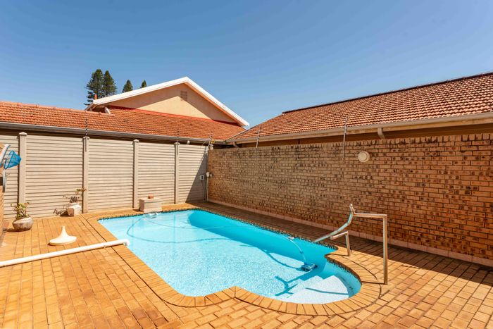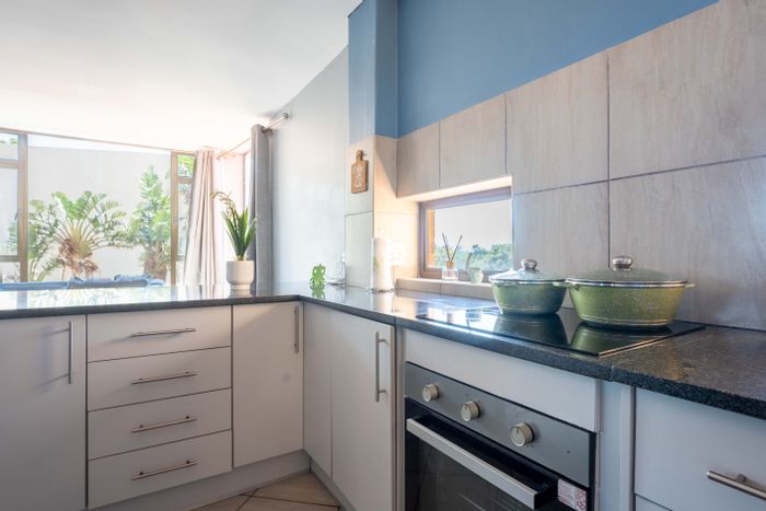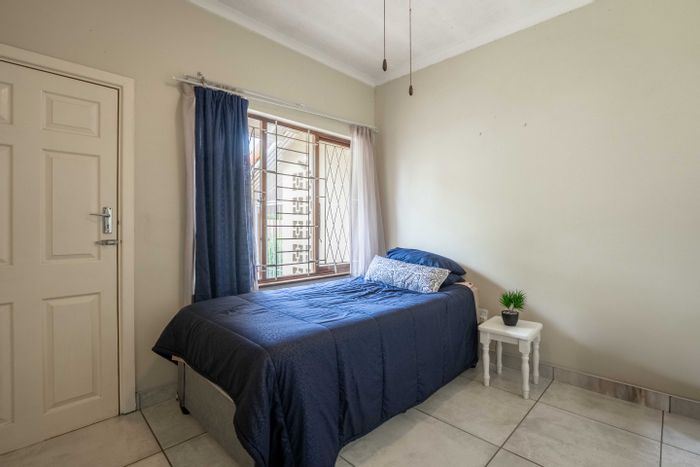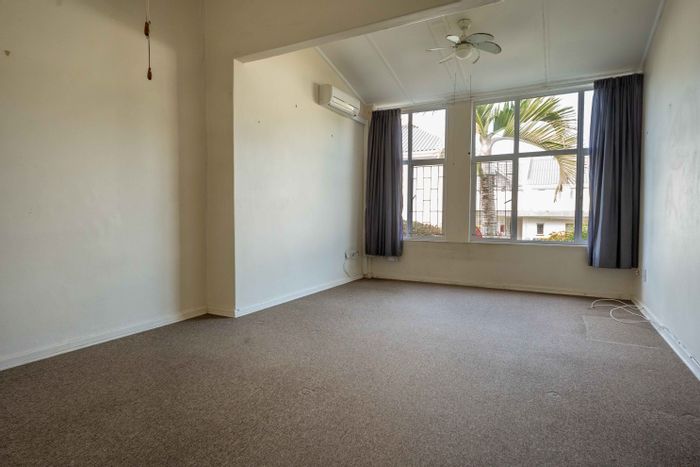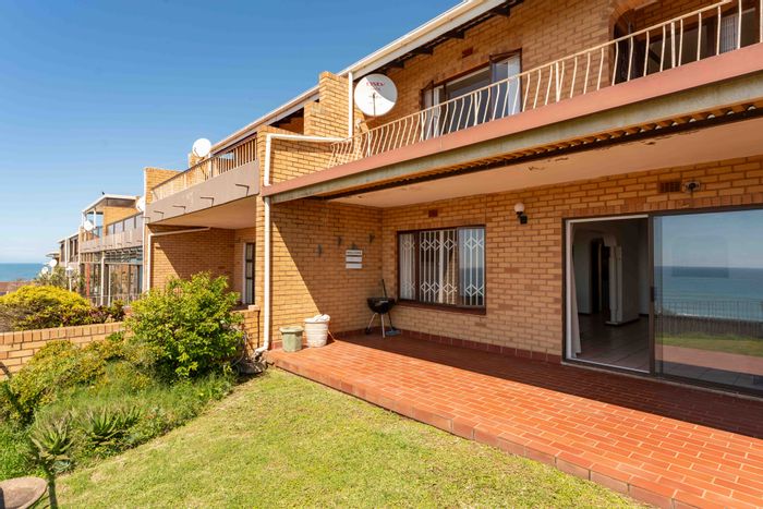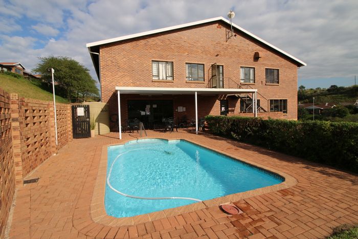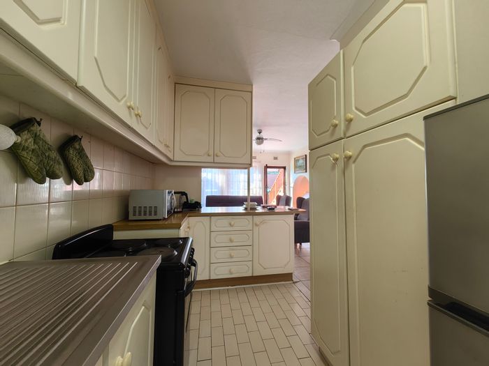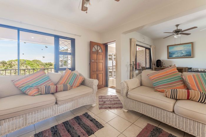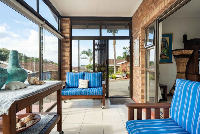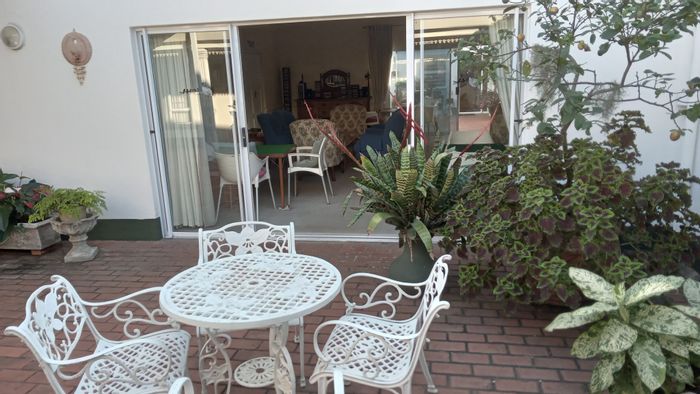 Coastal living in central Scottburgh, steps from shops and beaches, low-maintenance complex with communal pool and sea views. Two-bedroom unit opens to private patio and garden, tandem garage.