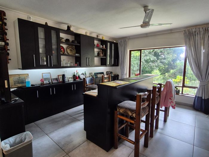 Refined coastal living in Southbroom Village — modernised level-entry face-brick home with custom bar flowing to a sunlit patio and elevated viewing deck, pool and five bedrooms.