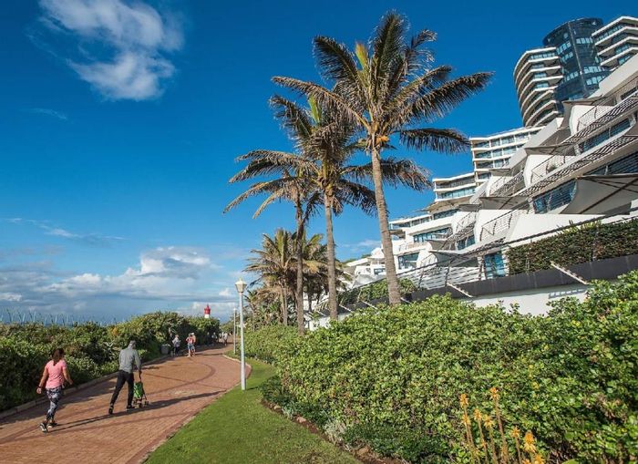 Seaside living steps from Umhlanga promenade and Pearls Mall, relax by hydrotherapeutic heated pool with Indian Ocean views; ground-floor apartment offering open-plan living, two beds, two baths, covered parking.