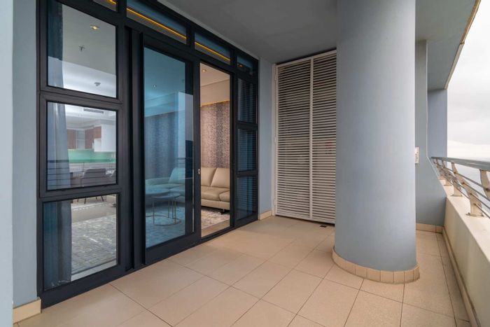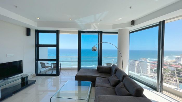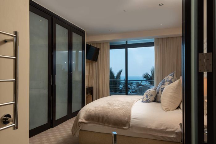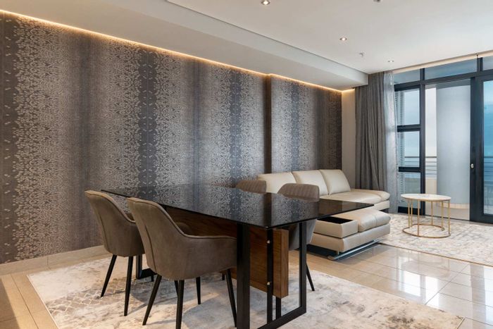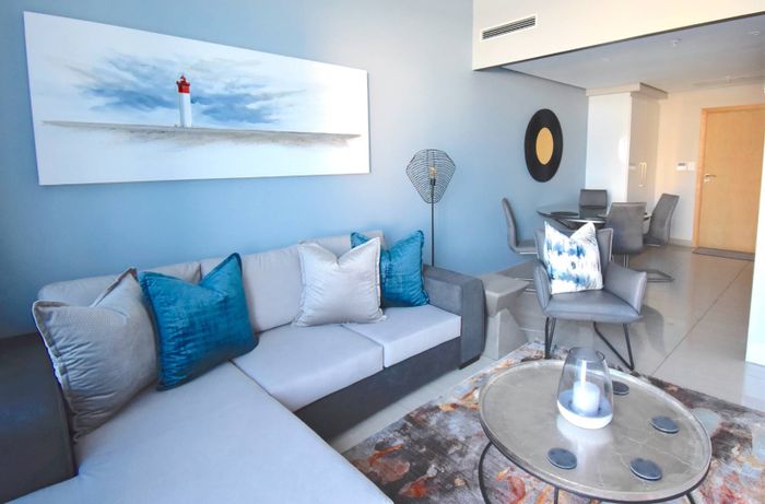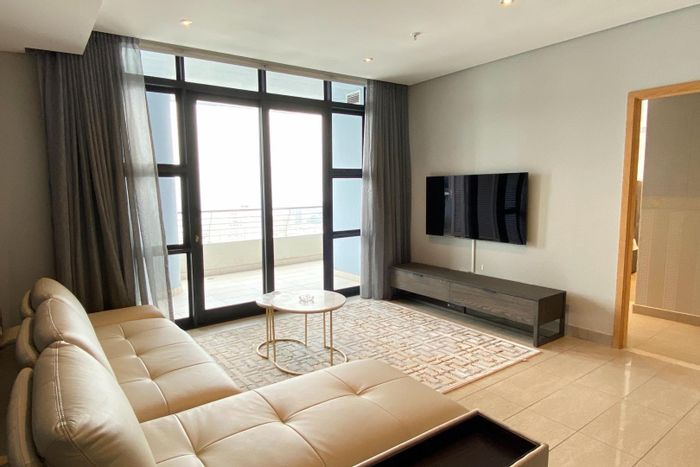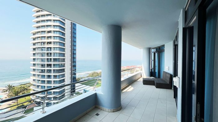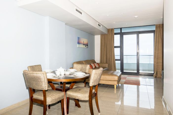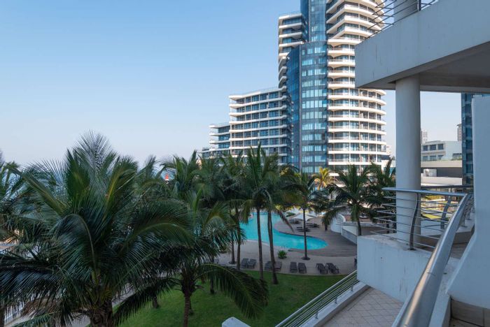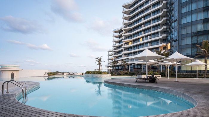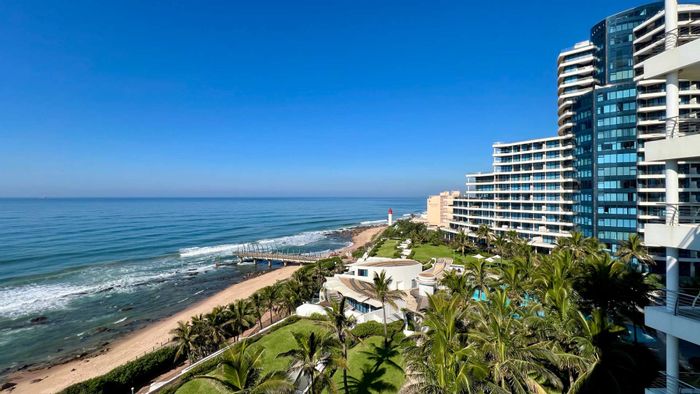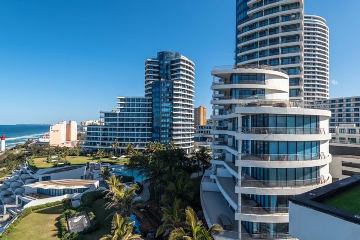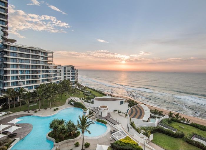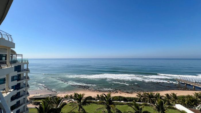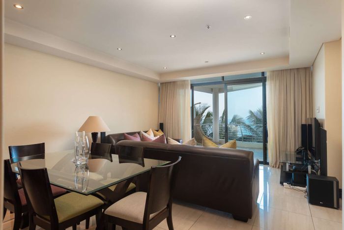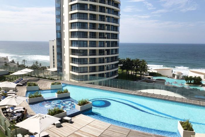Seaside concierge living in Umhlanga with direct hotel and mall access; modern furnished apartment features a 38m² balcony with sea views and pool. Two beds, two baths, covered parking.