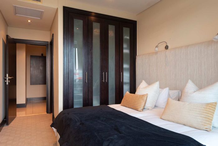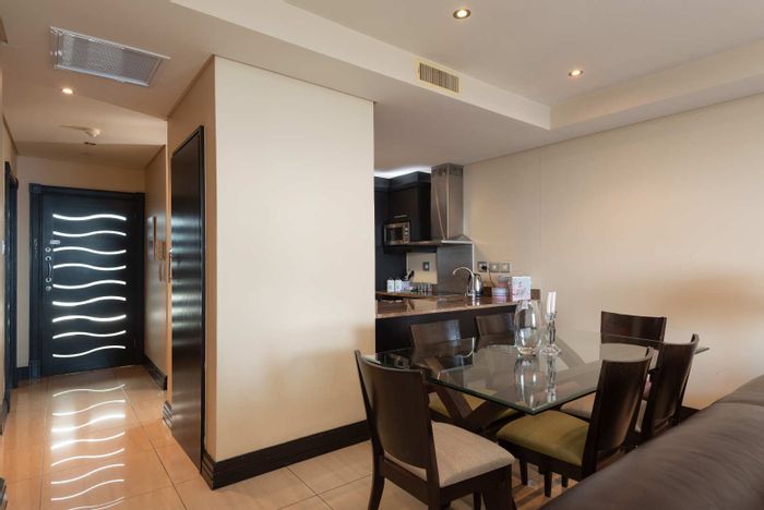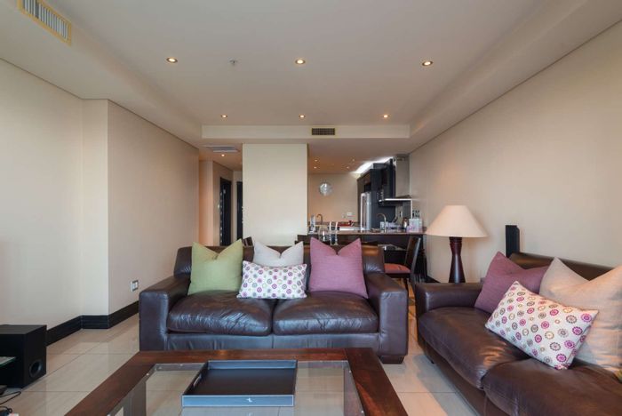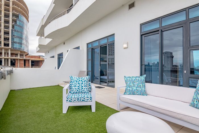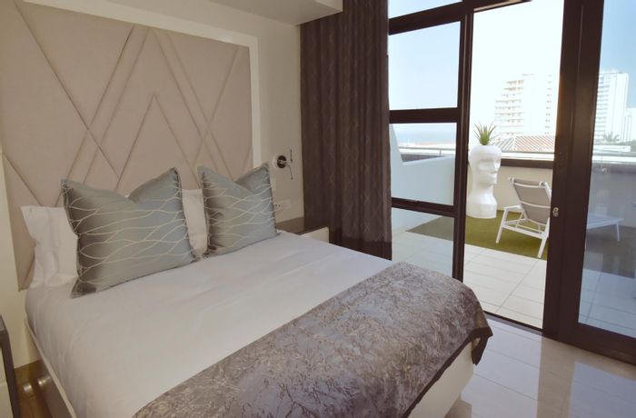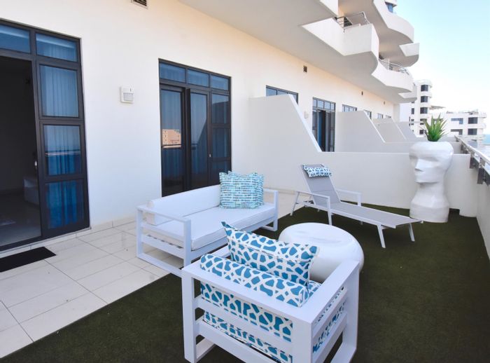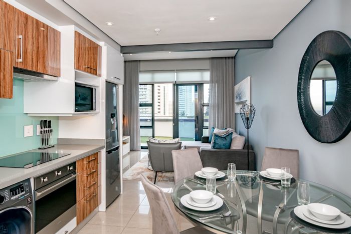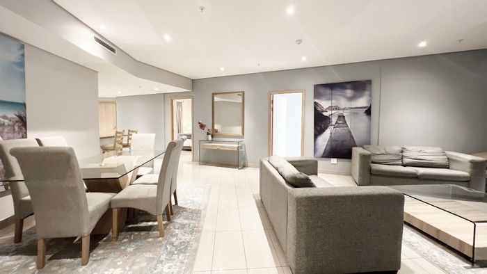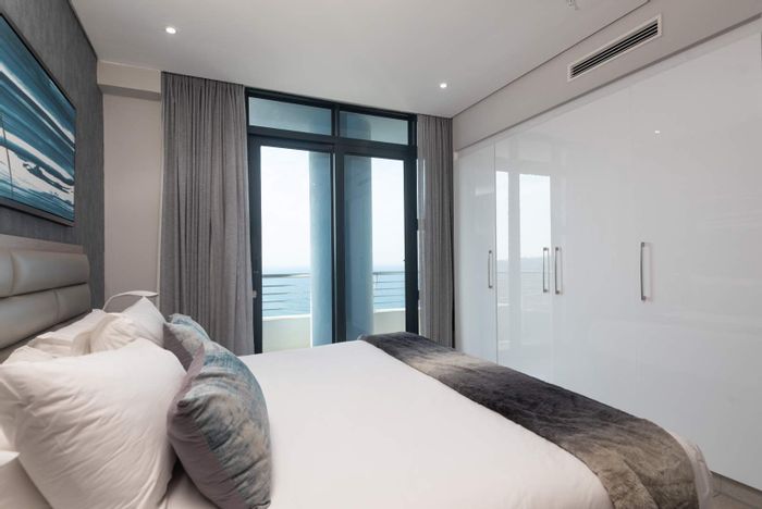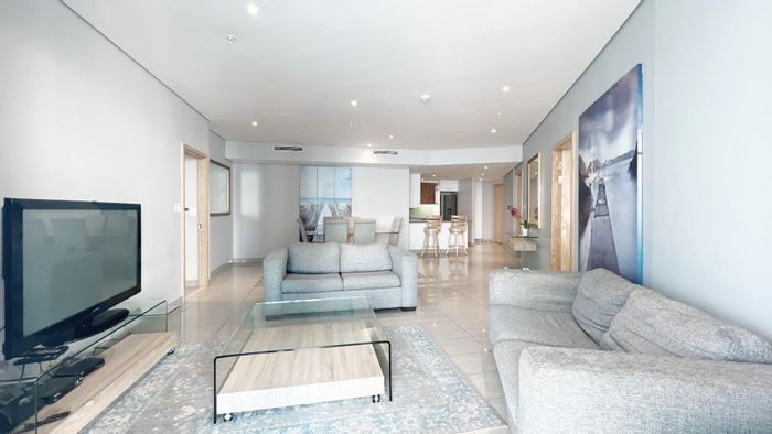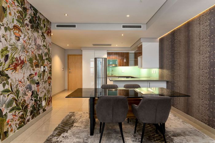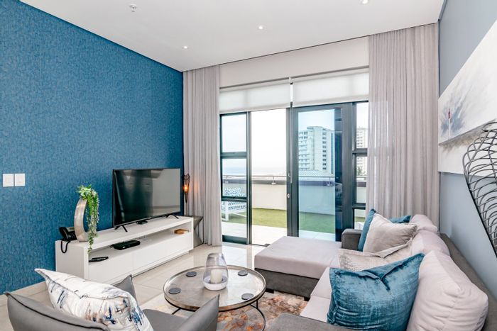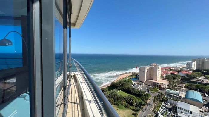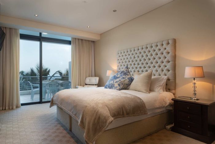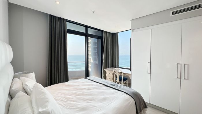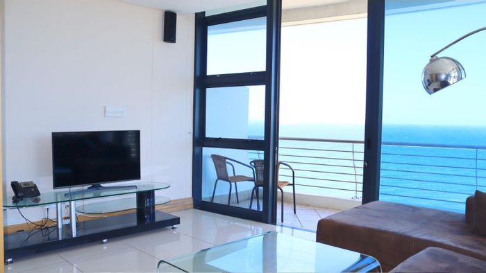 Seaside concierge living in Umhlanga with direct hotel and mall access; modern furnished apartment features a 38m² balcony with sea views and pool. Two beds, two baths, covered parking.