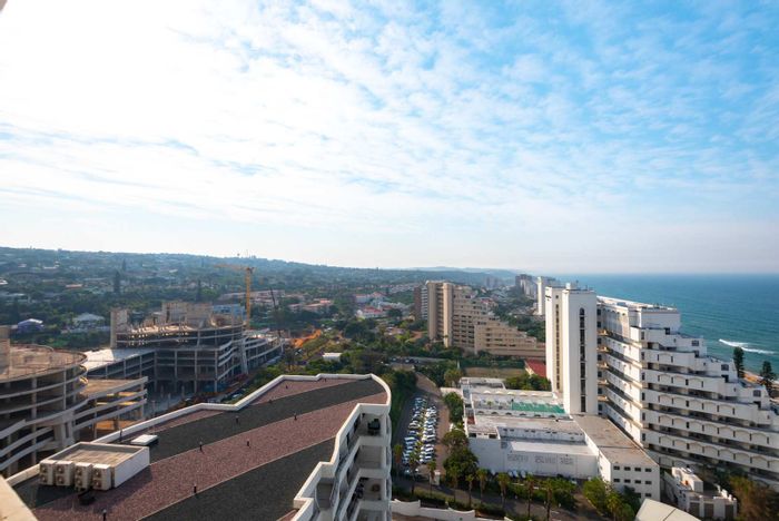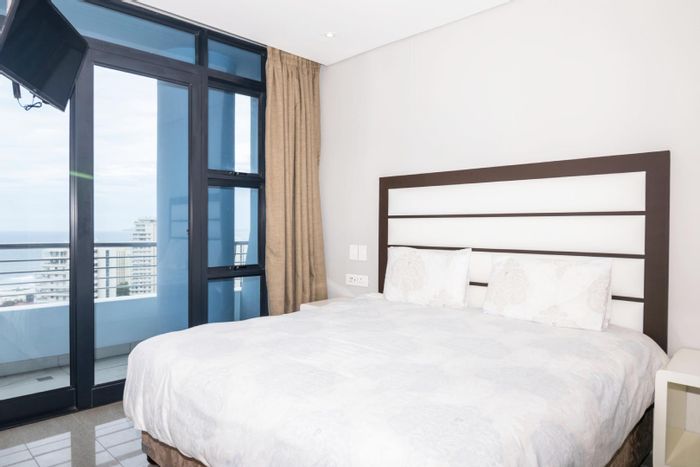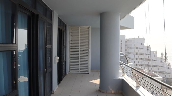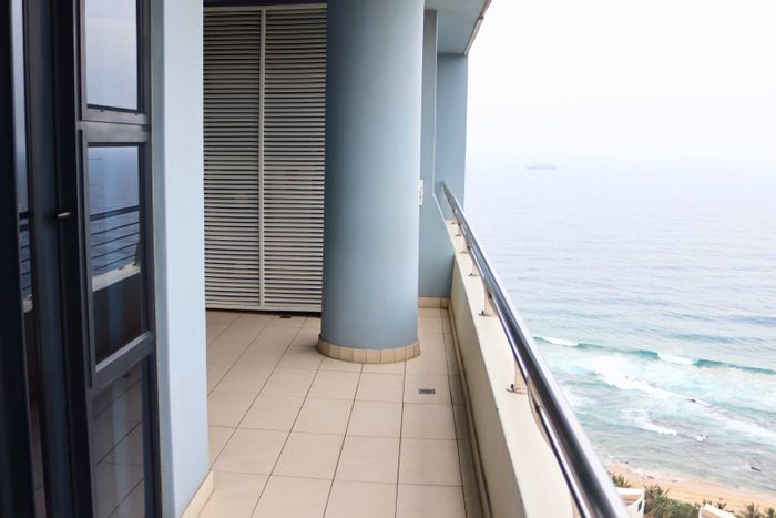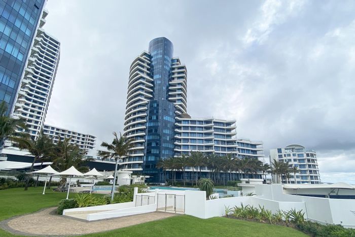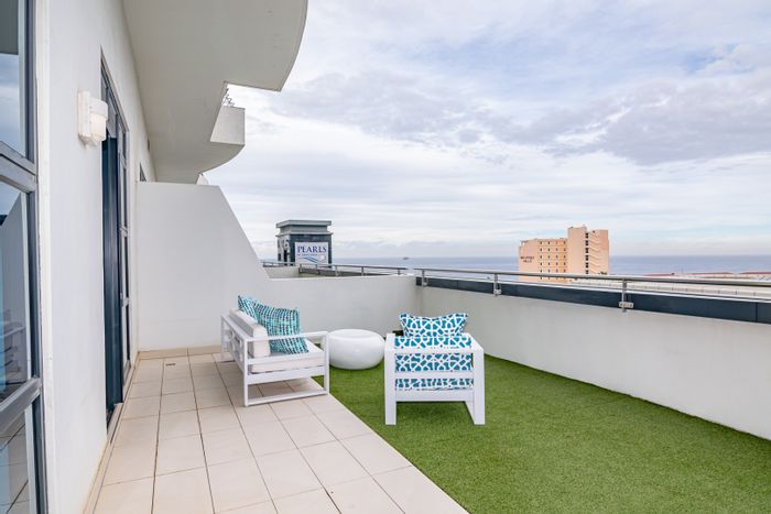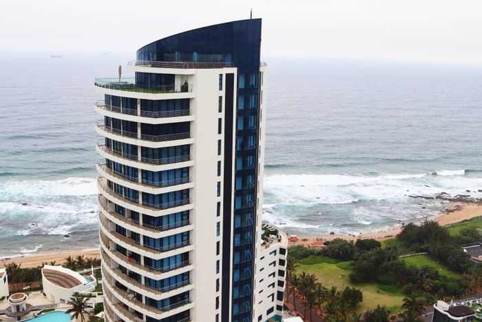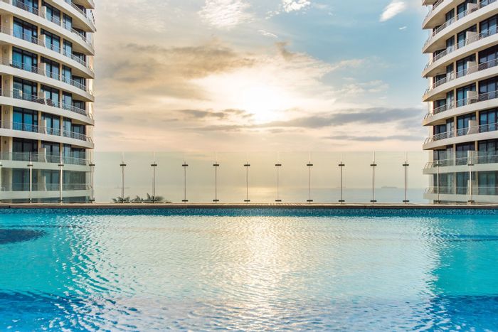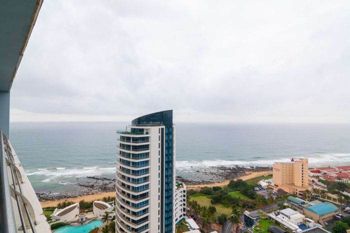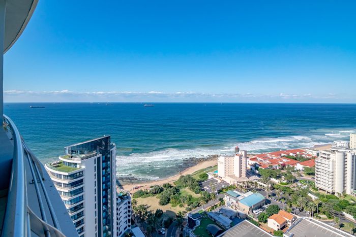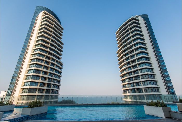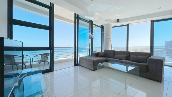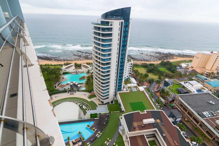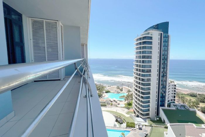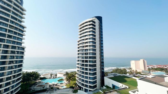 Coastal resort living at PEARL SKY with sweeping sea and inland views, close to Umhlanga and King Shaka Airport. 14m² balcony and resort pool, two-bed, two-bath.