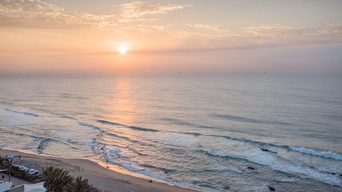 Coastal lifestyle in Pearls of Umhlanga — evening Indian Ocean views from balcony and skylights, access to hotel amenities and hydrotherapeutic pool. Two bedrooms, two bathrooms, covered parking.