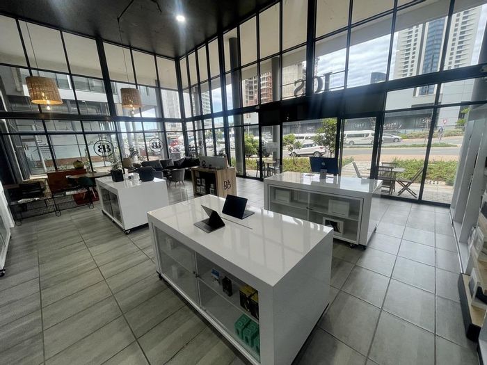 Capitalize on endless foot traffic in vibrant Umhlanga Rocks — premium retail space with floor-to-ceiling glass frontage and mezzanine private office, plus optional parking bays for staff and customers.
