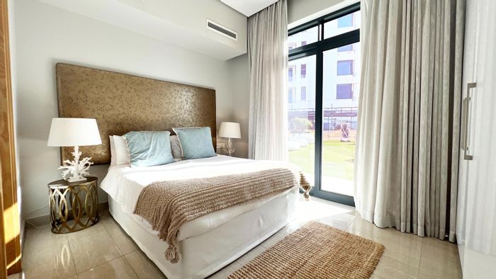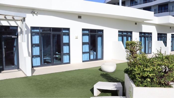 Seaside living steps from Umhlanga promenade and Pearls Mall, relax by hydrotherapeutic heated pool with Indian Ocean views; ground-floor apartment offering open-plan living, two beds, two baths, covered parking.