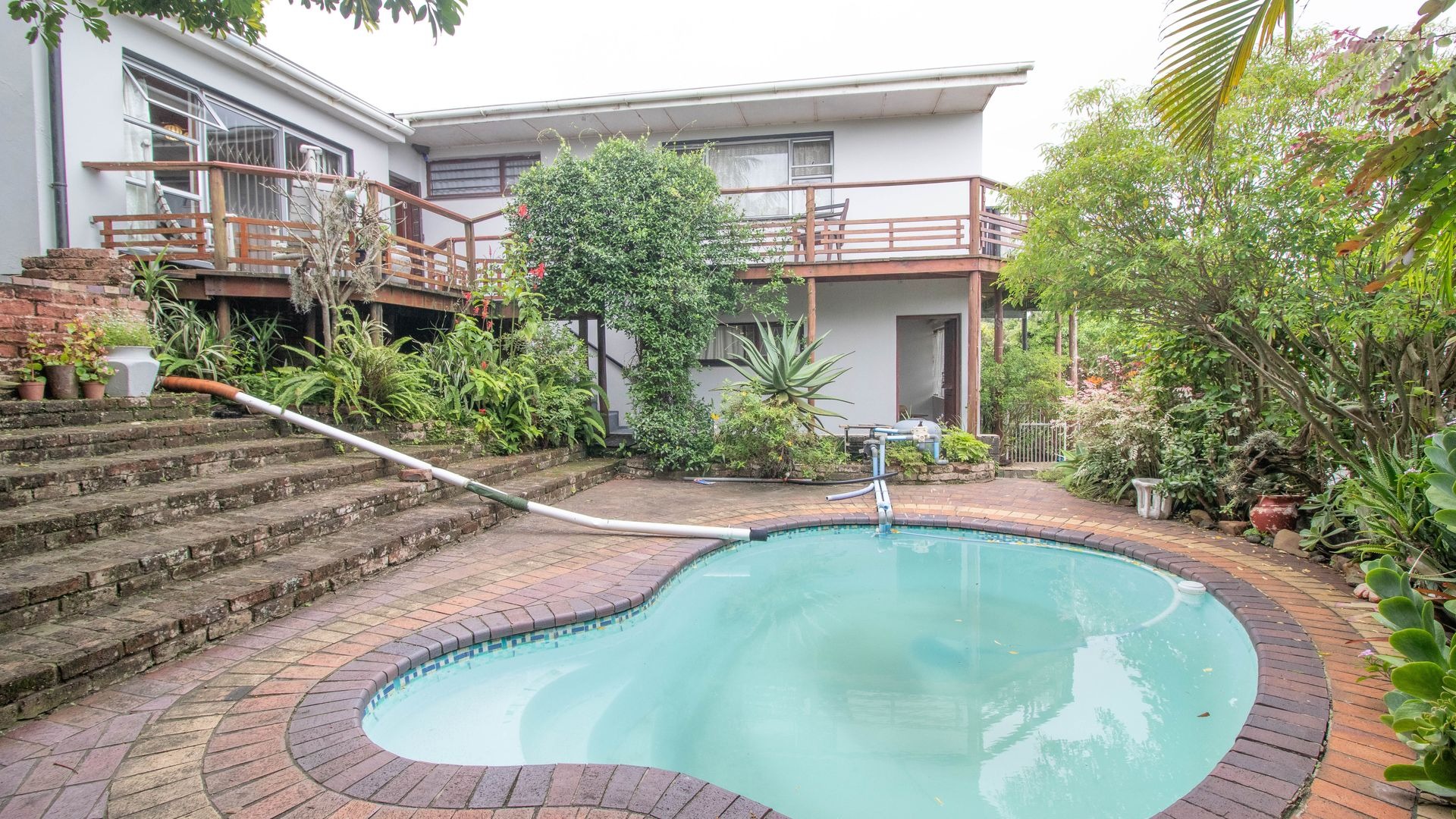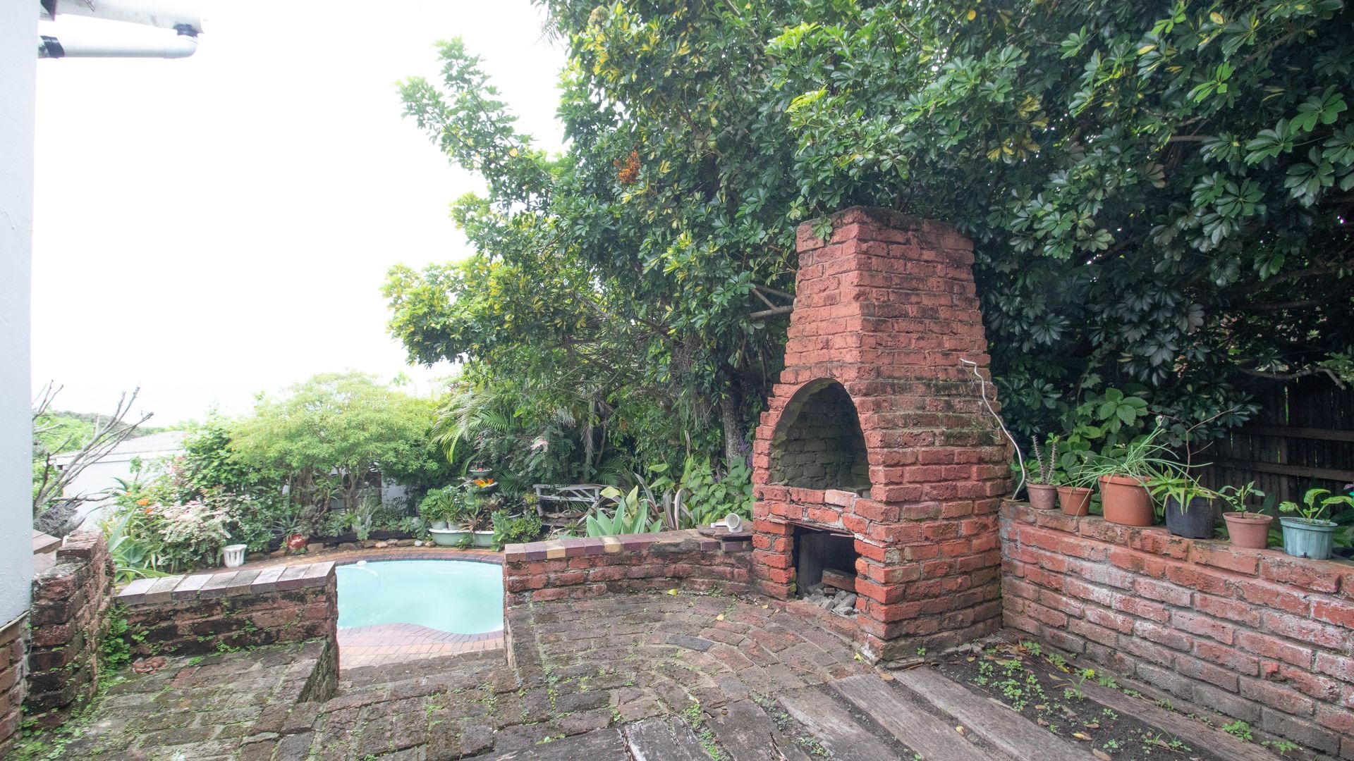 The swimming pool is set in leafy surrounds with a built-in braai and an elevated, flat area, perfect for a firepit, creating a beautiful ambience for families to enjoy.