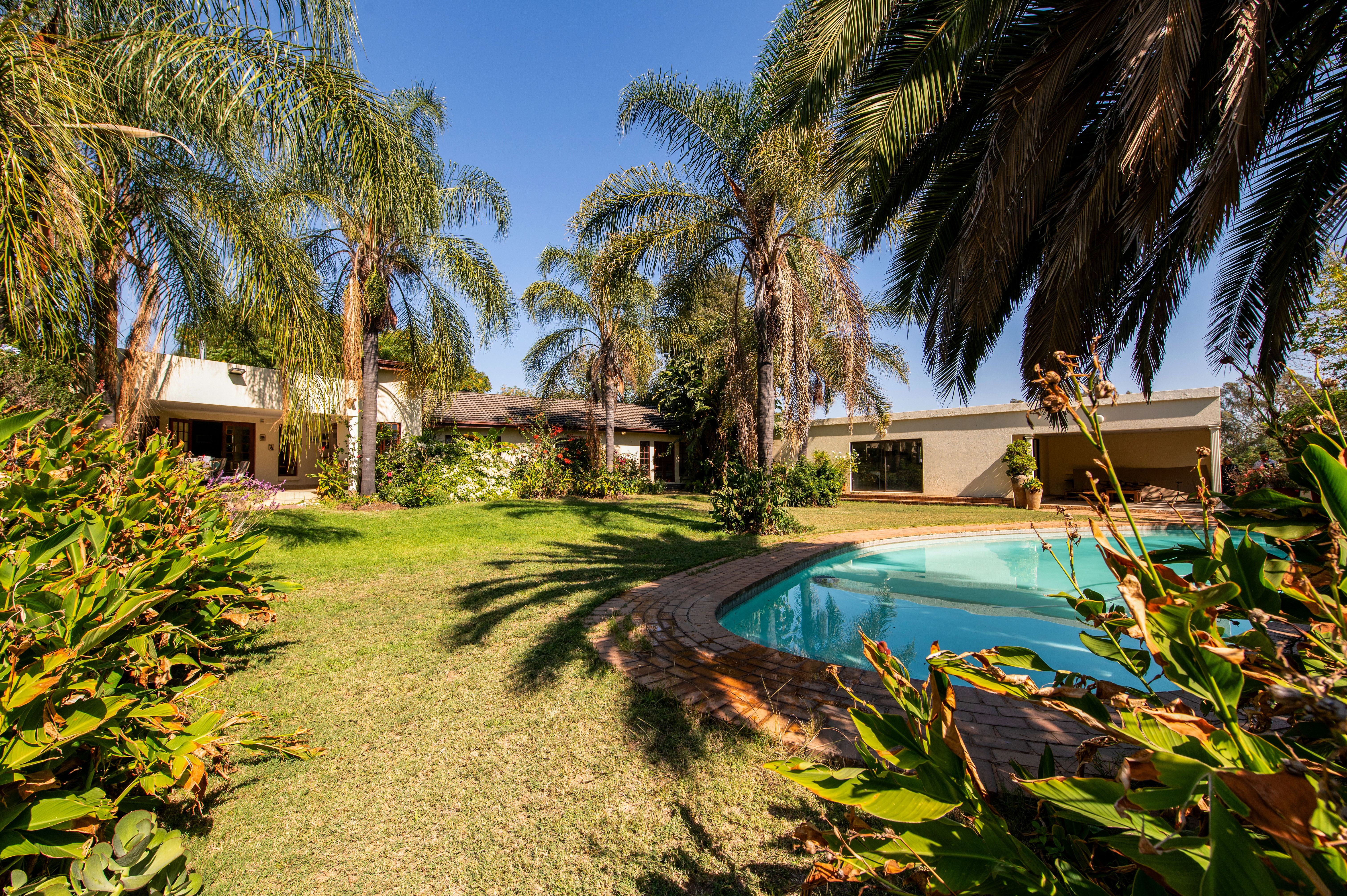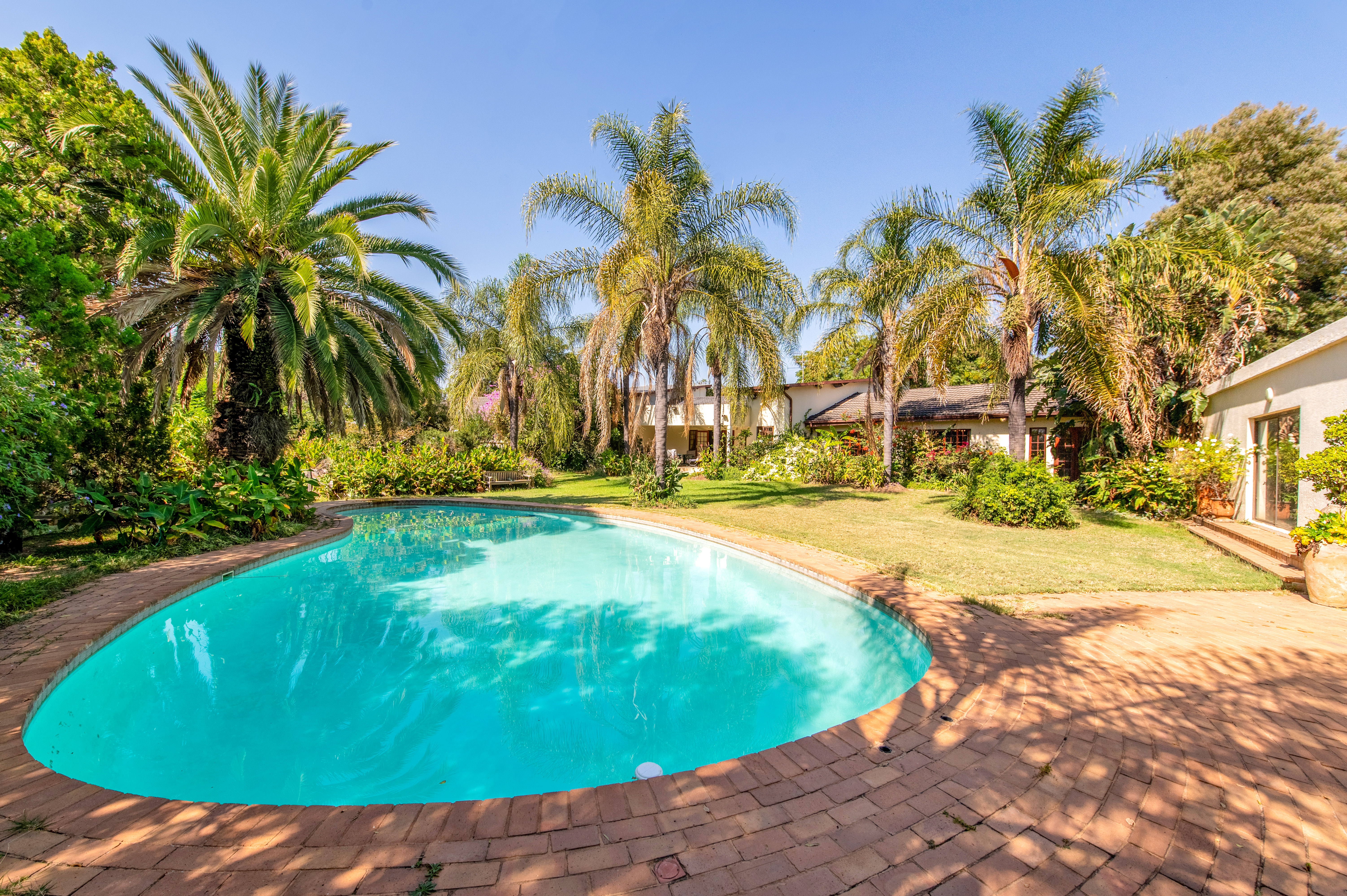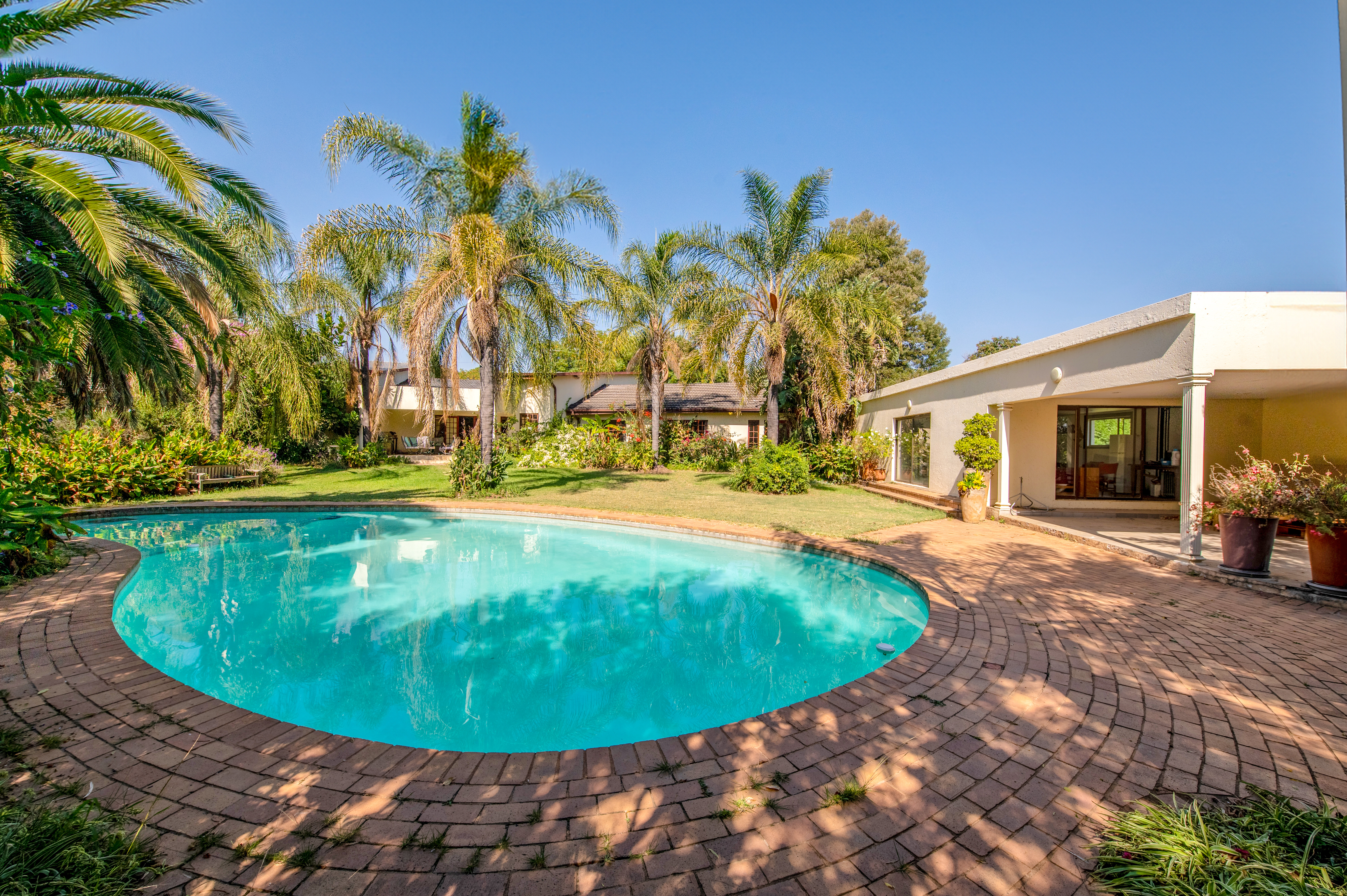 A separate entertainment room offers the potential to convert into a third cottage, gym, or just a great entertainment area, providing a picturesque view of the sparkling big pool.