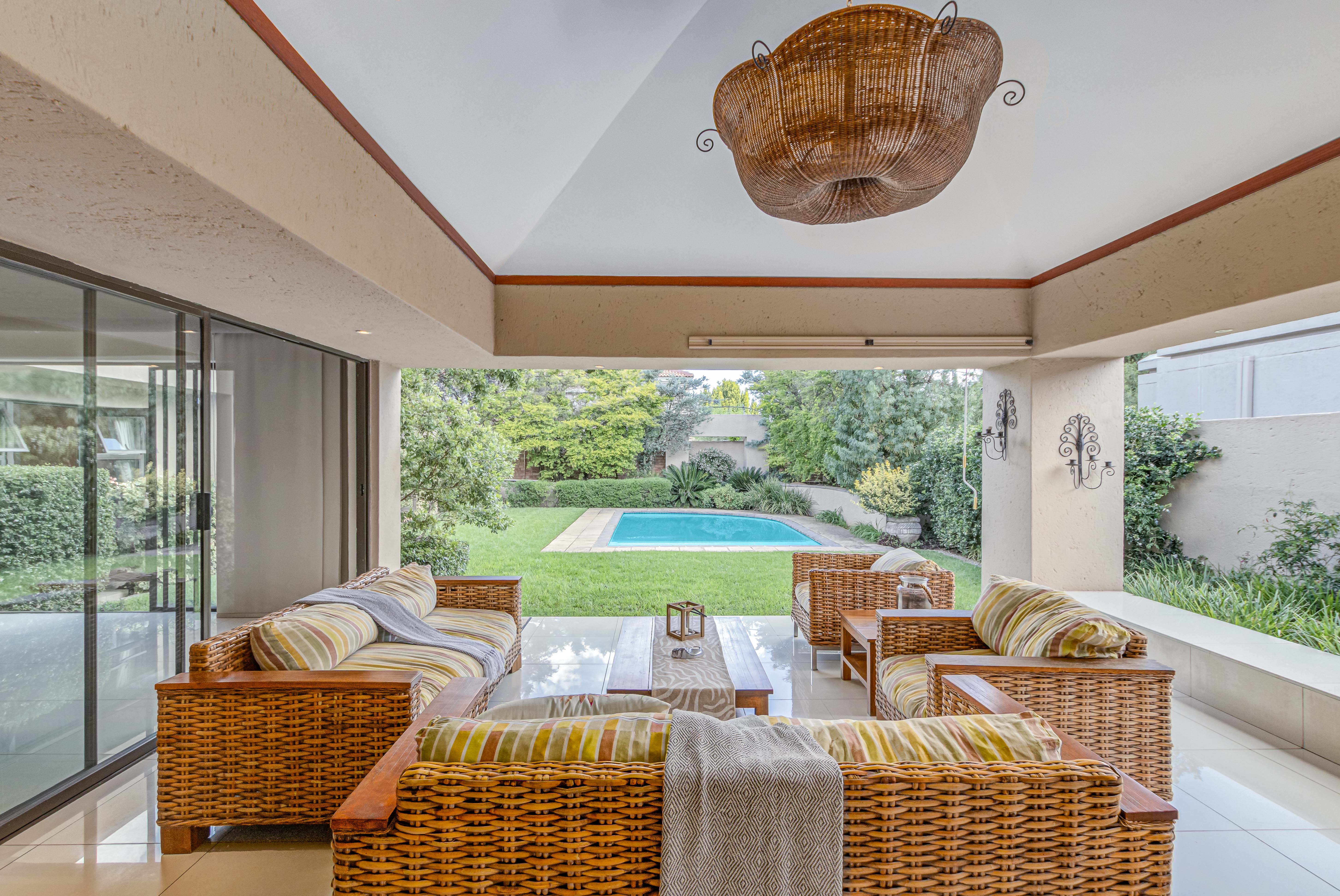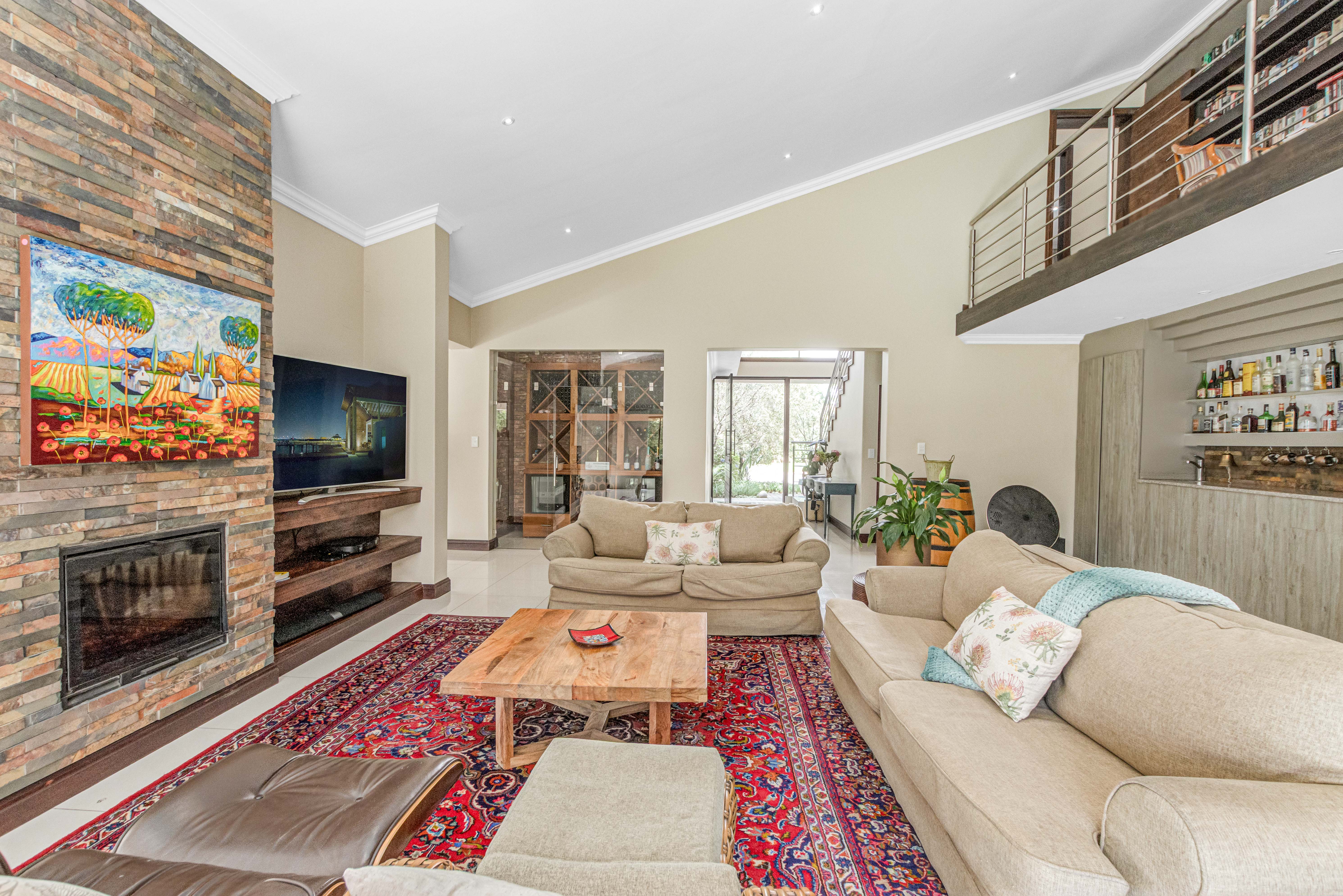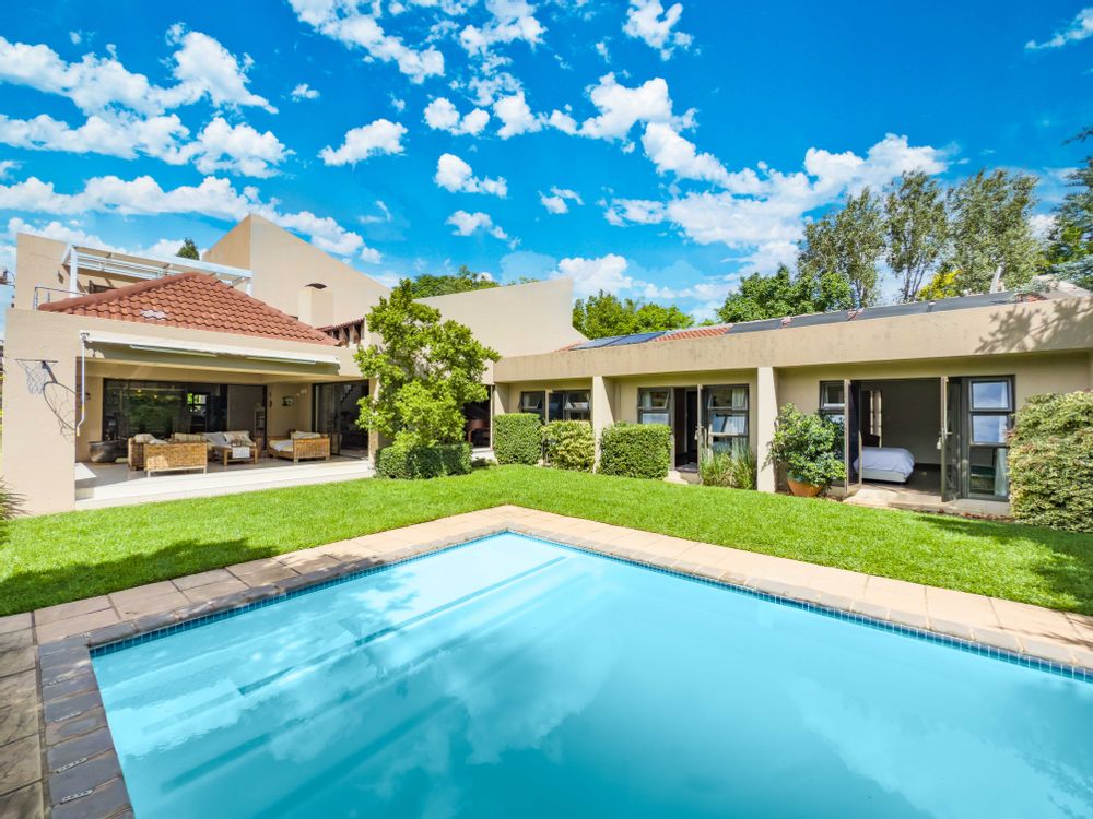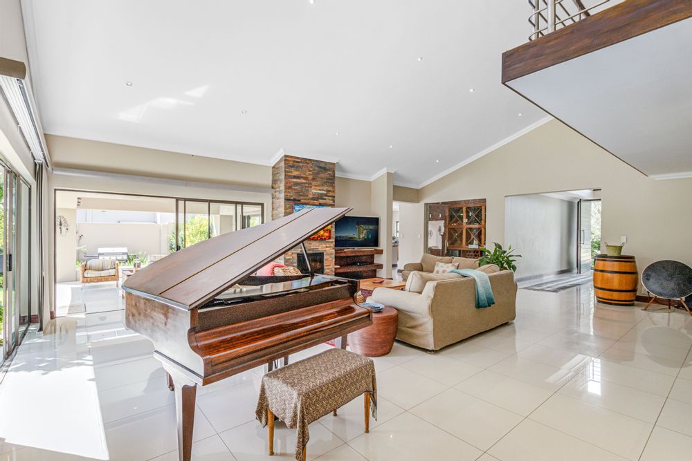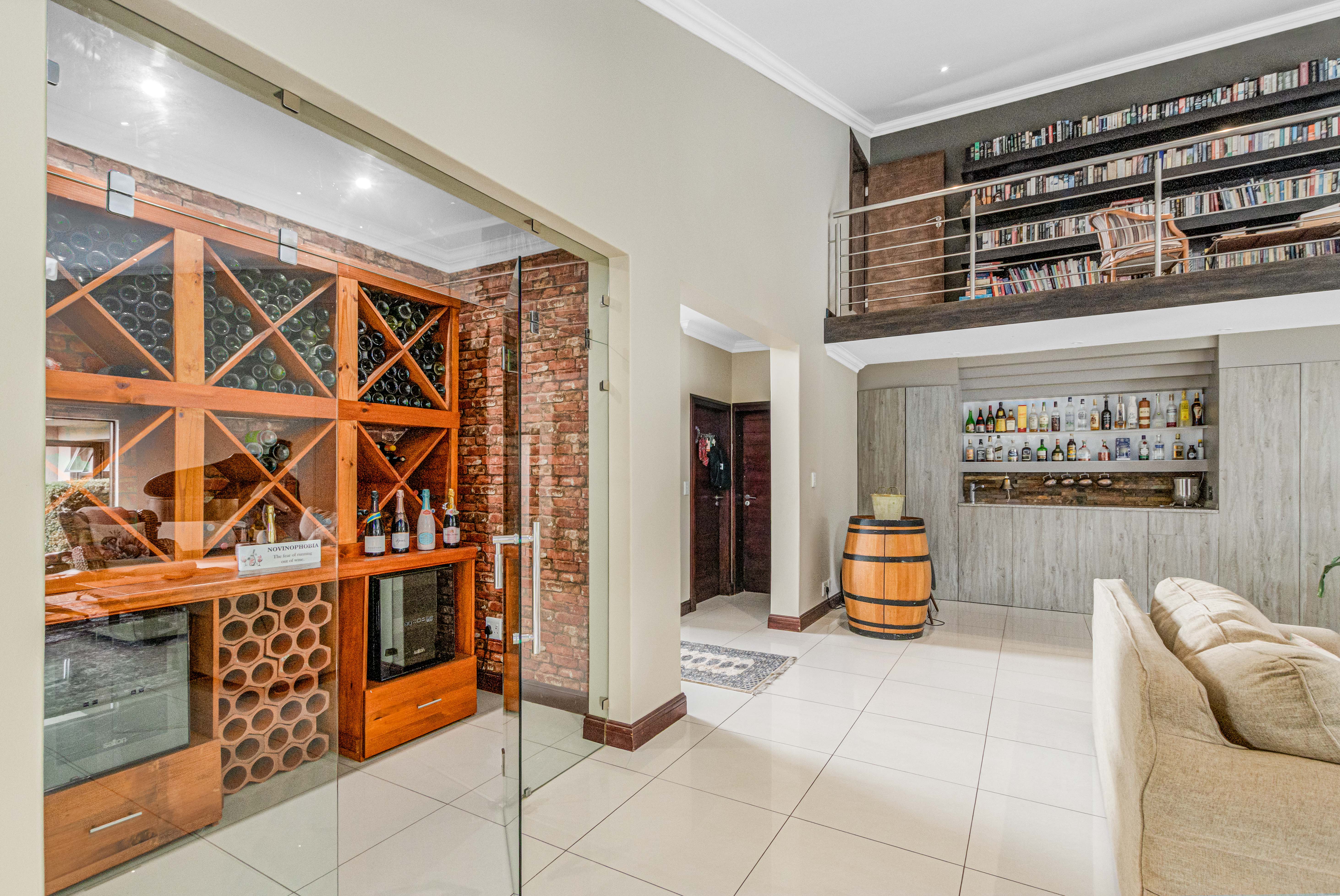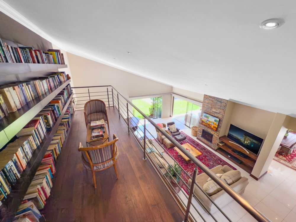 Step into this exquisite residence, where abundant natural light creates an illusion of spaciousness and enhances the overall quality of the home. Upon entry, you will be welcomed by a striking staircase adorned with a stainless steel balustrade. The open-plan TV lounge is thoughtfully situated and features a cozy log-burning fireplace, perfect for warmth on chilly winter evenings. Adjacent to this lounge is a well-placed bar area with granite countertops and a basin, along with an enclosed wine cellar. A remarkable highlight of this property is the stunning upstairs library, which offers a breathtaking view of the open-plan lounge below. Additionally, there is a separate TV room or cinema that opens to a private garden, which could also serve as an excellent office or children's playroom. The open-plan dining area provides seamless access to a beautifully covered patio, showcasing impressive views of the garden and pool. At the heart of the home lies the well-equipped kitchen, featuring a spacious galley island that invites gatherings and the creation of cherished memories with family and friends. A separate pantry and scullery offer ample storage for all appliances. The residence includes six generously sized bedrooms (three on the ground floor and three upstairs), with two en-suite bathrooms and a total of 4.5 bathrooms.
