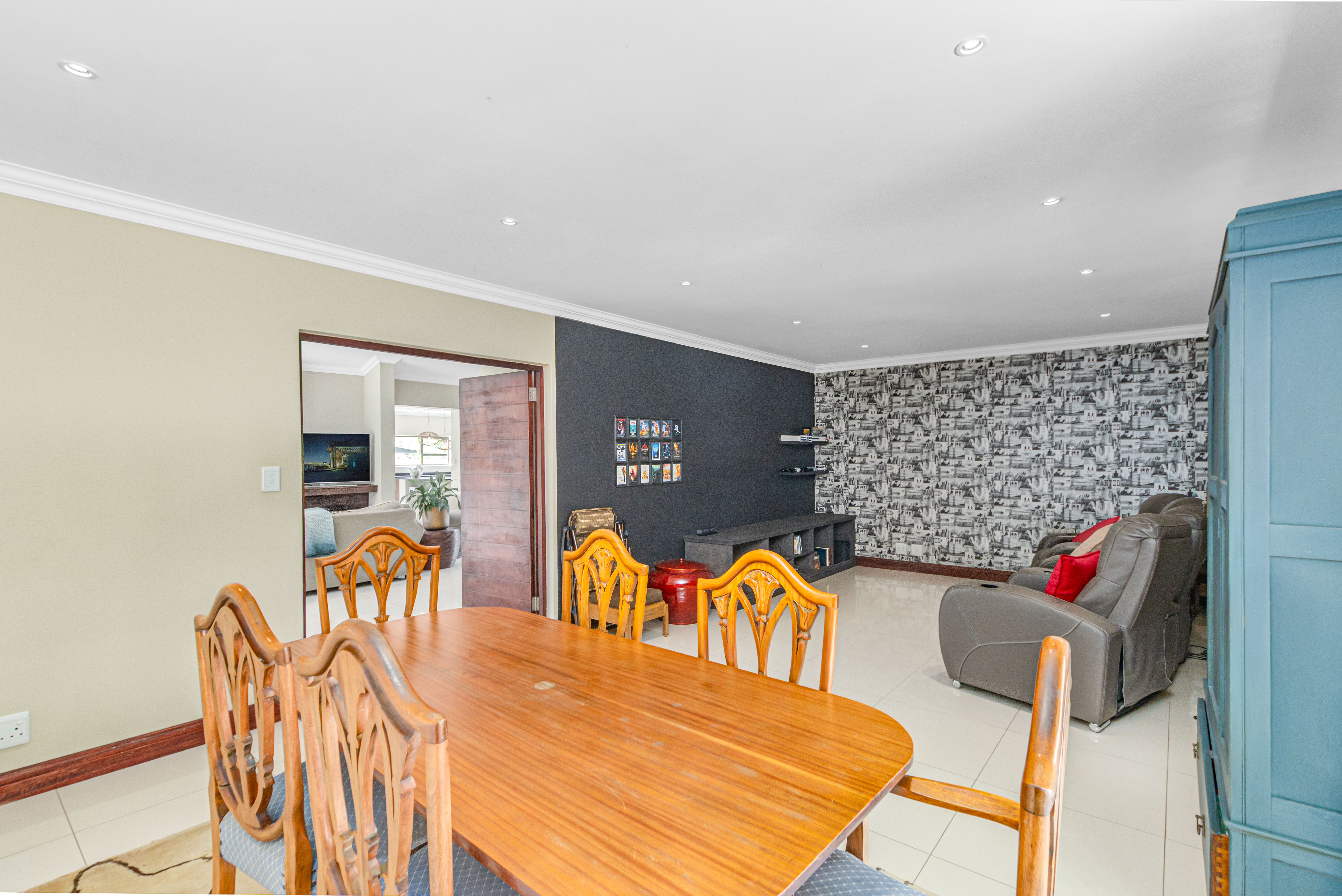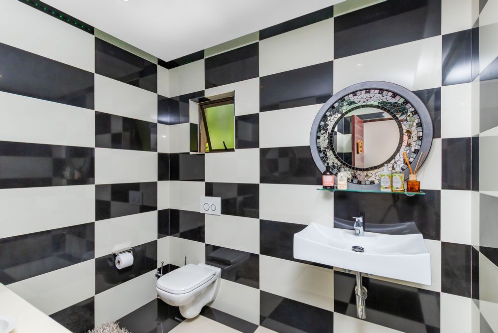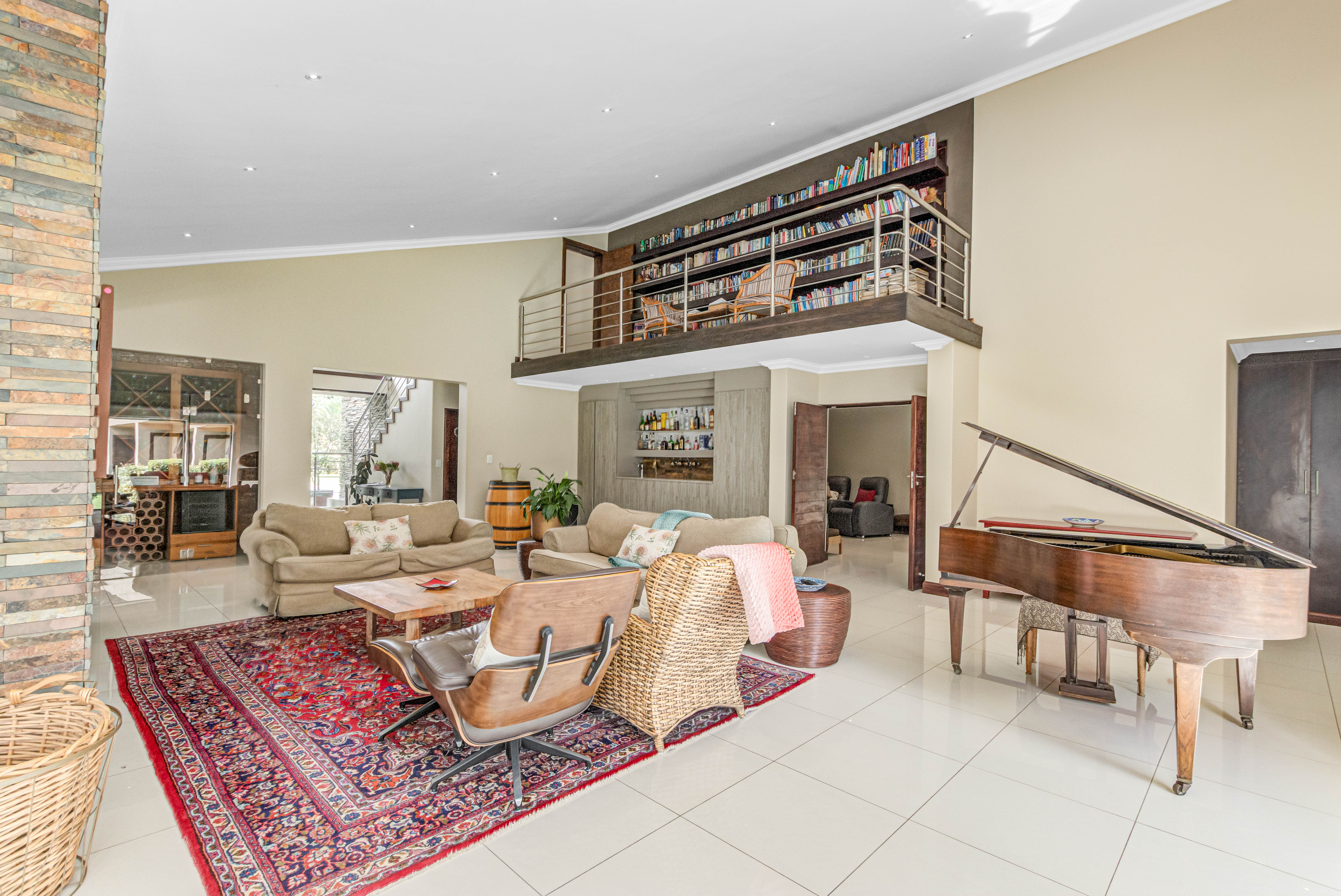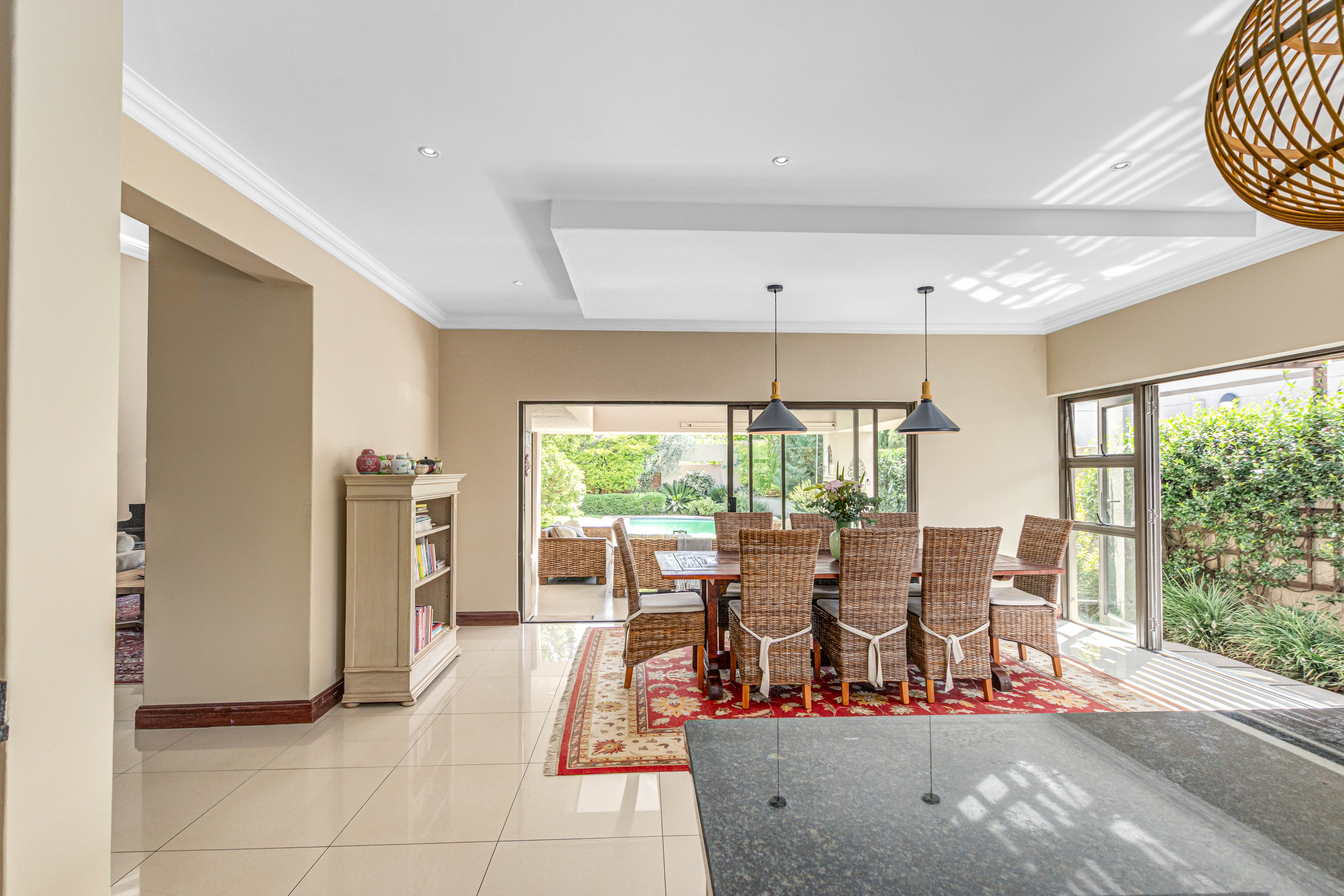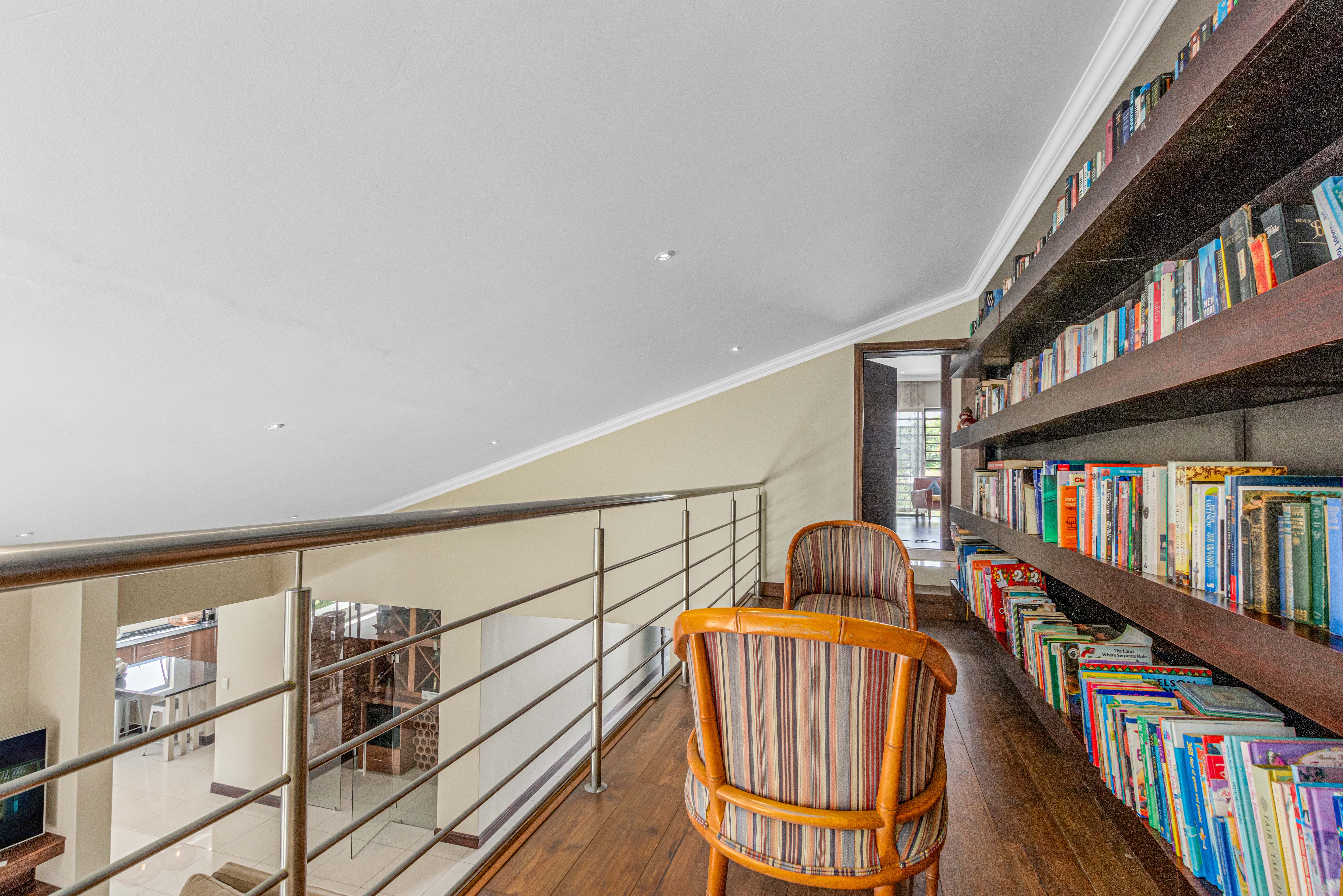 Step into this exquisite residence, where abundant natural light creates an illusion of spaciousness and enhances the overall quality of the home. Upon entry, you will be welcomed by a striking staircase adorned with a stainless steel balustrade. The open-plan TV lounge is thoughtfully situated and features a cozy log-burning fireplace, perfect for warmth on chilly winter evenings. Adjacent to this lounge is a well-placed bar area with granite countertops and a basin, along with an enclosed wine cellar. A remarkable highlight of this property is the stunning upstairs library, which offers a breathtaking view of the open-plan lounge below. Additionally, there is a separate TV room or cinema that opens to a private garden, which could also serve as an excellent office or children's playroom. The open-plan dining area provides seamless access to a beautifully covered patio, showcasing impressive views of the garden and pool. At the heart of the home lies the well-equipped kitchen, featuring a spacious galley island that invites gatherings and the creation of cherished memories with family and friends. A separate pantry and scullery offer ample storage for all appliances. The residence includes six generously sized bedrooms (three on the ground floor and three upstairs), with two en-suite bathrooms and a total of 4.5 bathrooms.