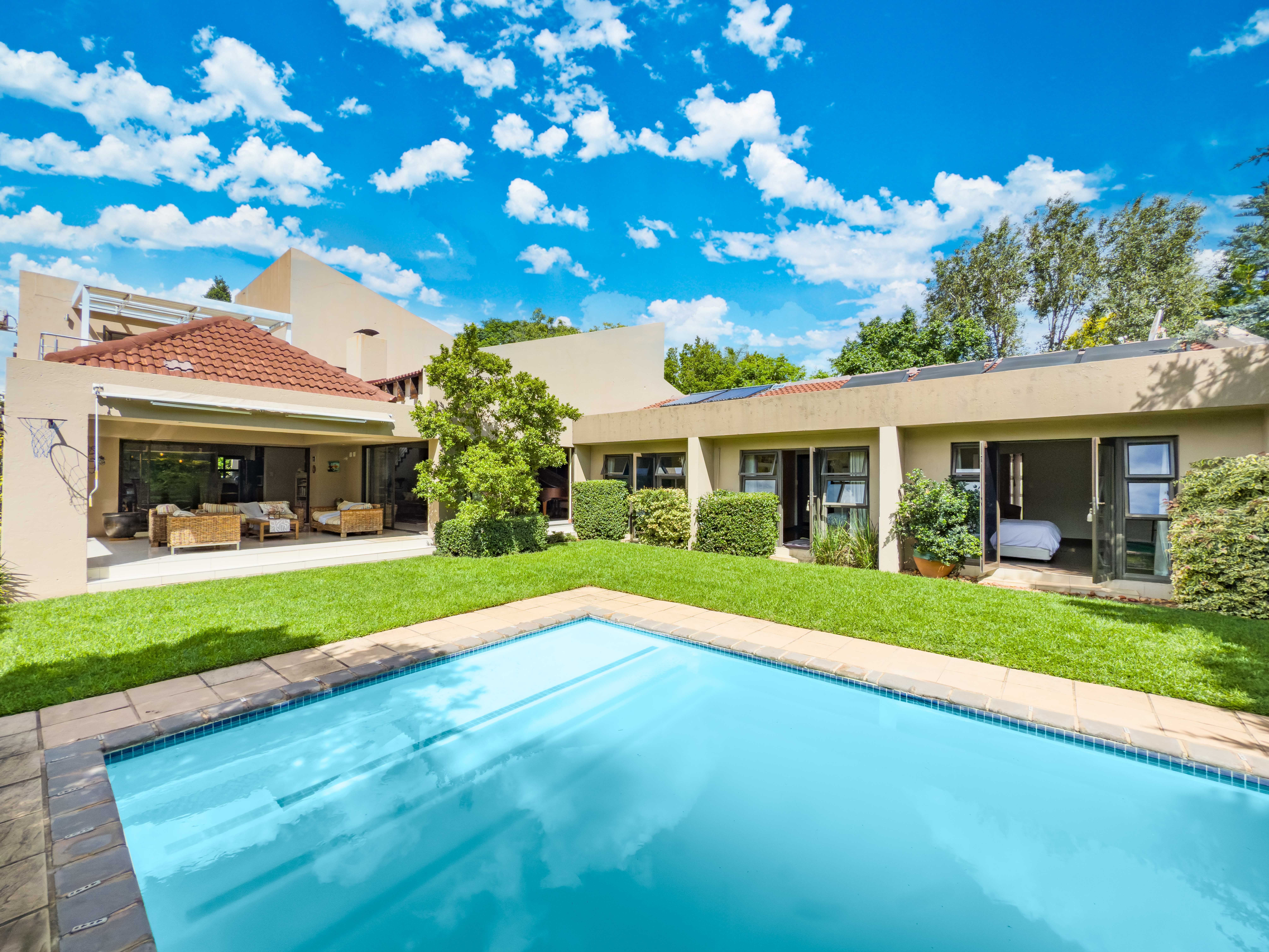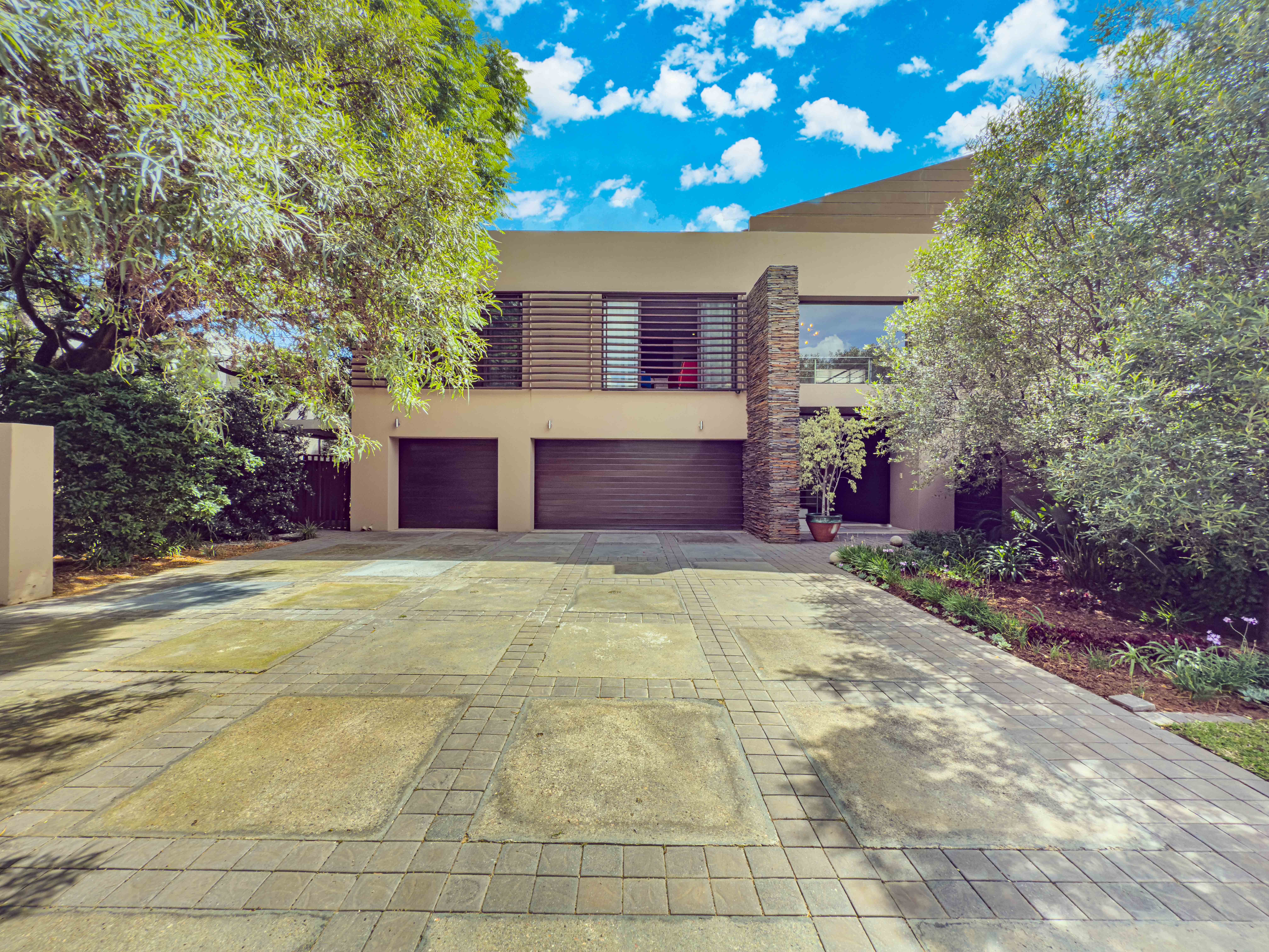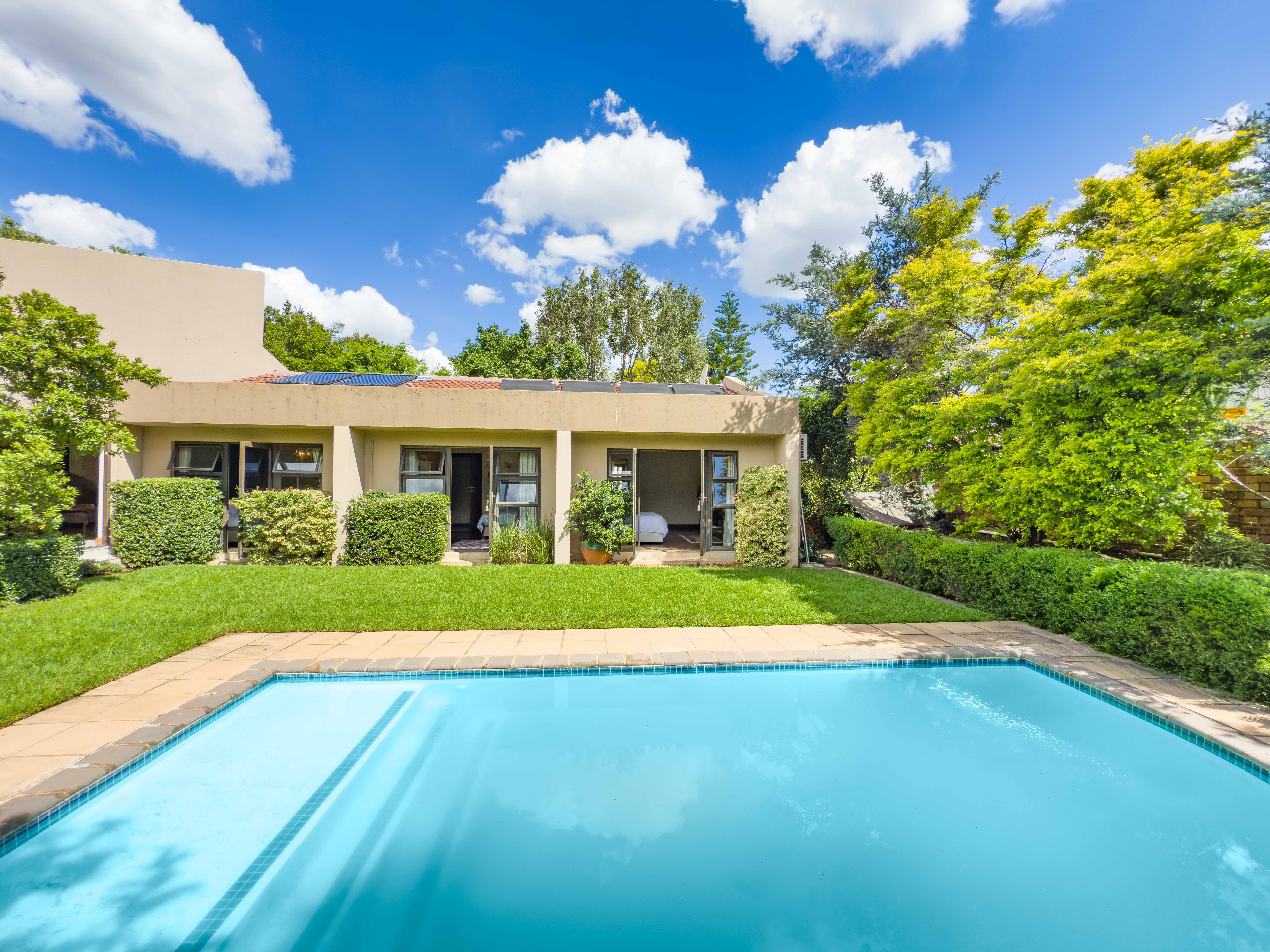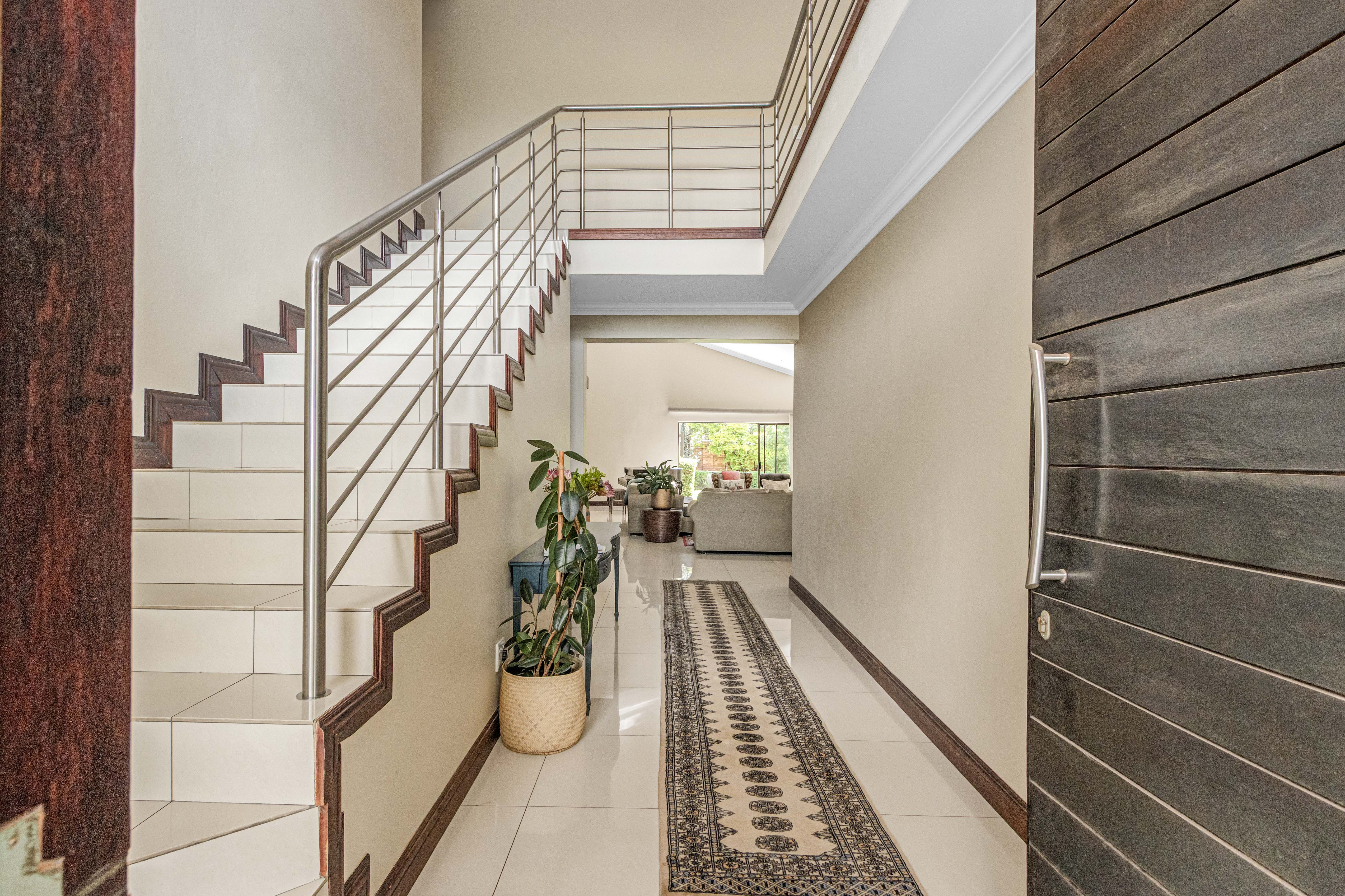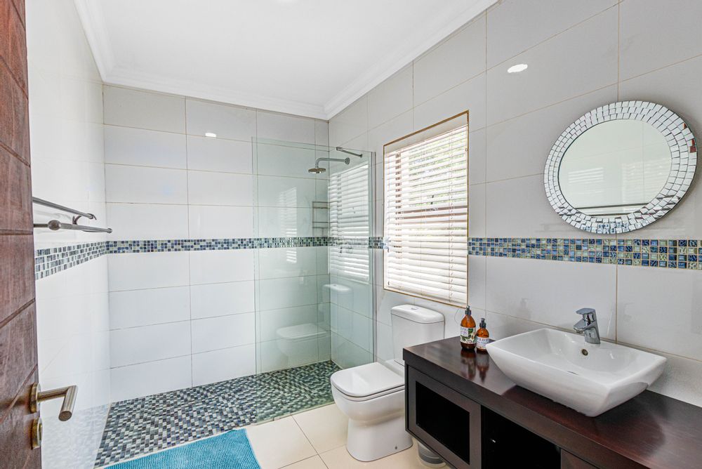 Key features: JOJO Water Tanks with pump, solar geyser, aircons, storeroom under staircase, outdoor shower in main bedroom + large wardrobe, well appointed guest toilet, the 3 bedrooms downstairs all open to the beautiful garden, wine cellar, miele electric stove/oven with extractor fan, granite countertops and prep bowl basin, spacious driveway with 3 garages, parking under cover for trailer, stainless steel balustrade, aluminium windows/doors, laminated flooring, tiled roof, linen BIC, outside courtyard with separate gate, upstairs west balcony with cover, staff accommodation, 3x geysers, wendy house, outside wash base, council approved plans in order, prepaid electricity.