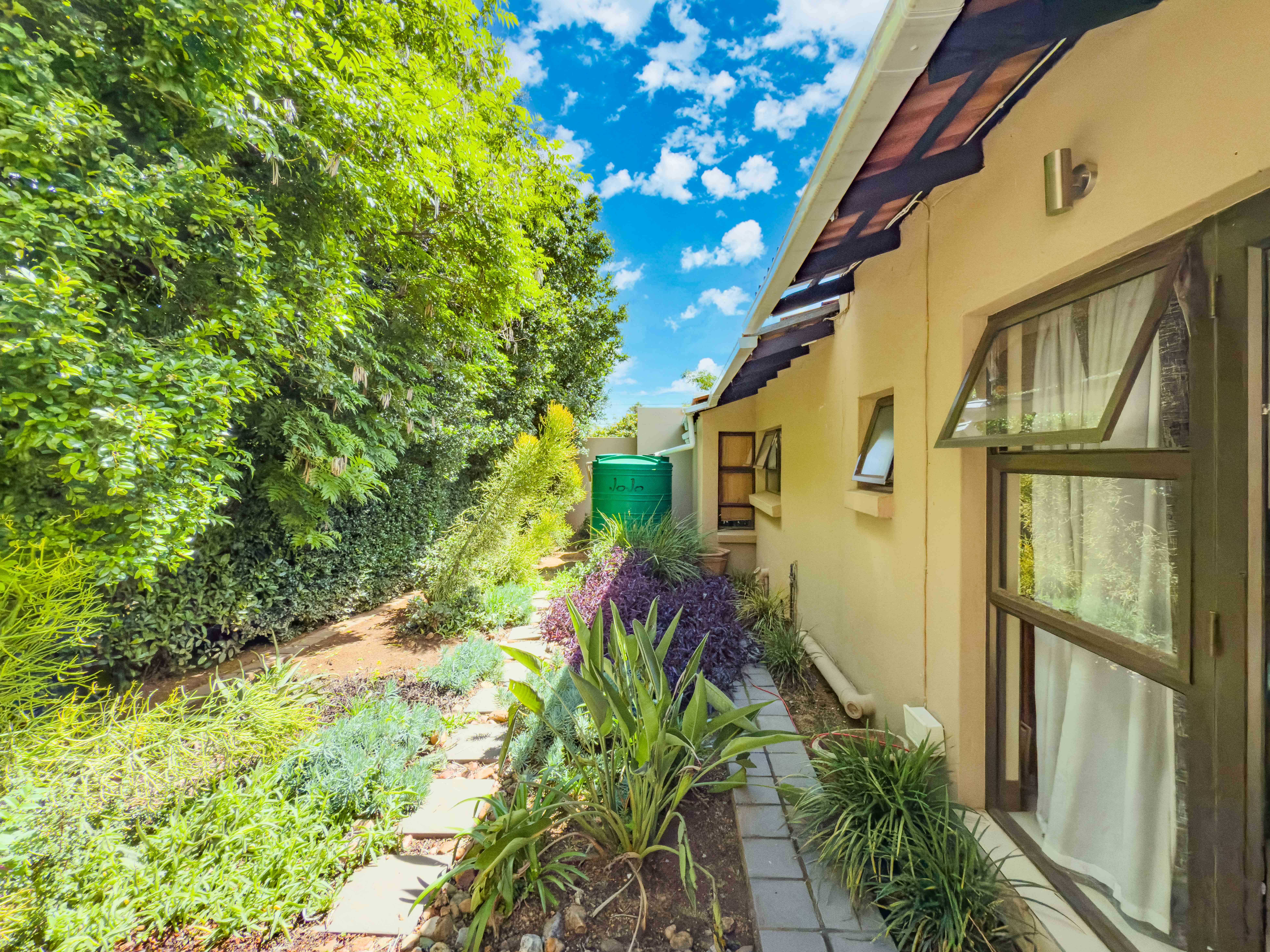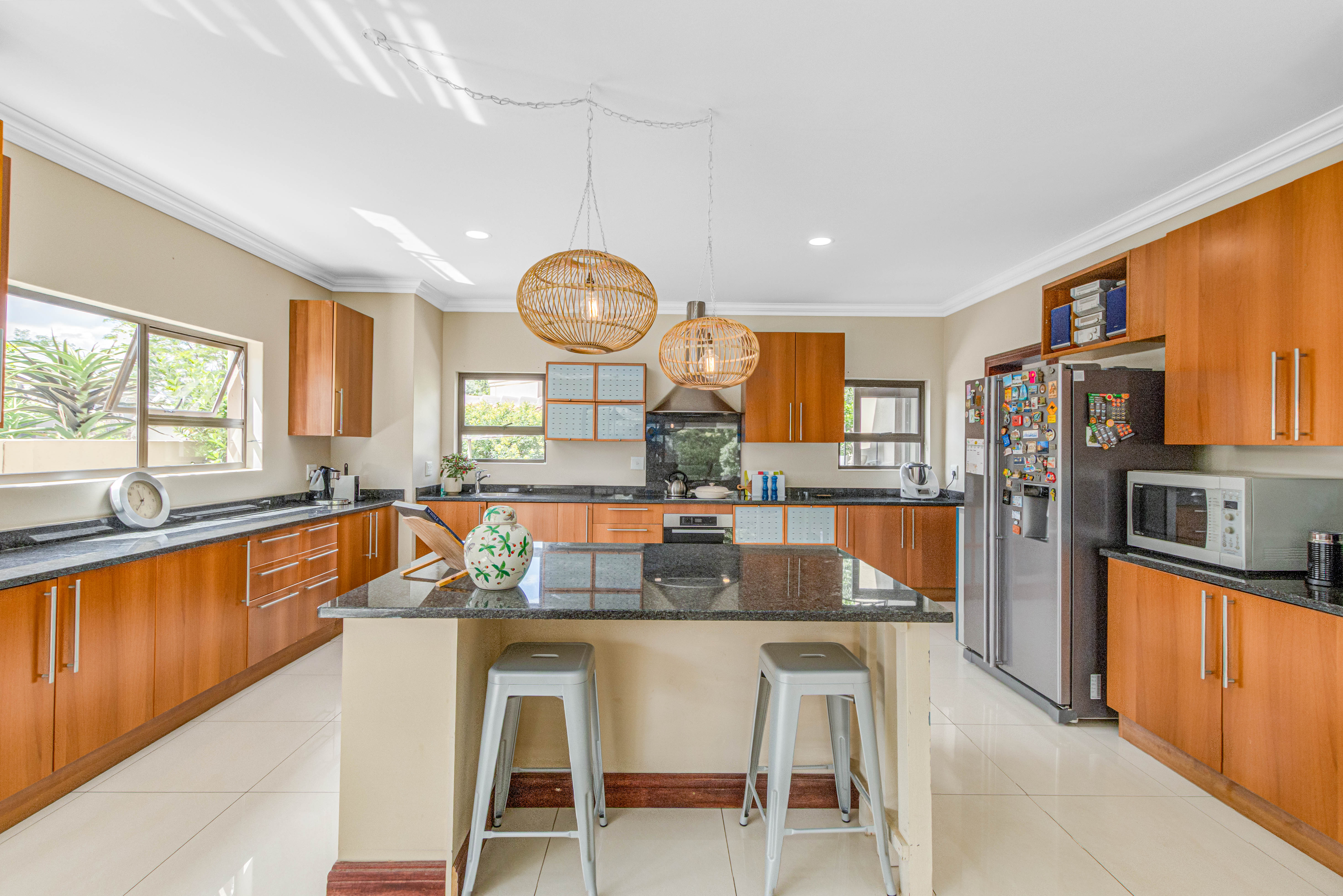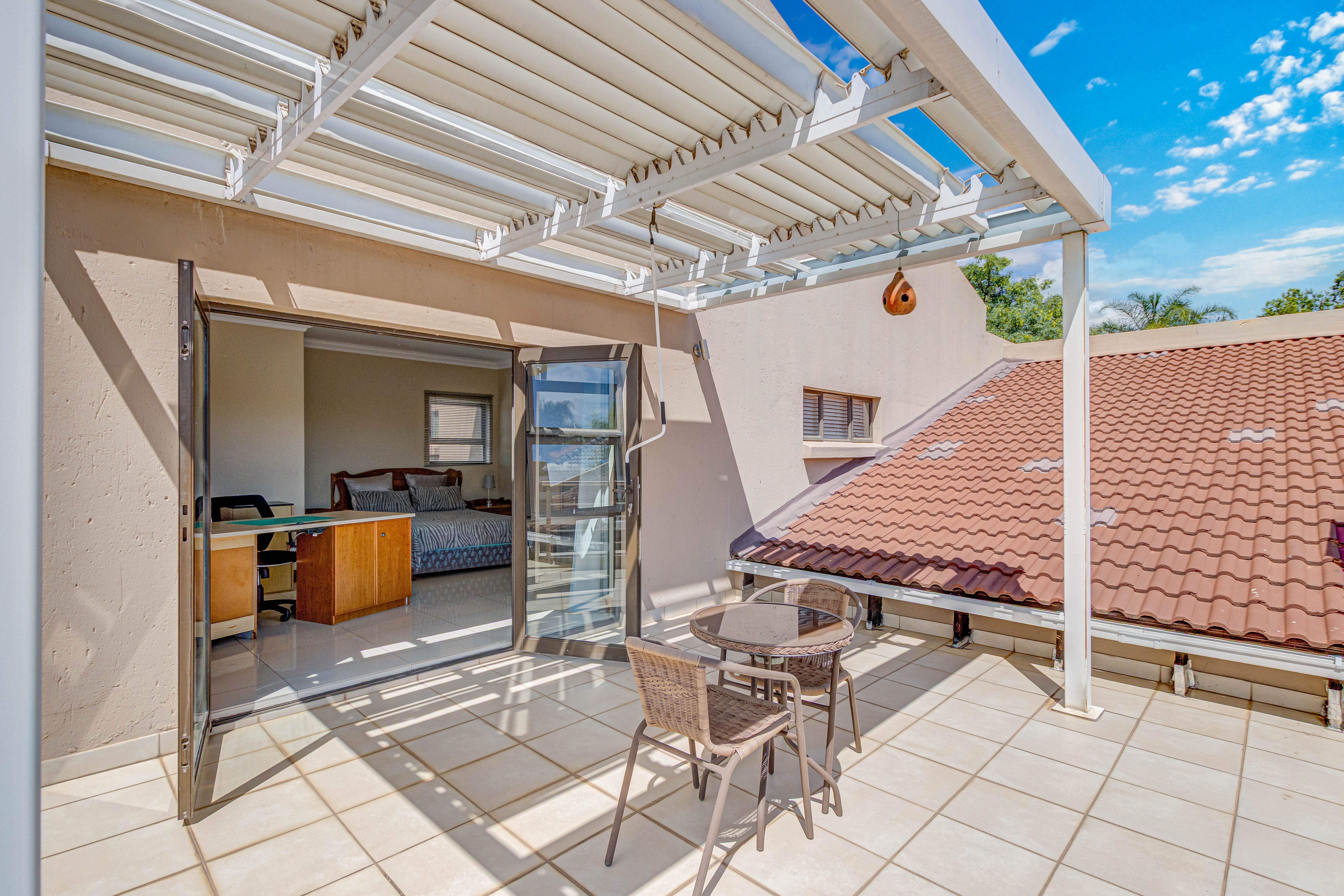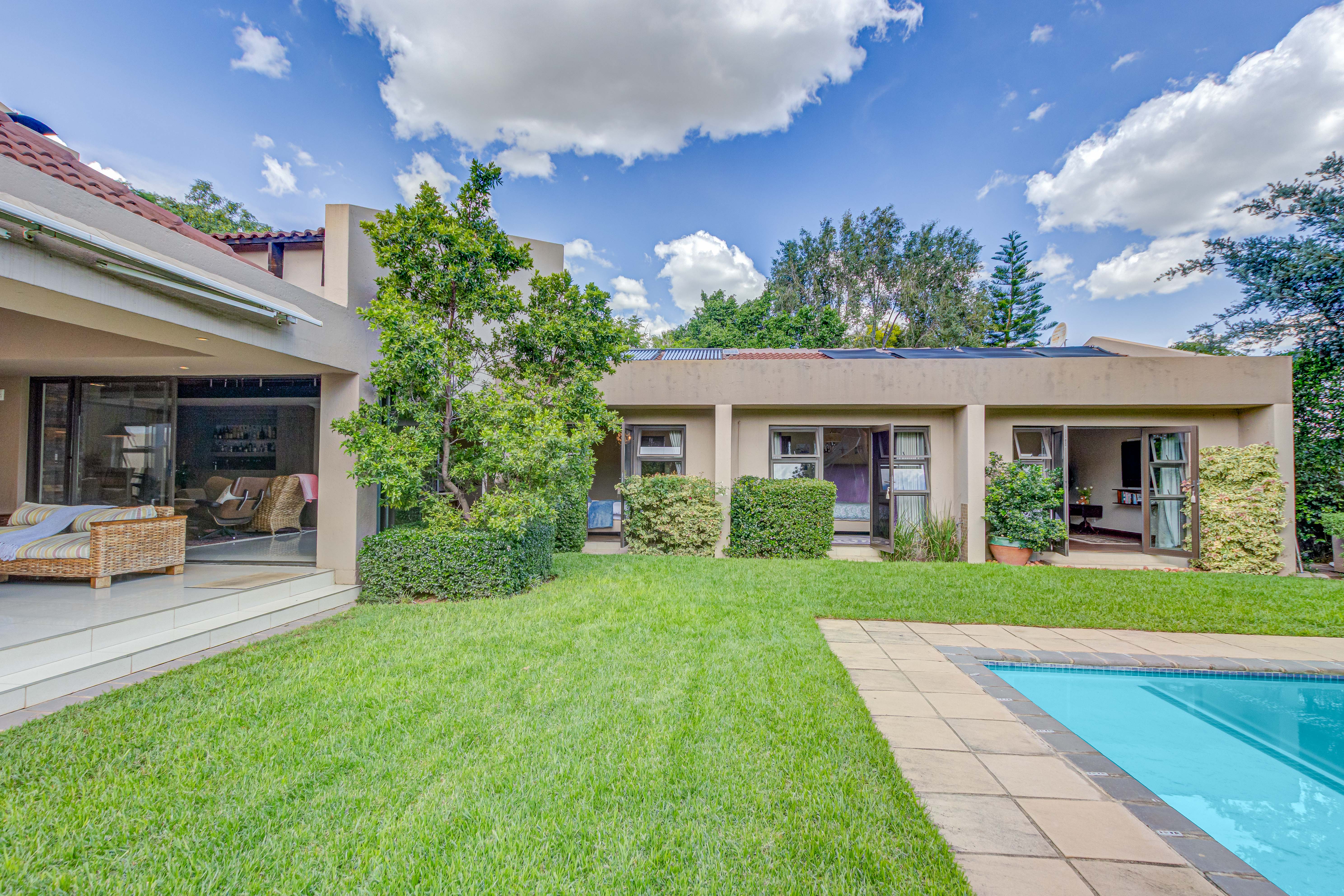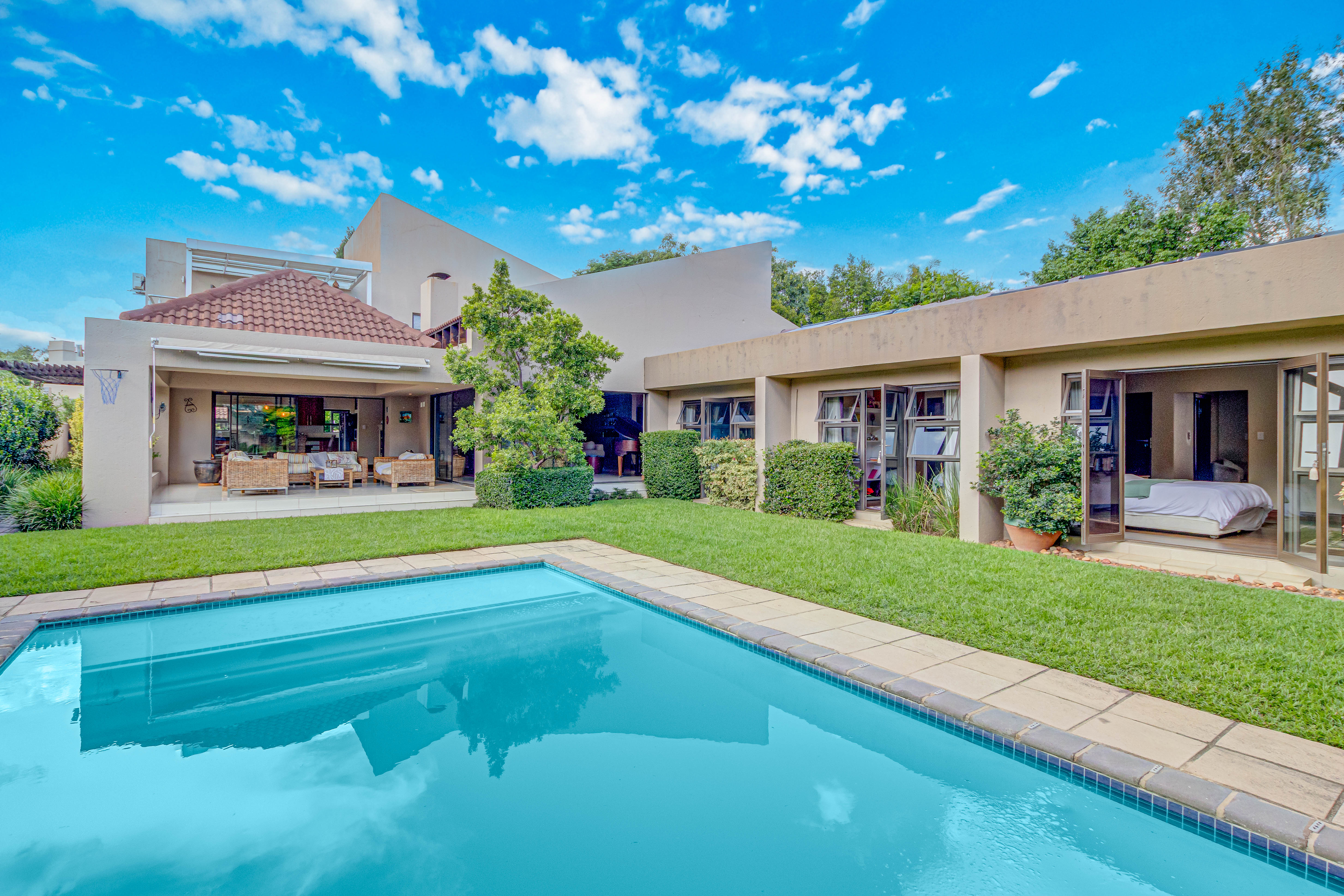 Key features: JOJO Water Tanks with pump, solar geyser, aircons, storeroom under staircase, outdoor shower in main bedroom + large wardrobe, well appointed guest toilet, the 3 bedrooms downstairs all open to the beautiful garden, wine cellar, miele electric stove/oven with extractor fan, granite countertops and prep bowl basin, spacious driveway with 3 garages, parking under cover for trailer, stainless steel balustrade, aluminium windows/doors, laminated flooring, tiled roof, linen BIC, outside courtyard with separate gate, upstairs west balcony with cover, staff accommodation, 3x geysers, wendy house, outside wash base, council approved plans in order, prepaid electricity.