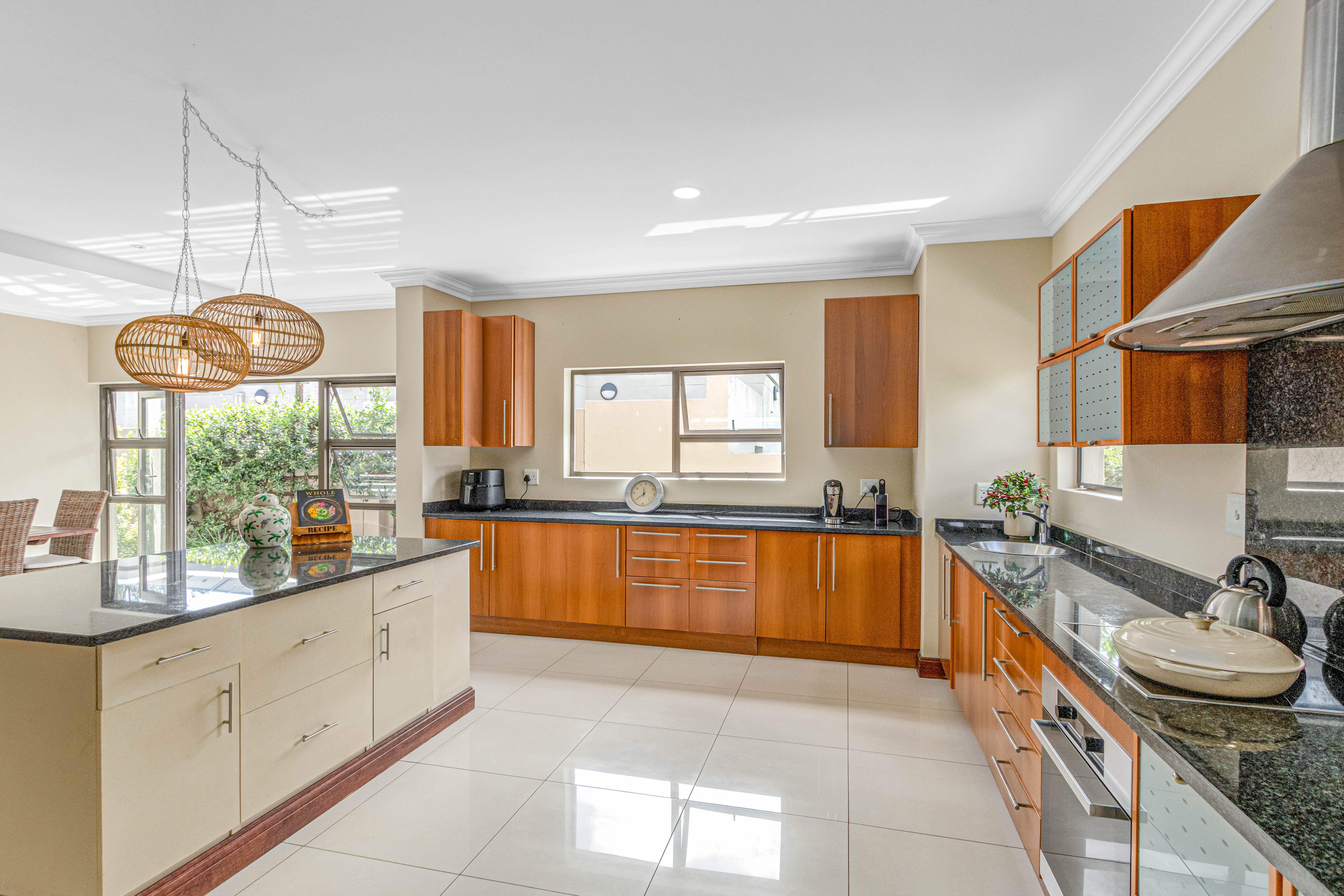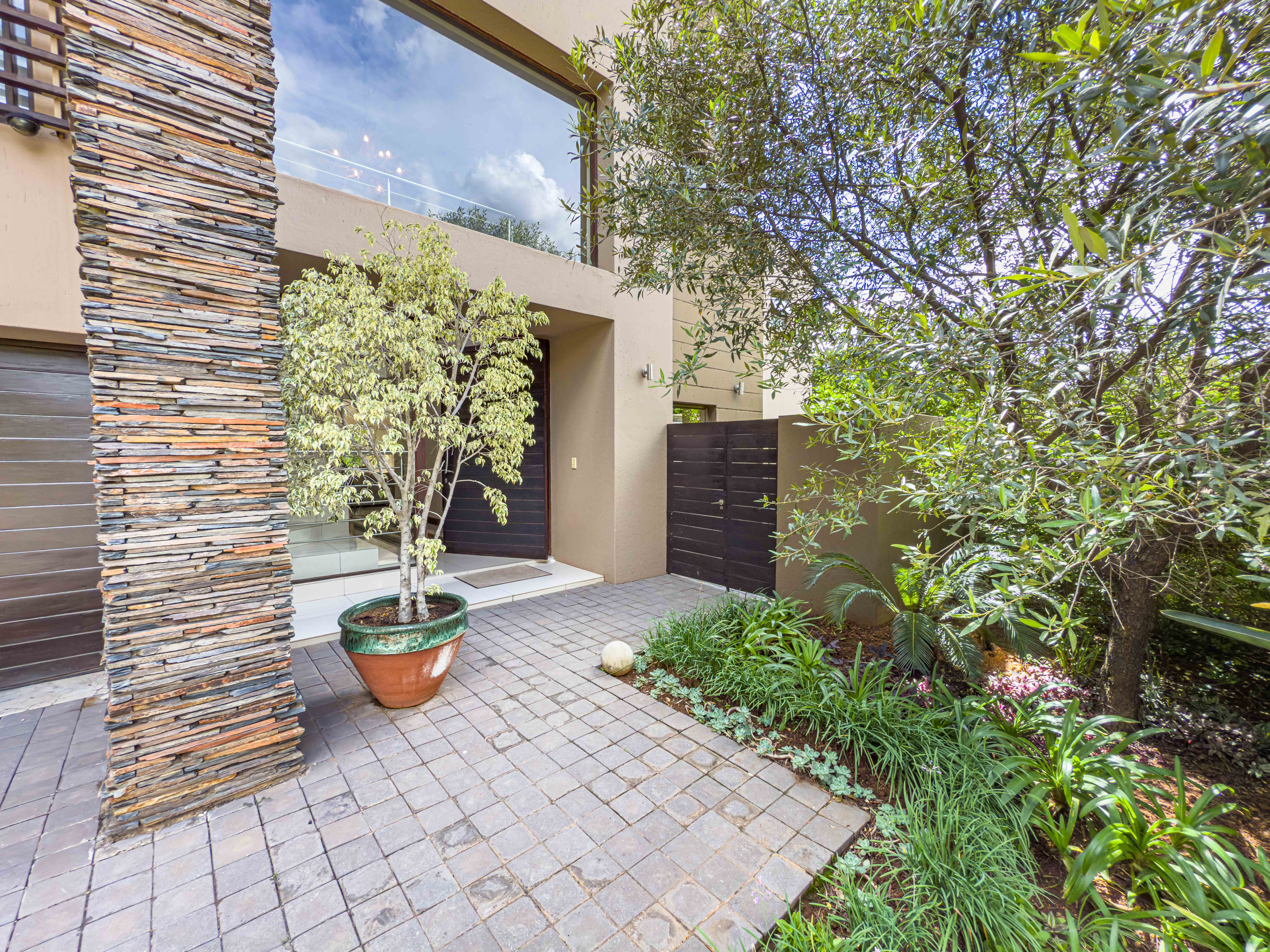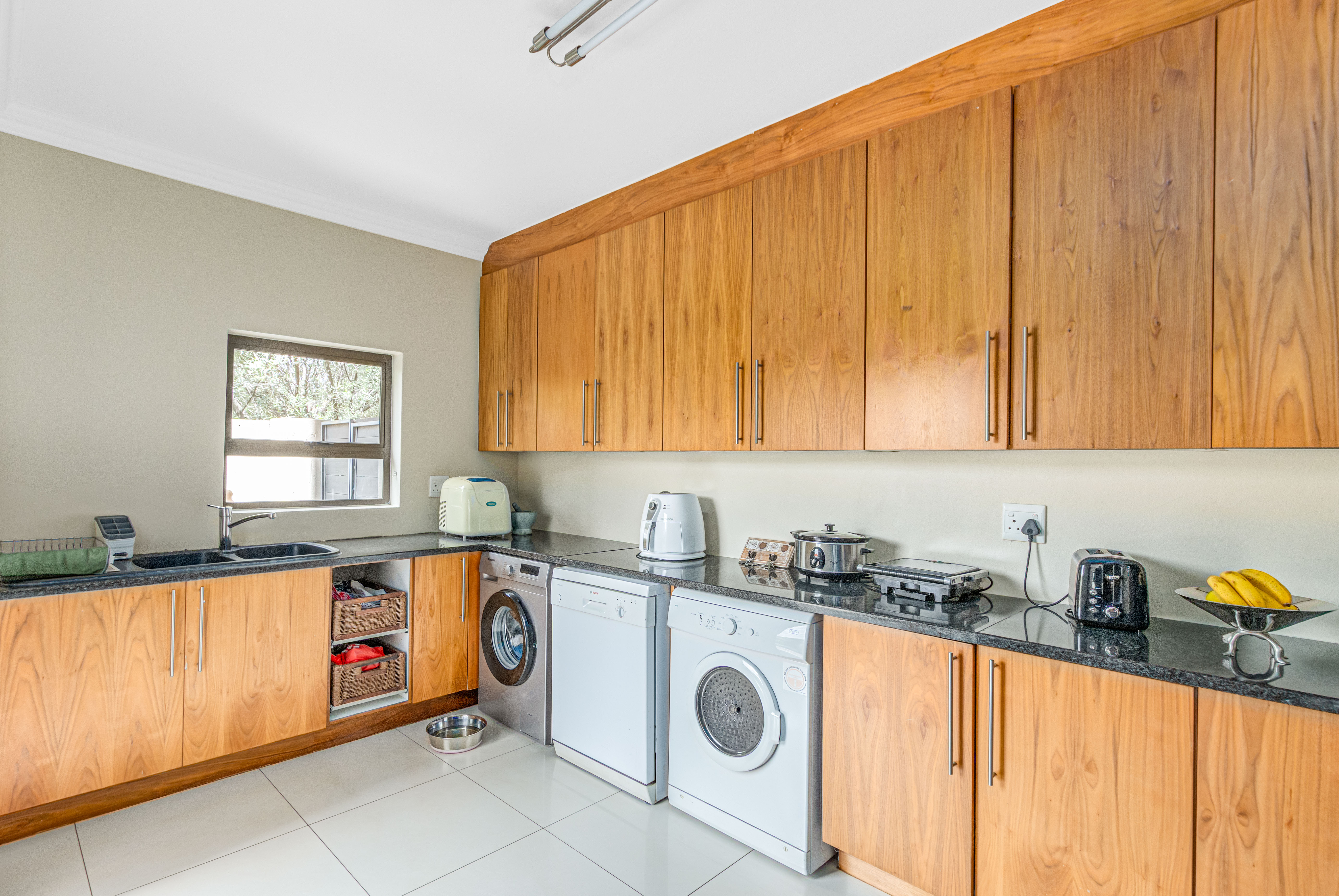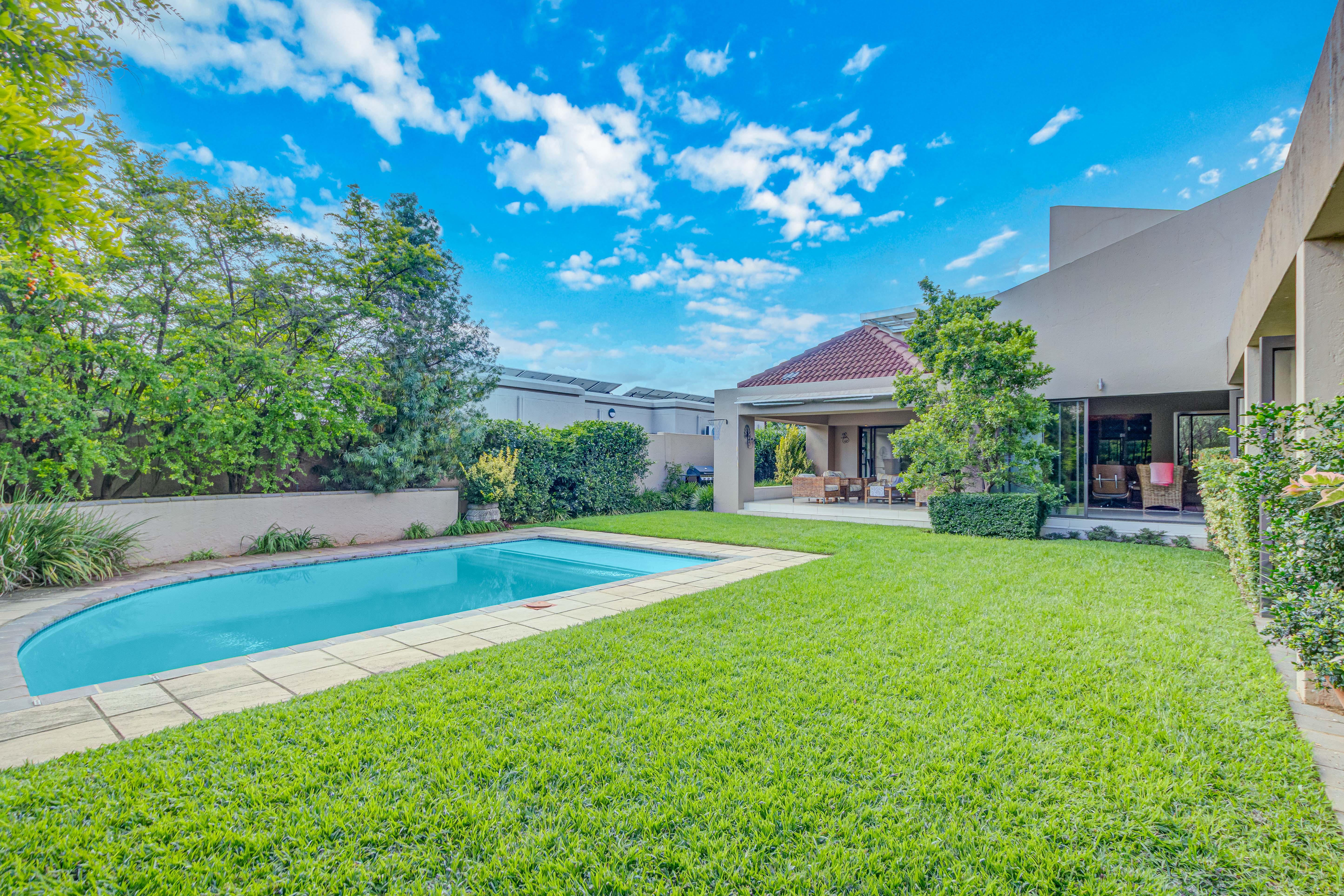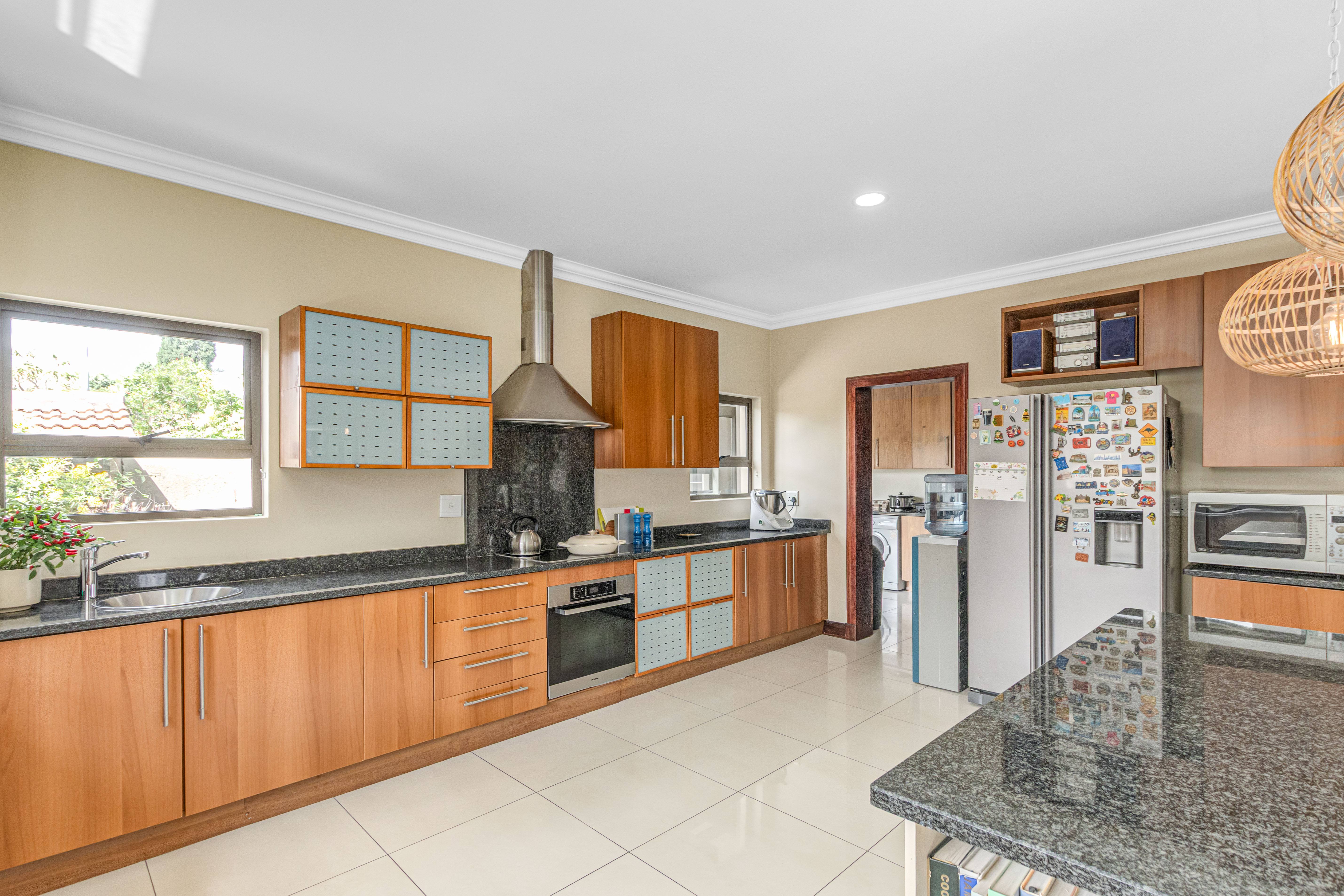 Key features: JOJO Water Tanks with pump, solar geyser, aircons, storeroom under staircase, outdoor shower in main bedroom + large wardrobe, well appointed guest toilet, the 3 bedrooms downstairs all open to the beautiful garden, wine cellar, miele electric stove/oven with extractor fan, granite countertops and prep bowl basin, spacious driveway with 3 garages, parking under cover for trailer, stainless steel balustrade, aluminium windows/doors, laminated flooring, tiled roof, linen BIC, outside courtyard with separate gate, upstairs west balcony with cover, staff accommodation, 3x geysers, wendy house, outside wash base, council approved plans in order, prepaid electricity.