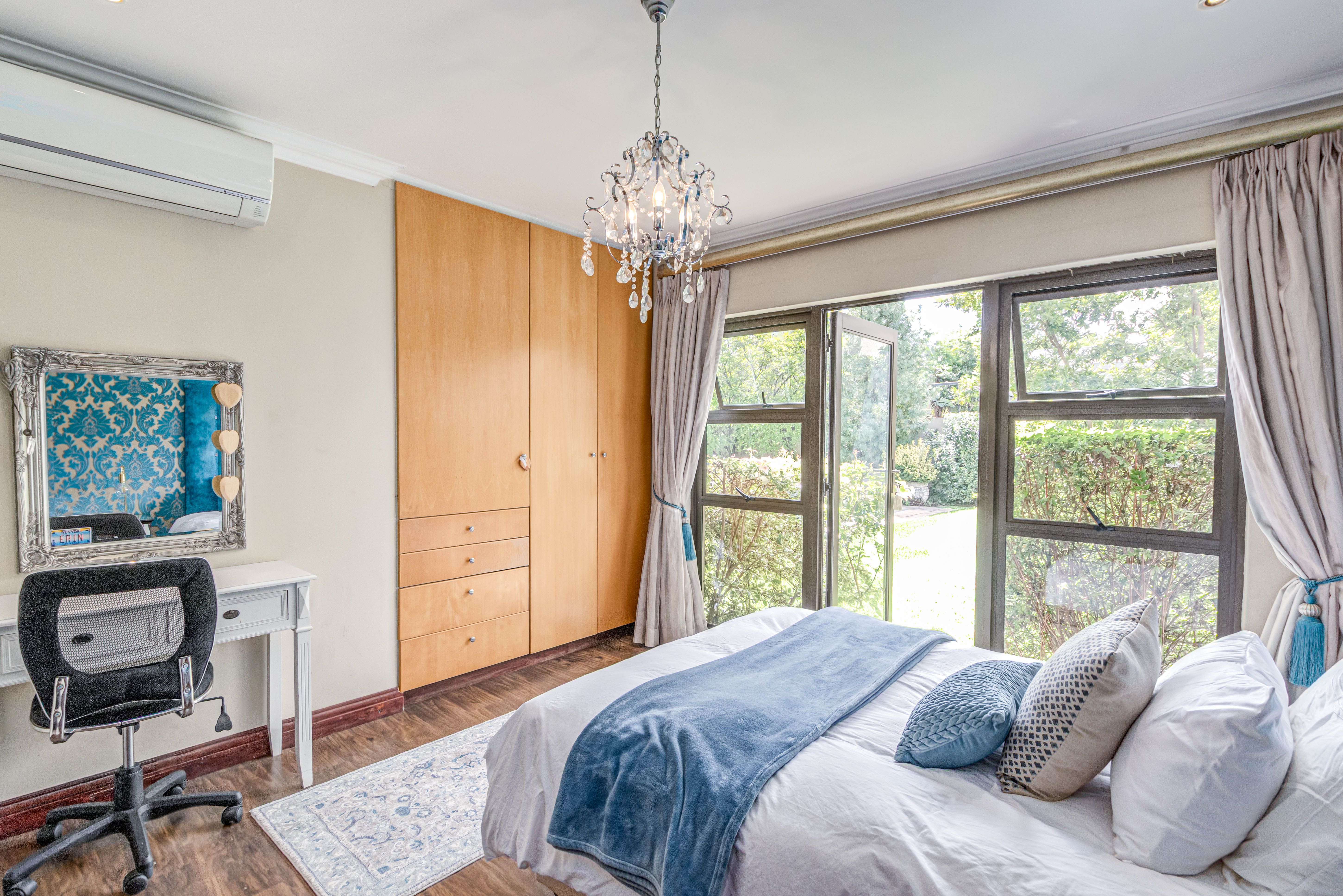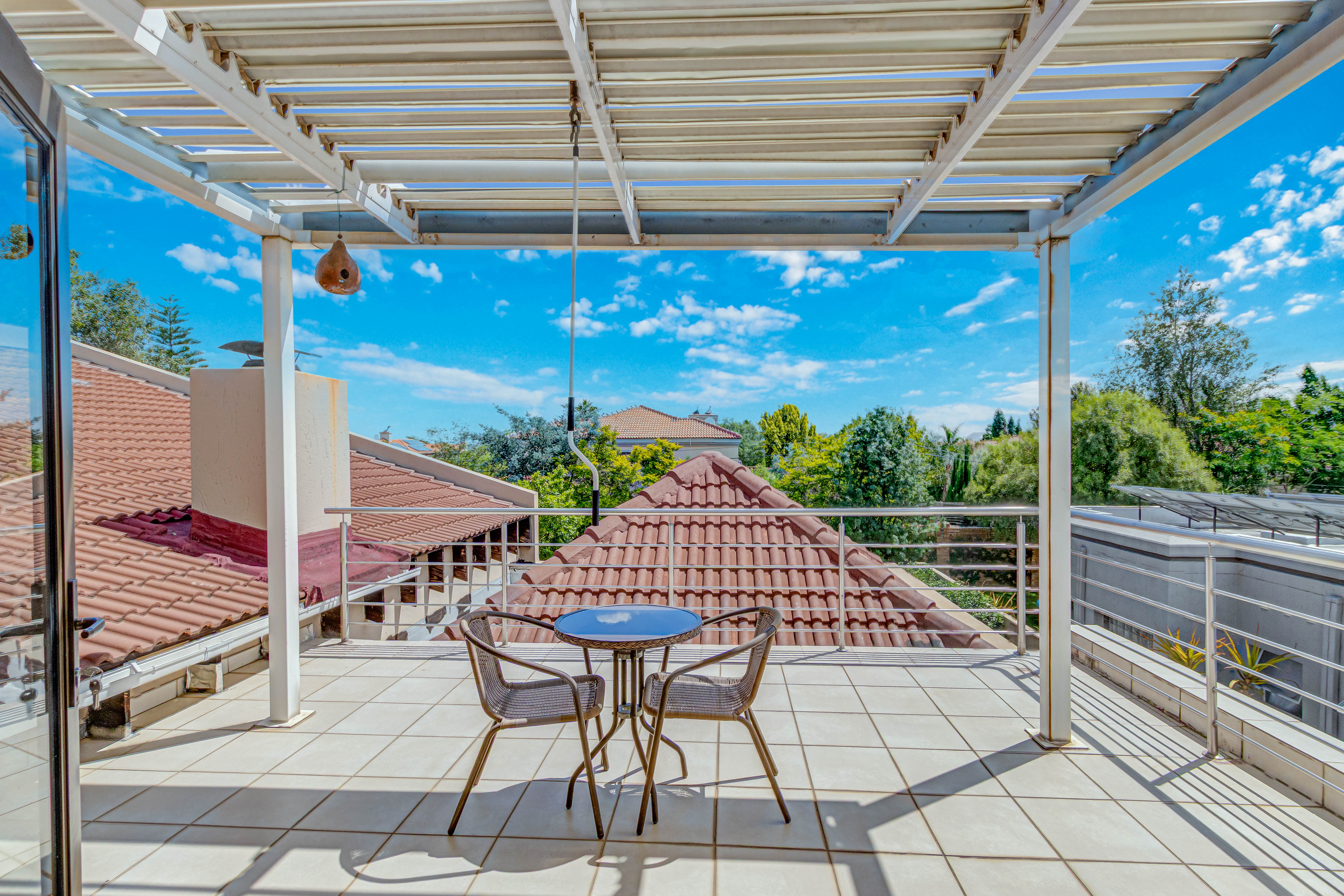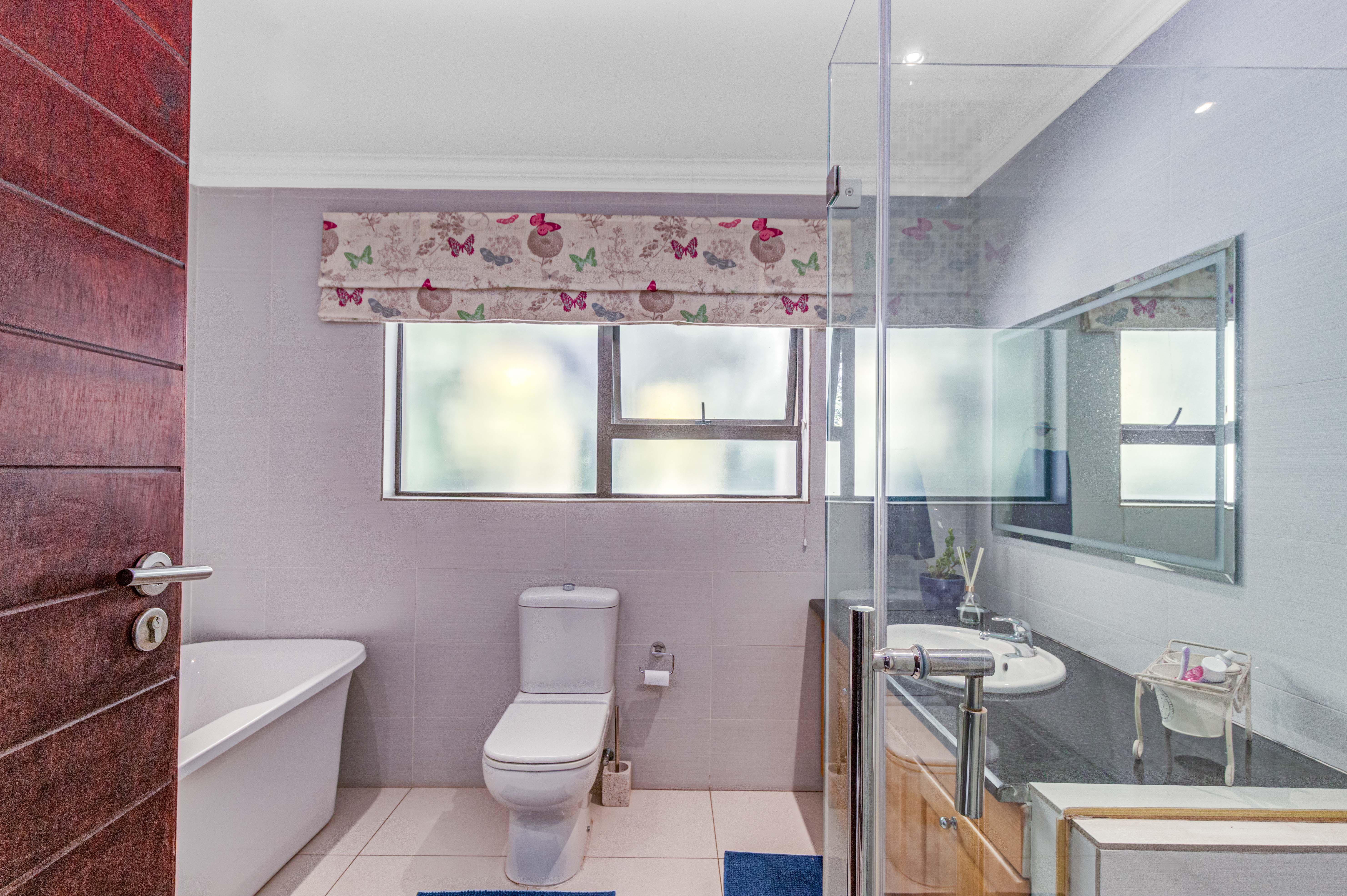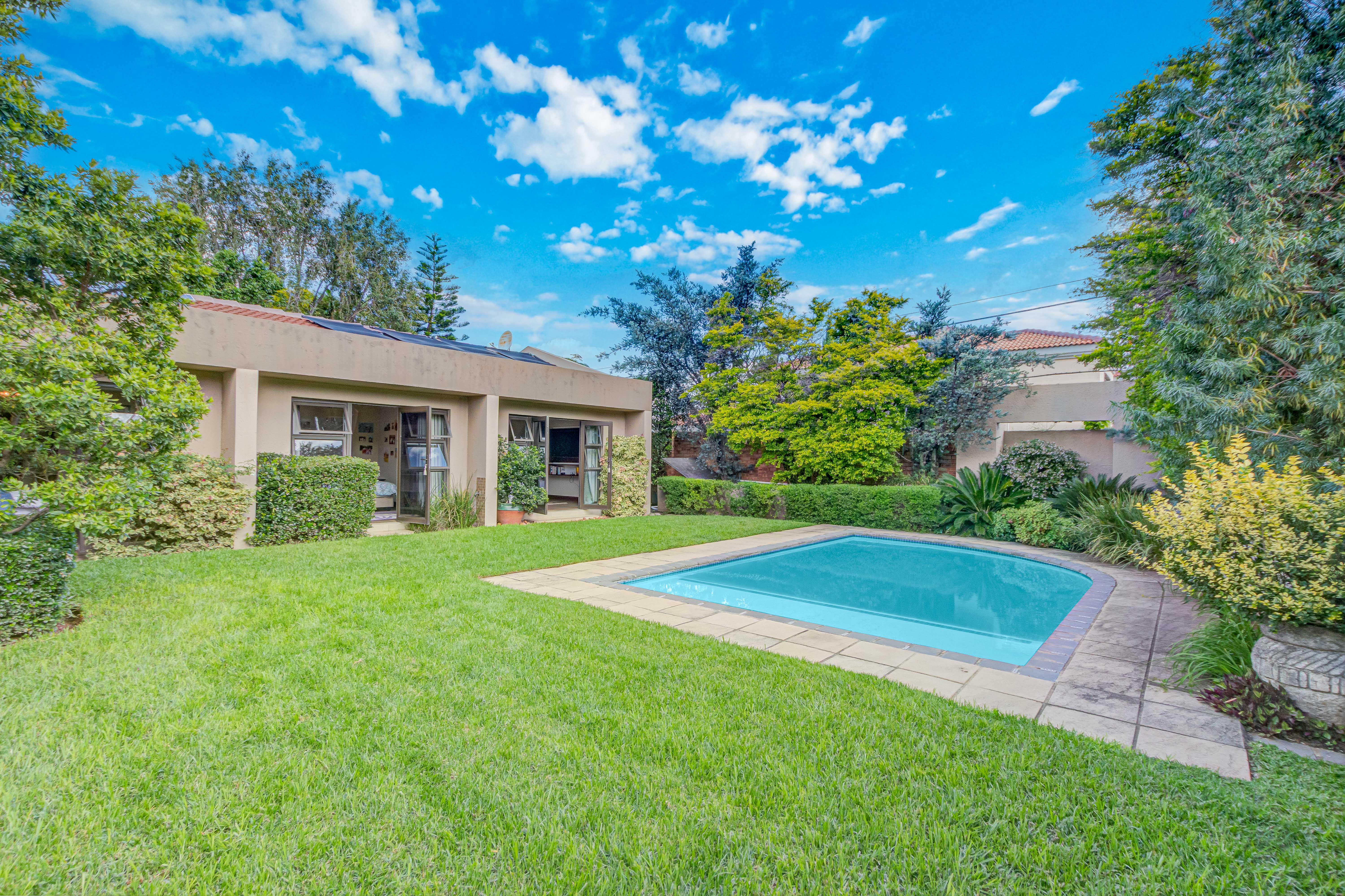 Key features: JOJO Water Tanks with pump, solar geyser, aircons, storeroom under staircase, outdoor shower in main bedroom + large wardrobe, well appointed guest toilet, the 3 bedrooms downstairs all open to the beautiful garden, wine cellar, miele electric stove/oven with extractor fan, granite countertops and prep bowl basin, spacious driveway with 3 garages, parking under cover for trailer, stainless steel balustrade, aluminium windows/doors, laminated flooring, tiled roof, linen BIC, outside courtyard with separate gate, upstairs west balcony with cover, staff accommodation, 3x geysers, wendy house, outside wash base, council approved plans in order, prepaid electricity.