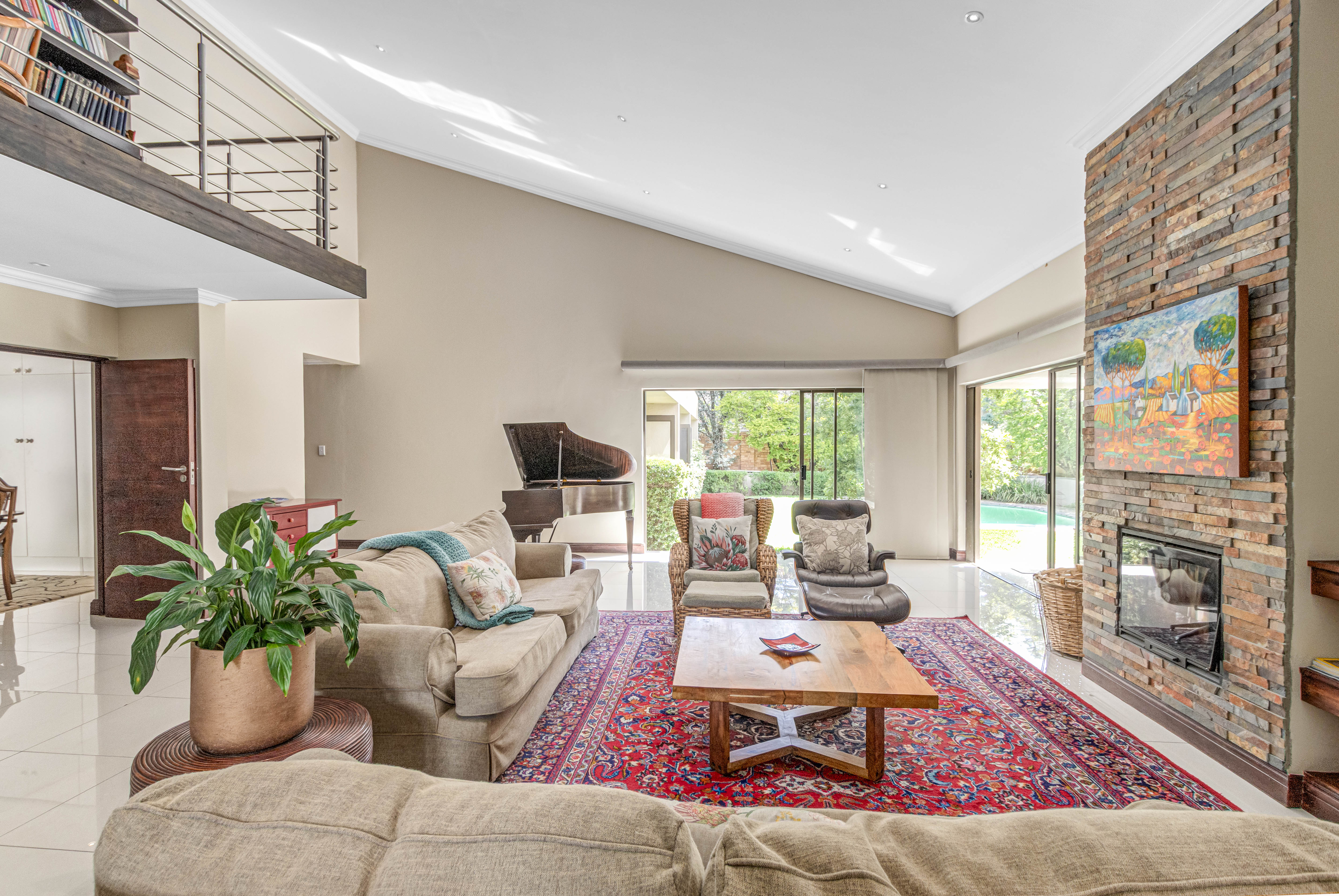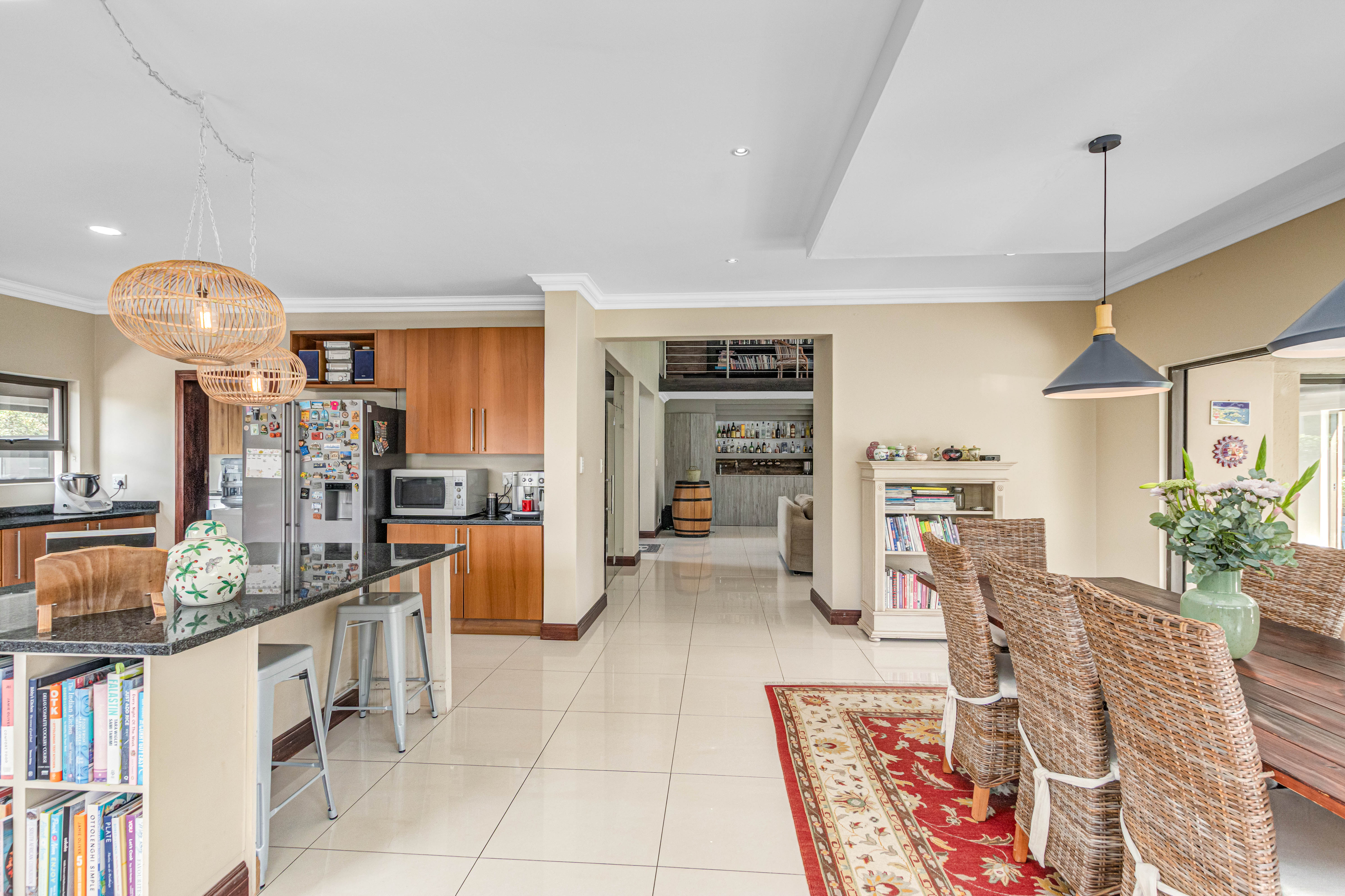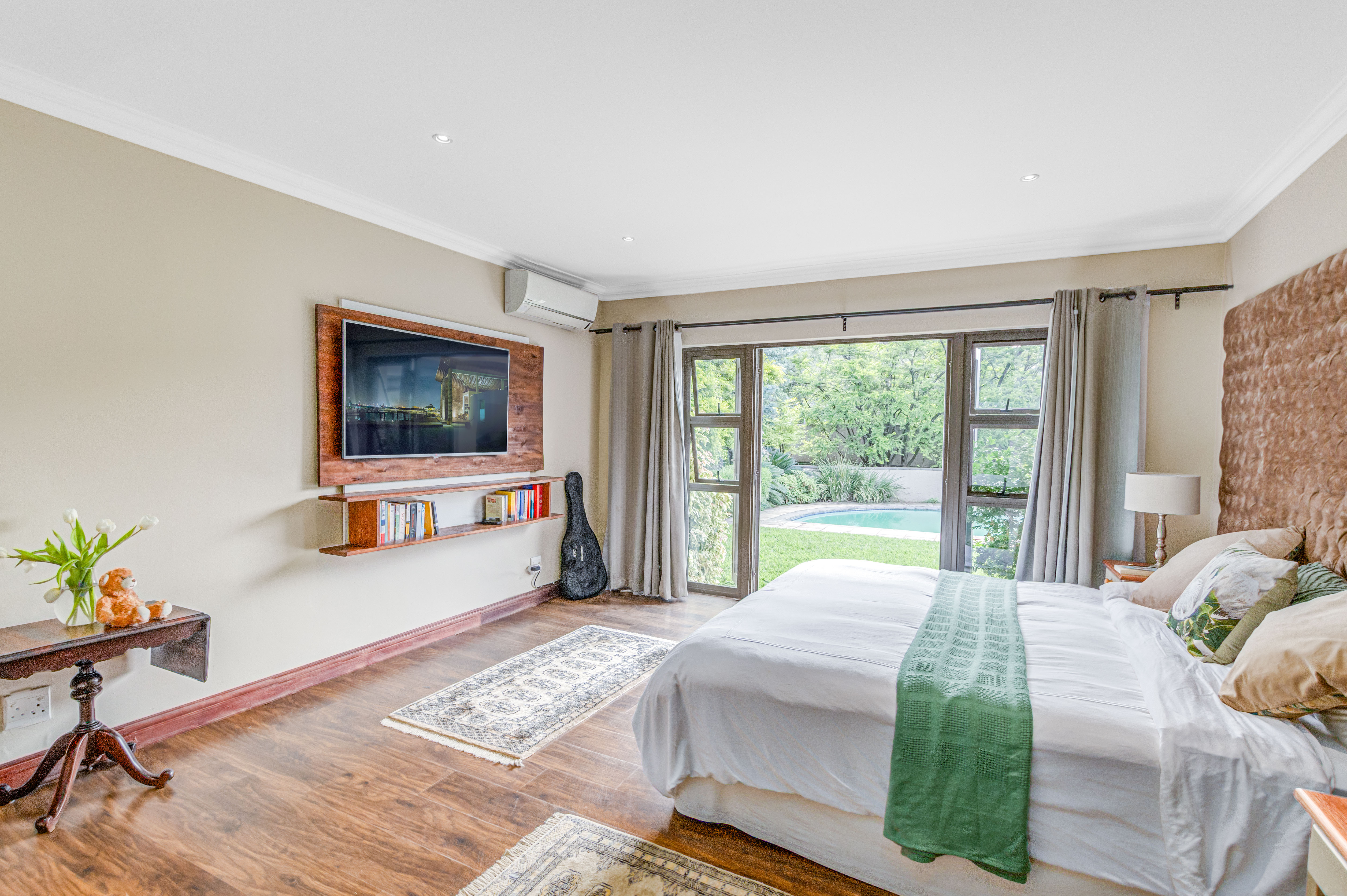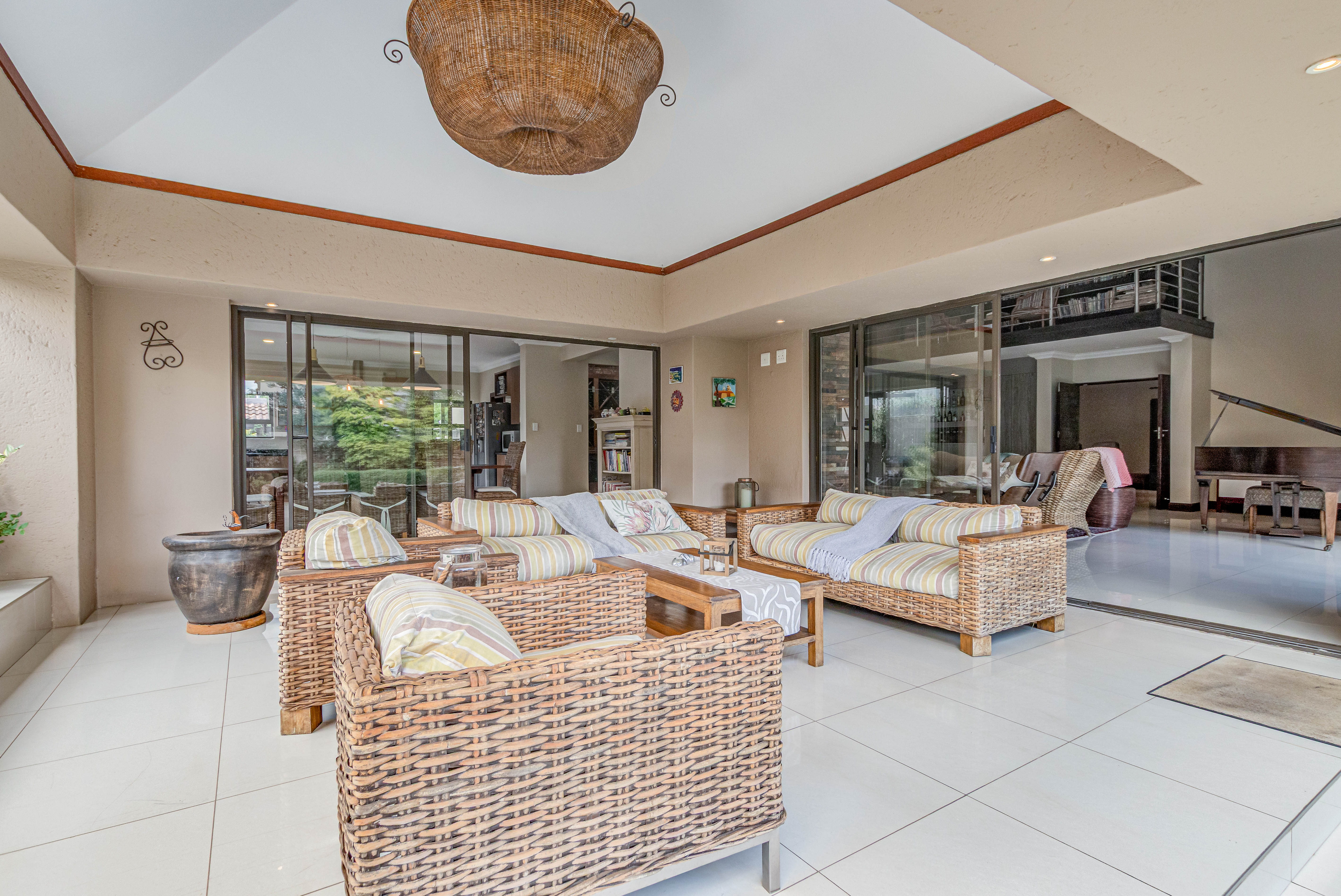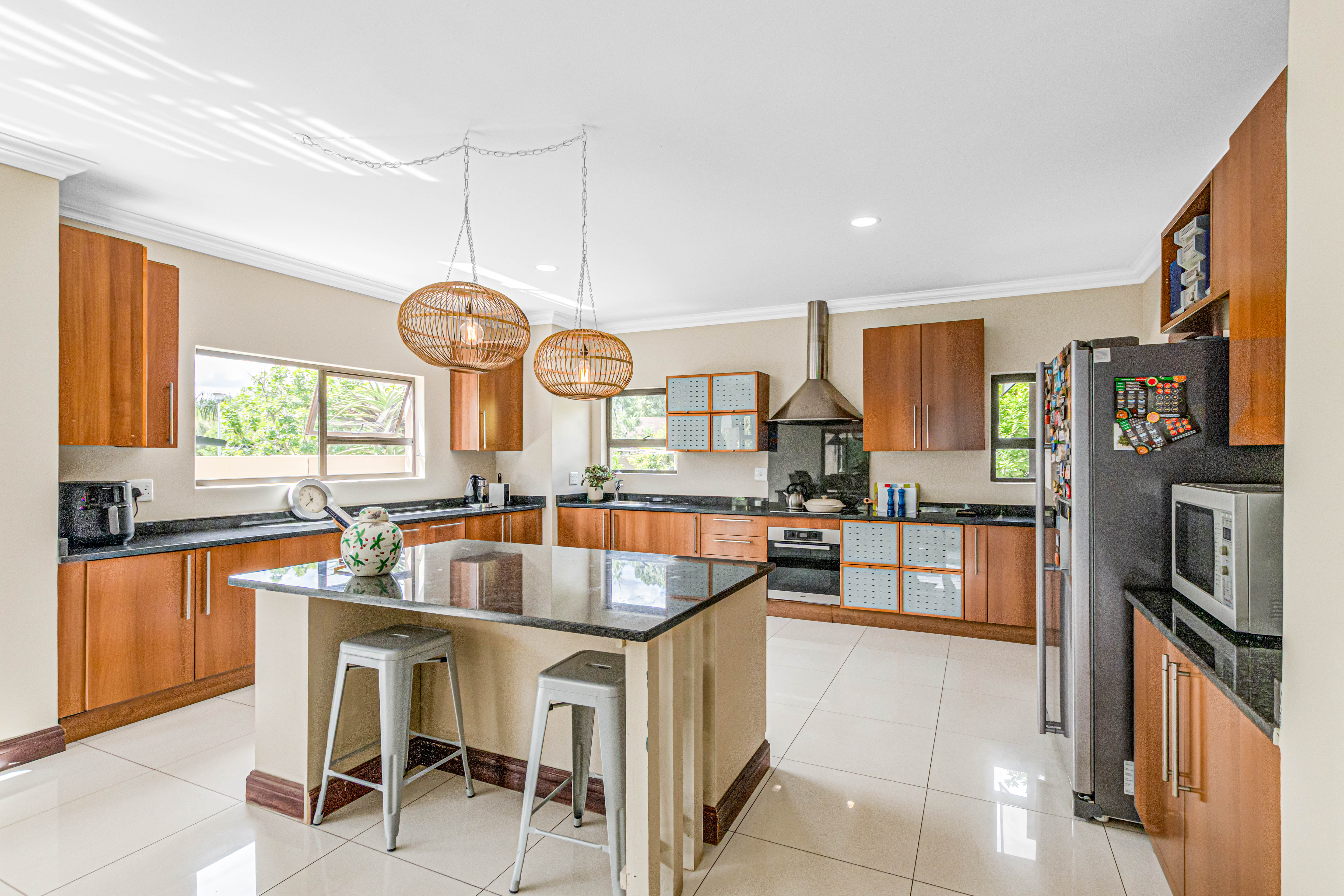 Key features: JOJO Water Tanks with pump, solar geyser, aircons, storeroom under staircase, outdoor shower in main bedroom + large wardrobe, well appointed guest toilet, the 3 bedrooms downstairs all open to the beautiful garden, wine cellar, miele electric stove/oven with extractor fan, granite countertops and prep bowl basin, spacious driveway with 3 garages, parking under cover for trailer, stainless steel balustrade, aluminium windows/doors, laminated flooring, tiled roof, linen BIC, outside courtyard with separate gate, upstairs west balcony with cover, staff accommodation, 3x geysers, wendy house, outside wash base, council approved plans in order, prepaid electricity.