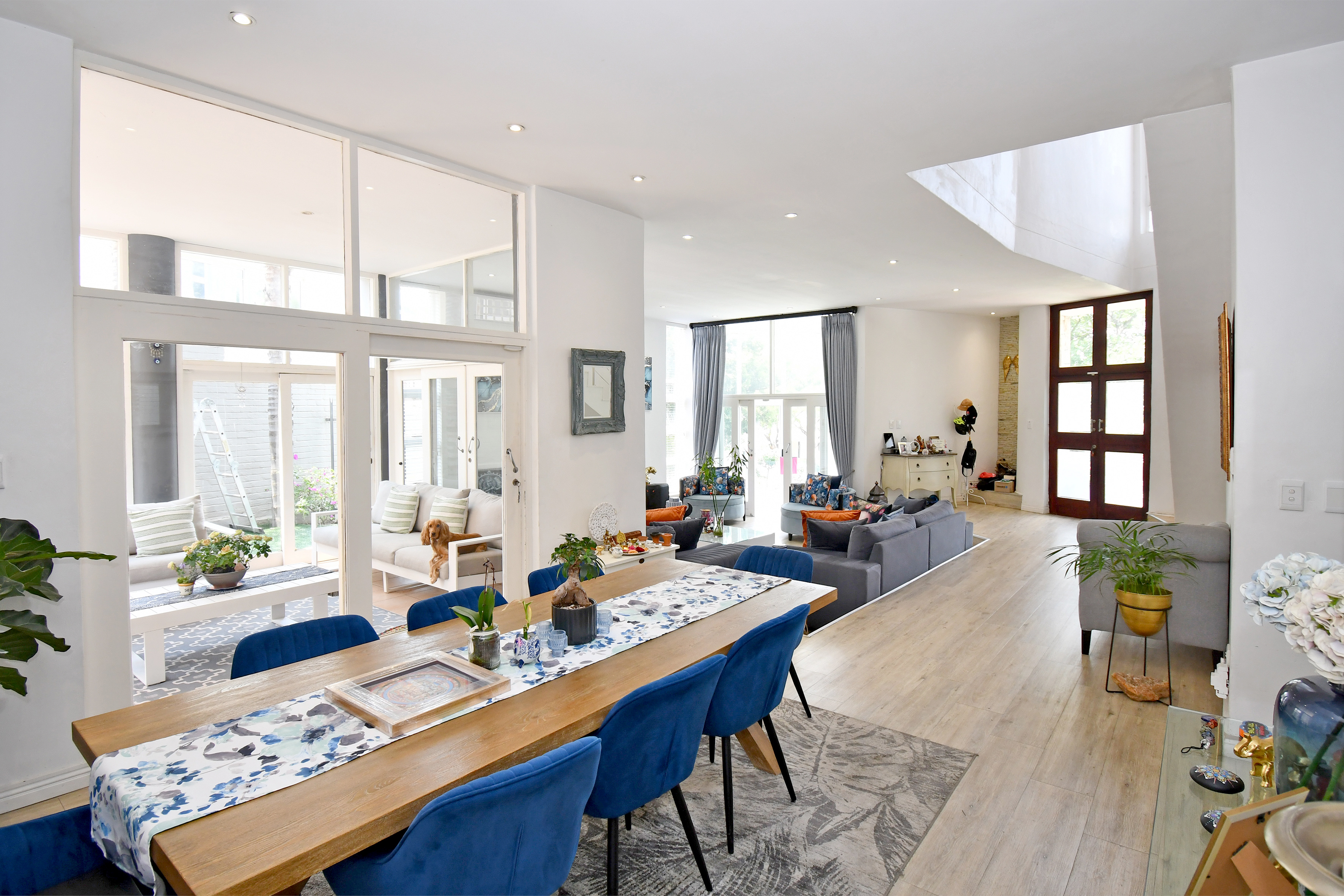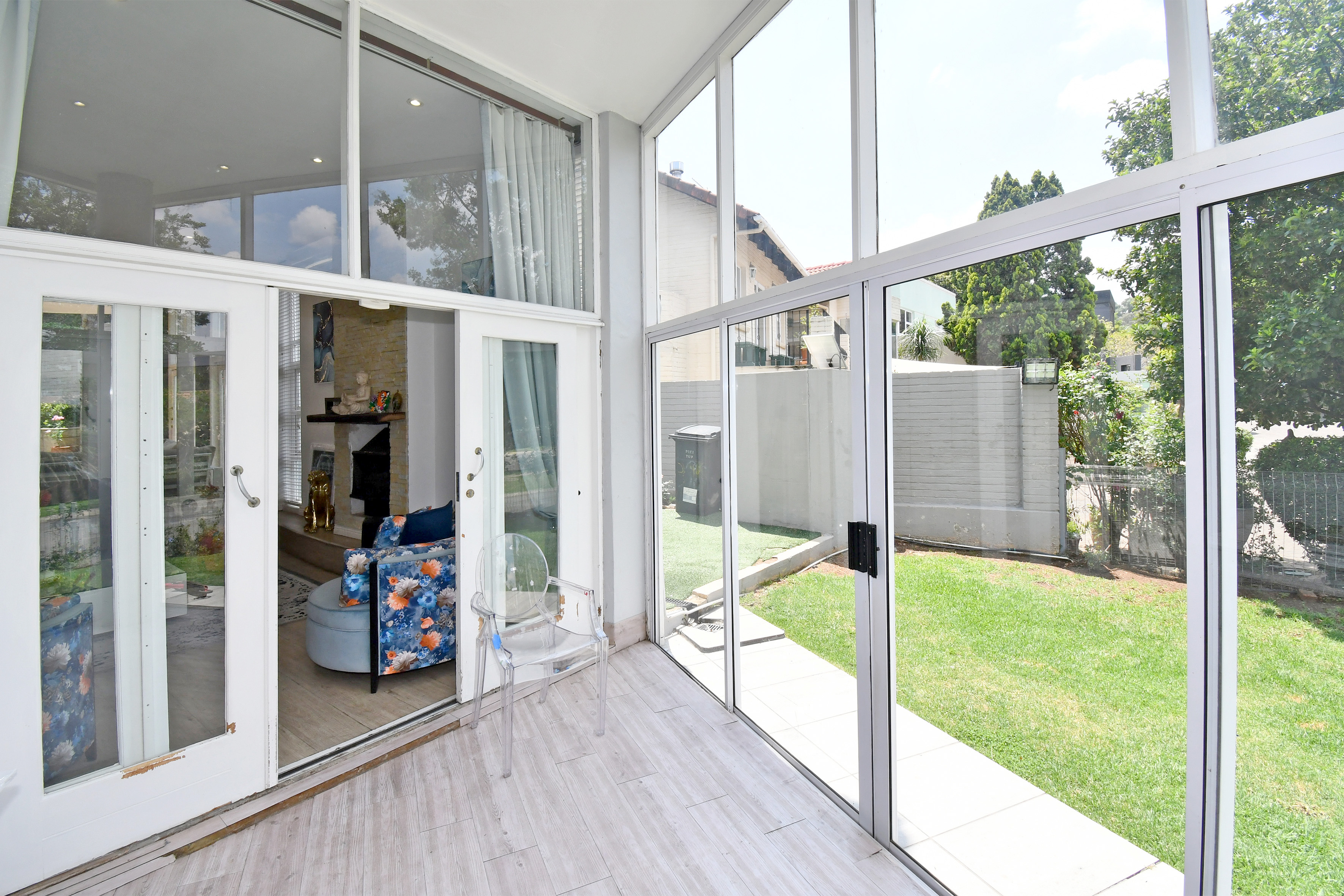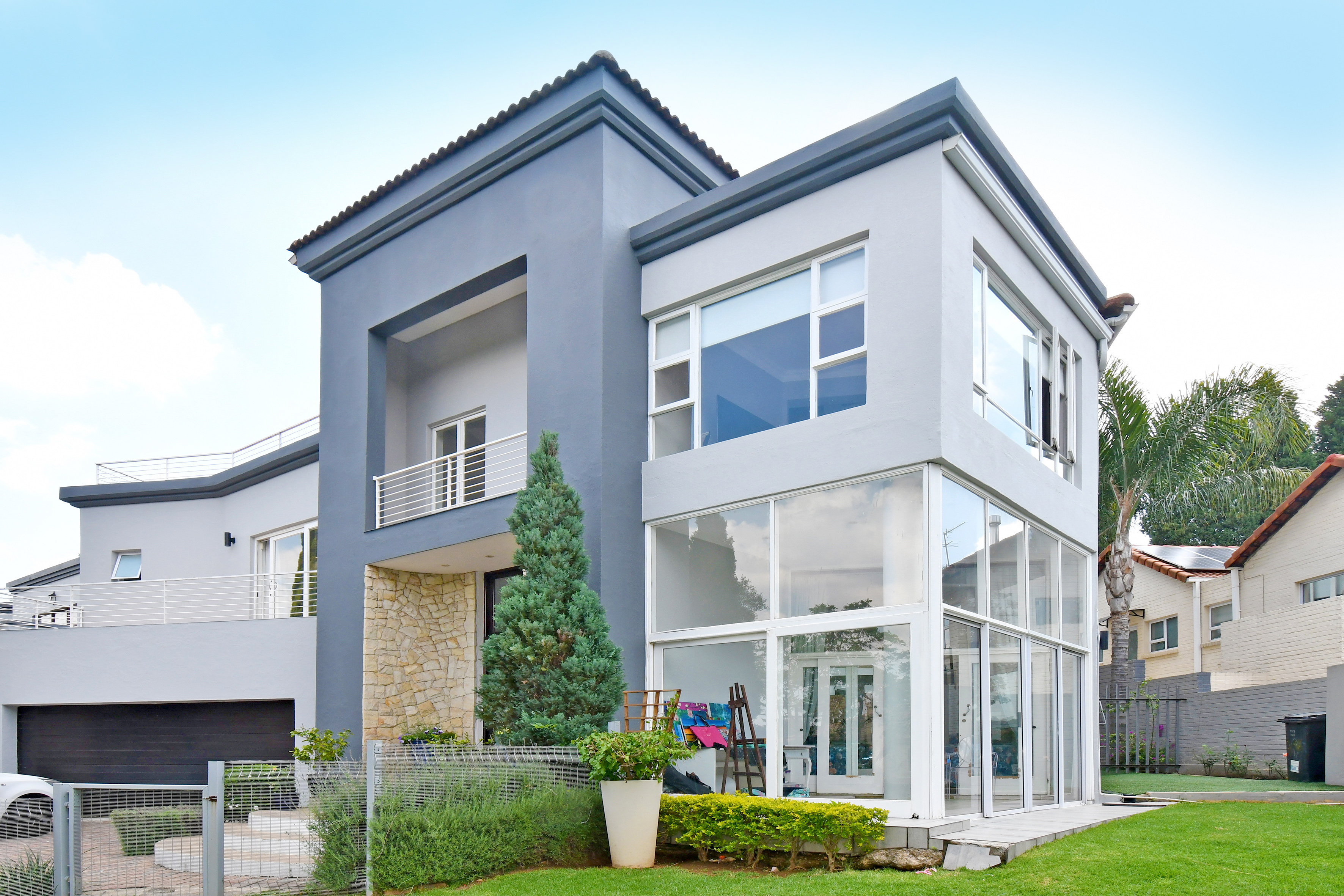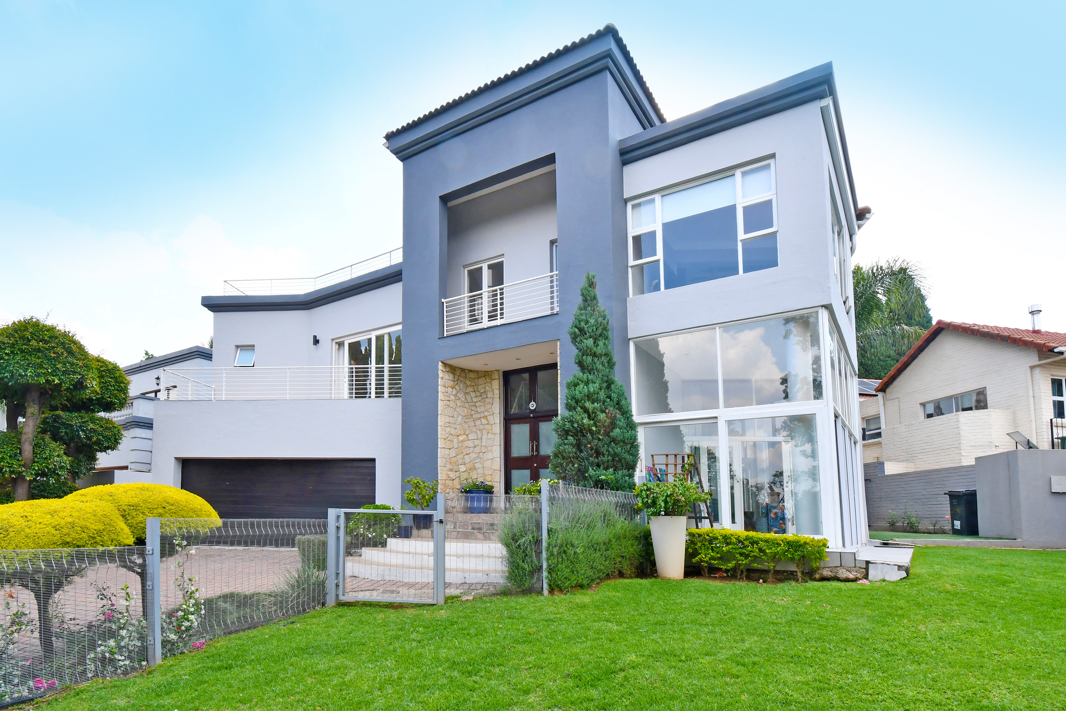 Upstairs is enveloped with light and comfort with 4 deluxe-size bedrooms and 3 bathrooms (2 en suite) as well as a third-story viewing balcony with 360-degree views of Johannesburg - sip on a cocktail while you watch the sunset! The grand master suite is complete with a large walk-in closet, dressing room, space for a private lounge and newly renovated en suite bathroom.