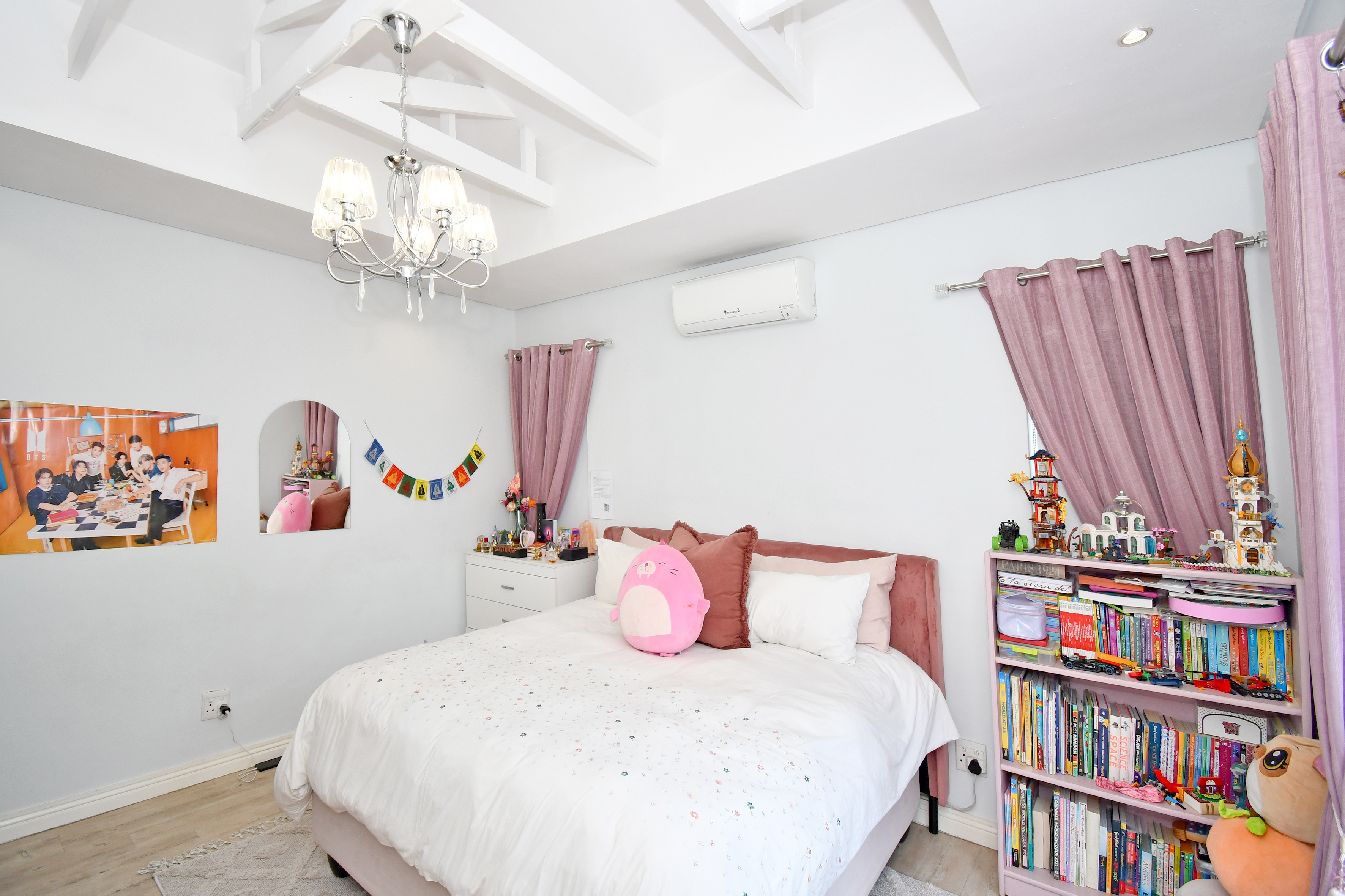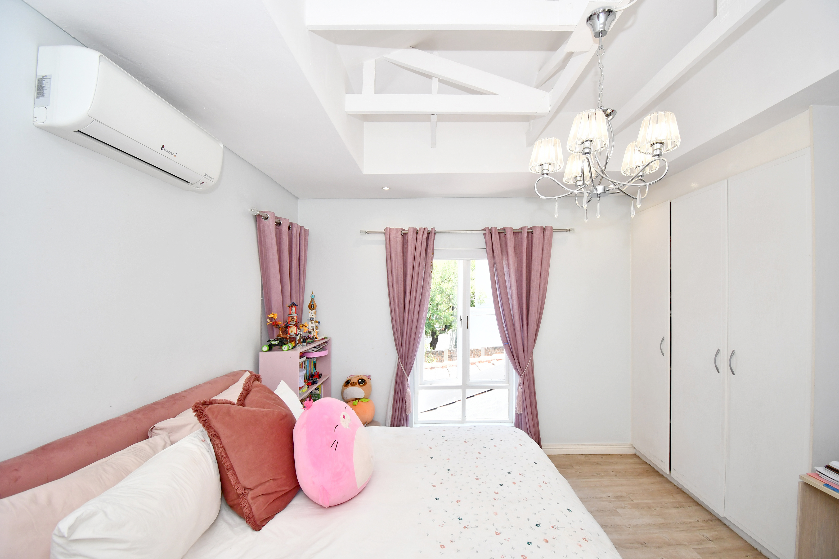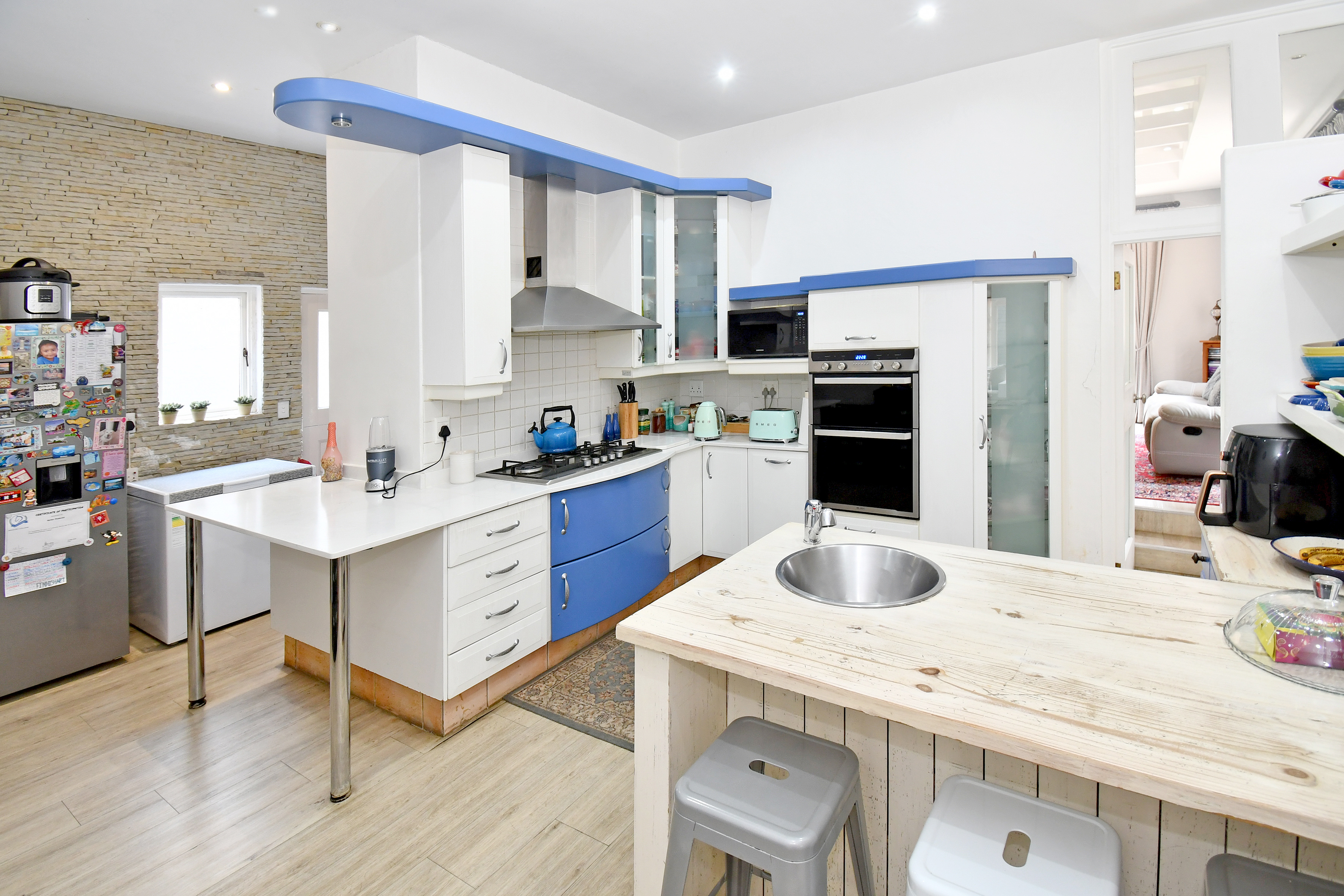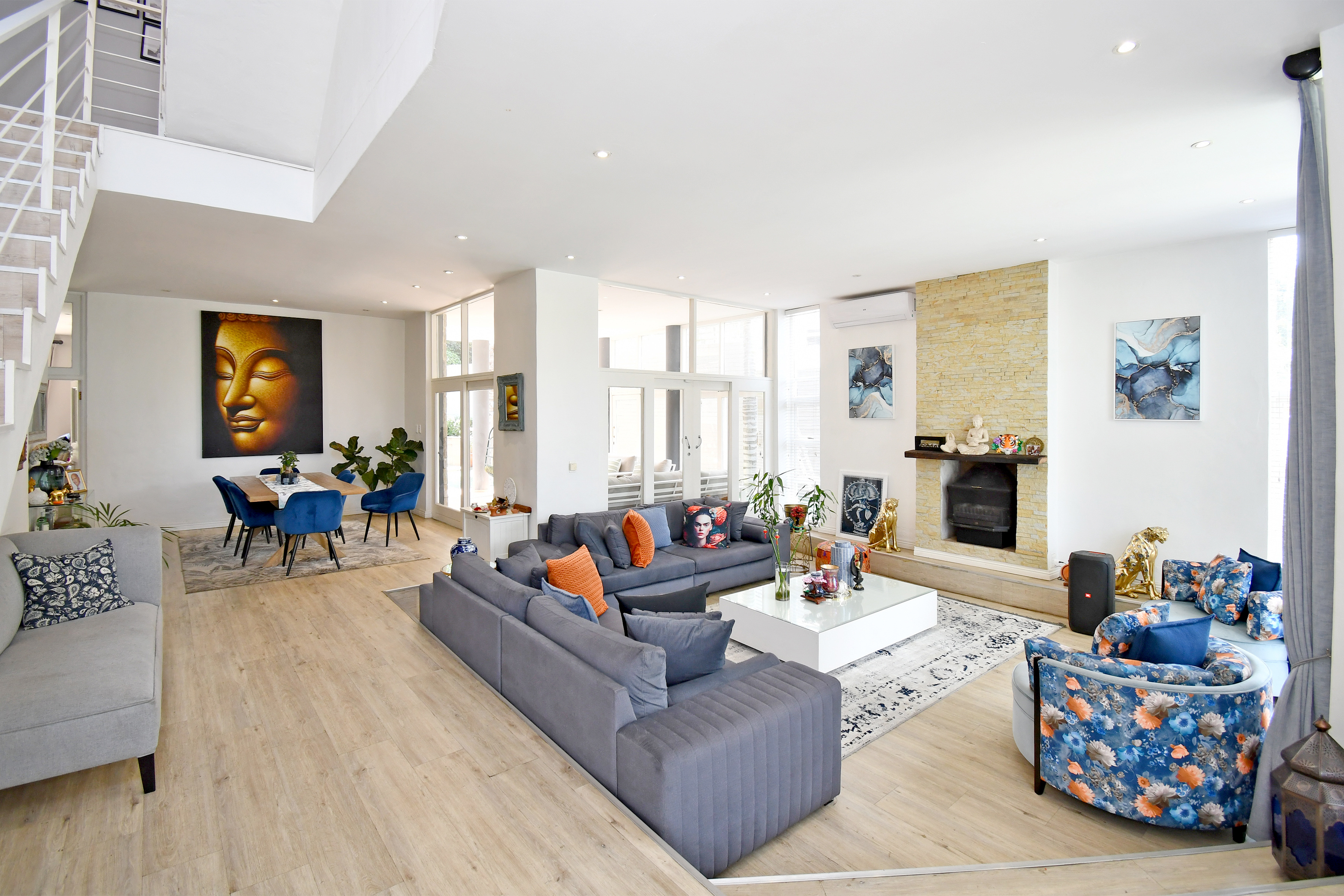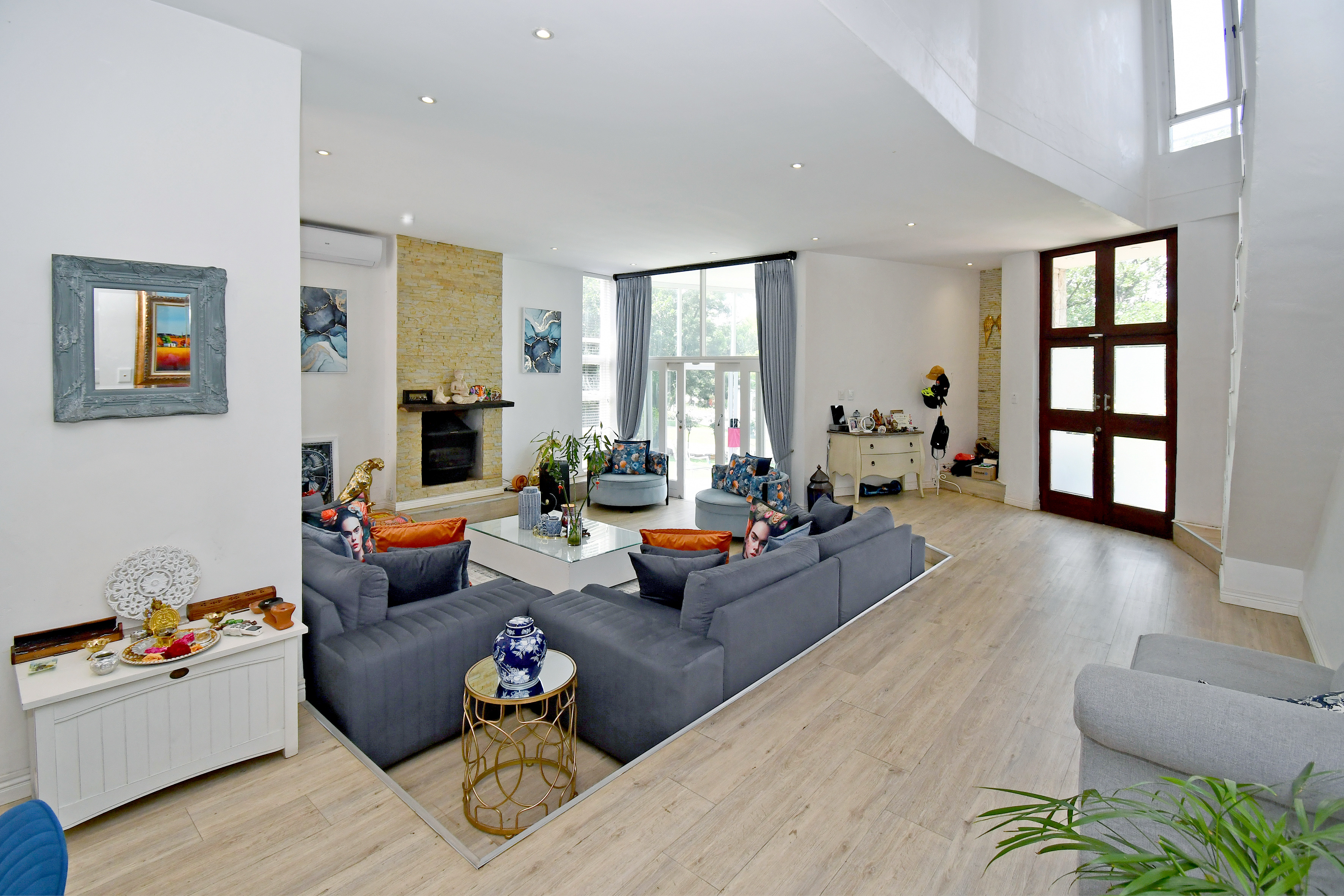Easy living in this generously proportioned contemporary residence. Downstairs is host to crisp white walls, wood-look floors and high double volume ceilings creating an airy and open feel. Open plan reception area with sunken lounge with cosy wood burner and aircon unit and kitchen and dining all opening out to the patio, garden, pool and jacuzzi. The separate TV lounge or family room also opens out to the garden area. Divine Kitchen offers a gas hob, space for a double door fridge, a walk-in pantry and a separate scullery.